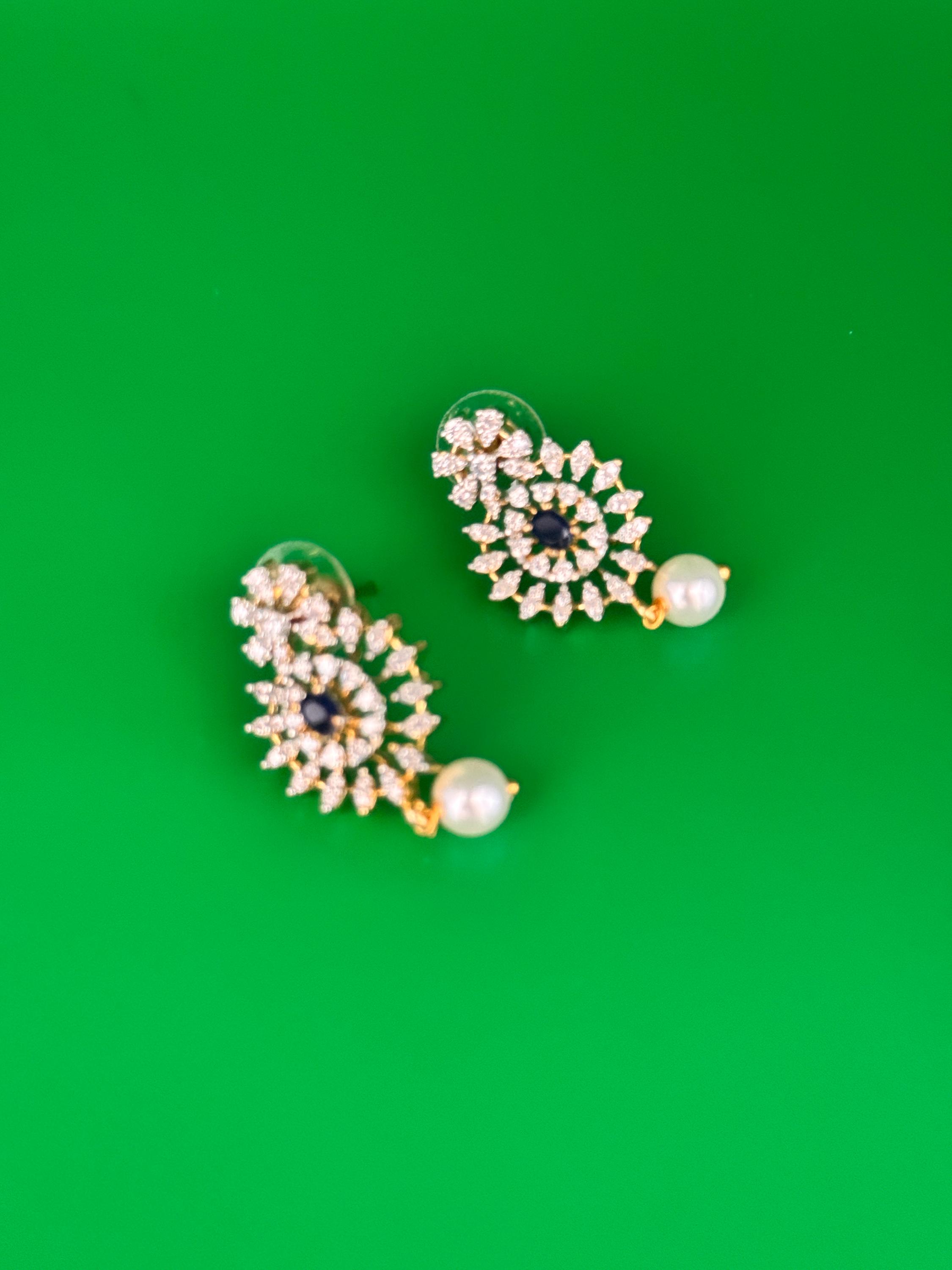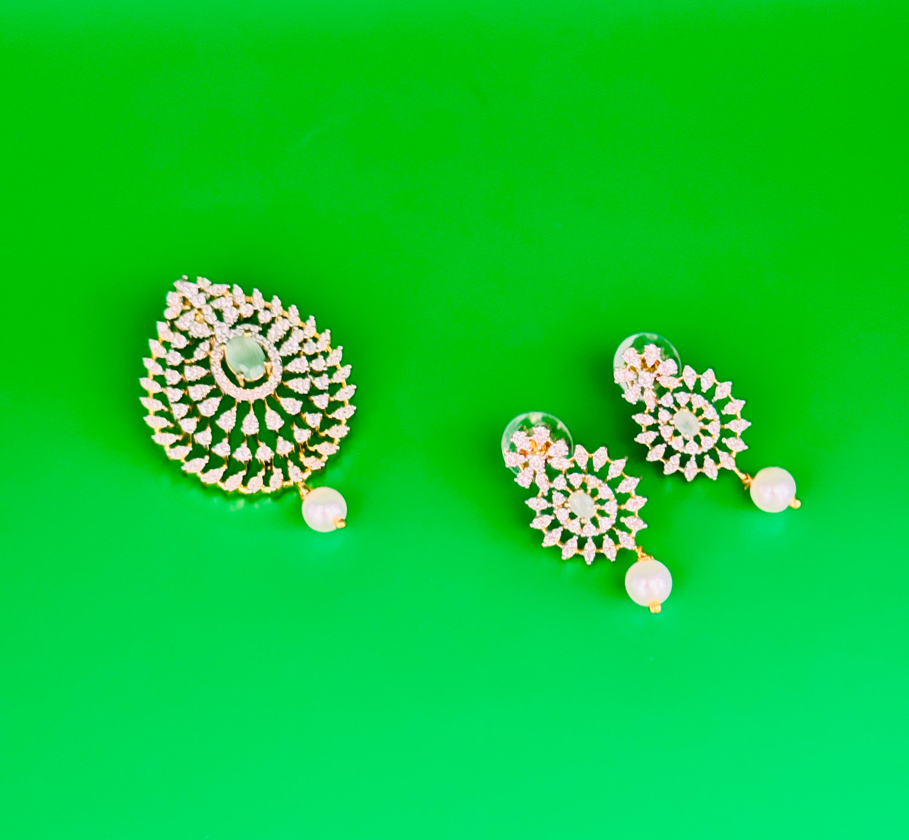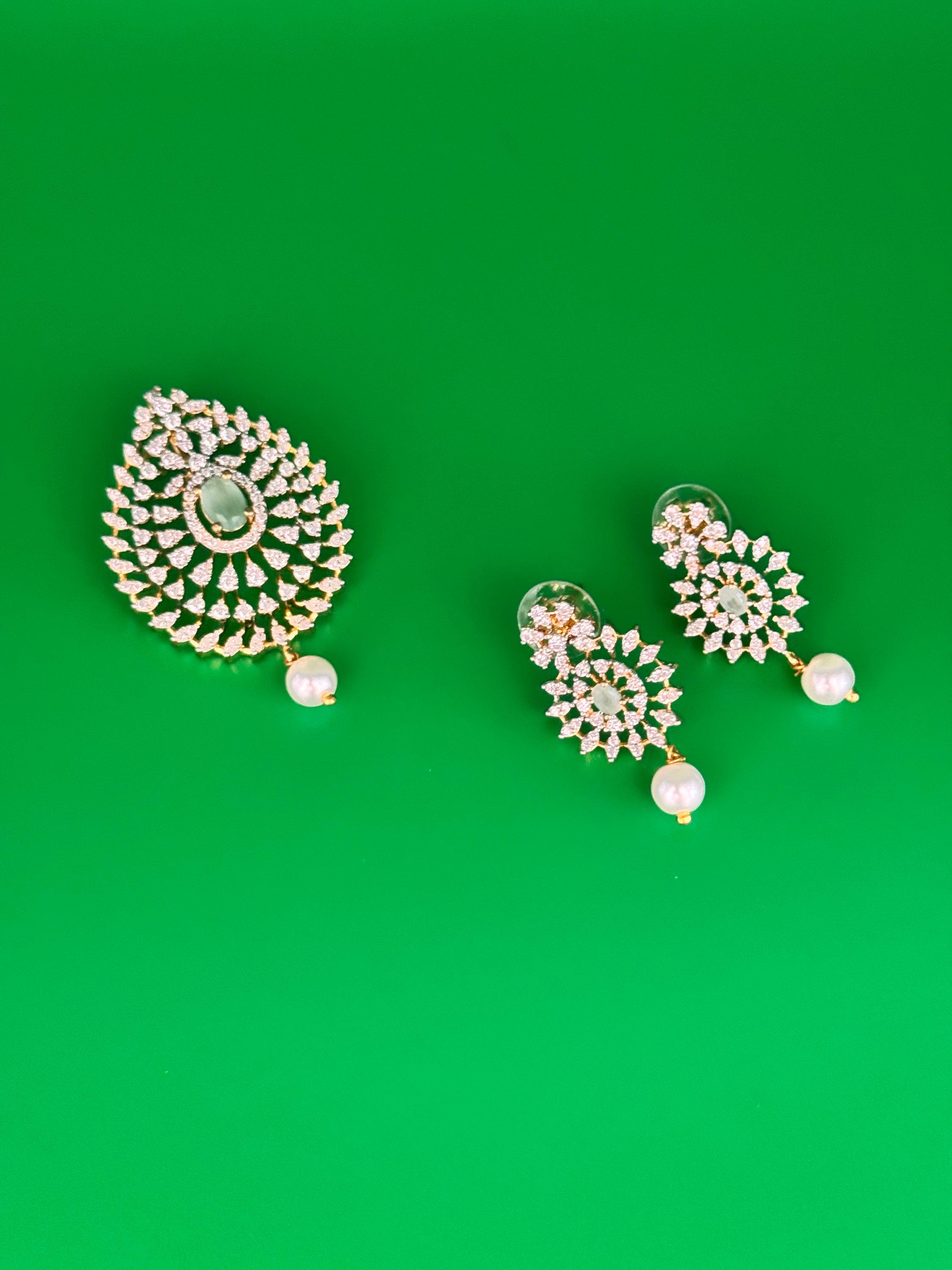 Elegant pendant and earrings set in premium American Diamond. Available in mint green and dark blue options.