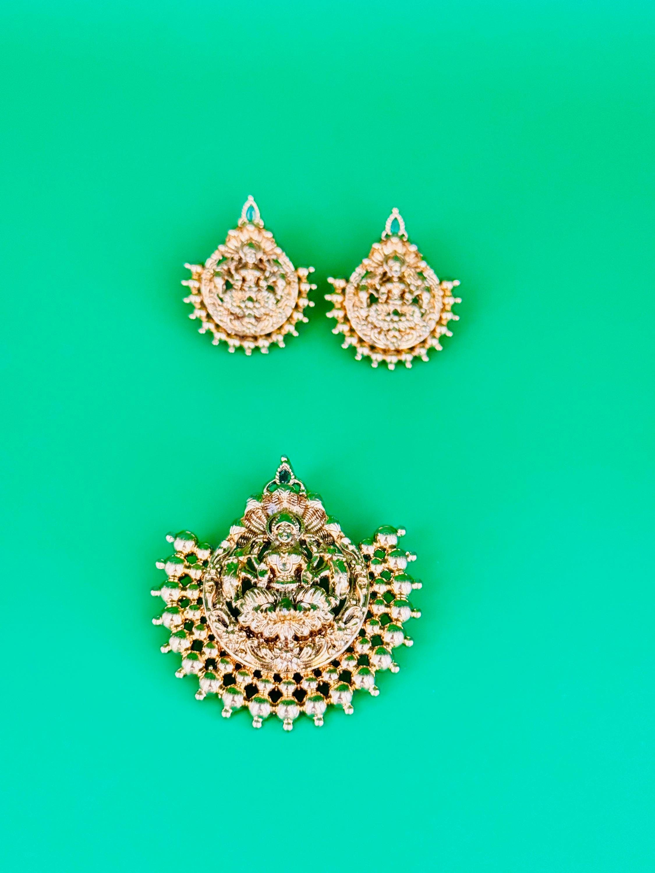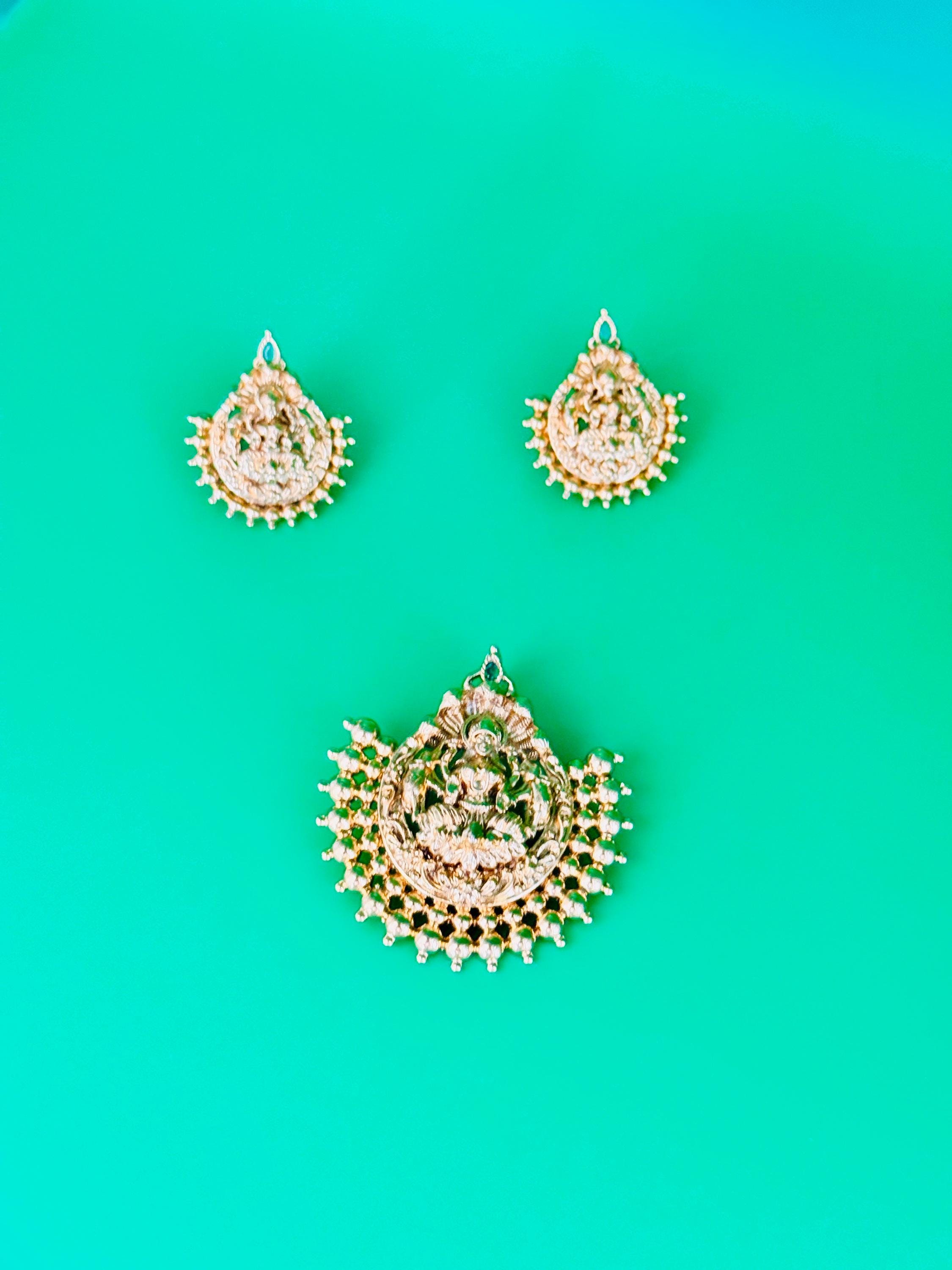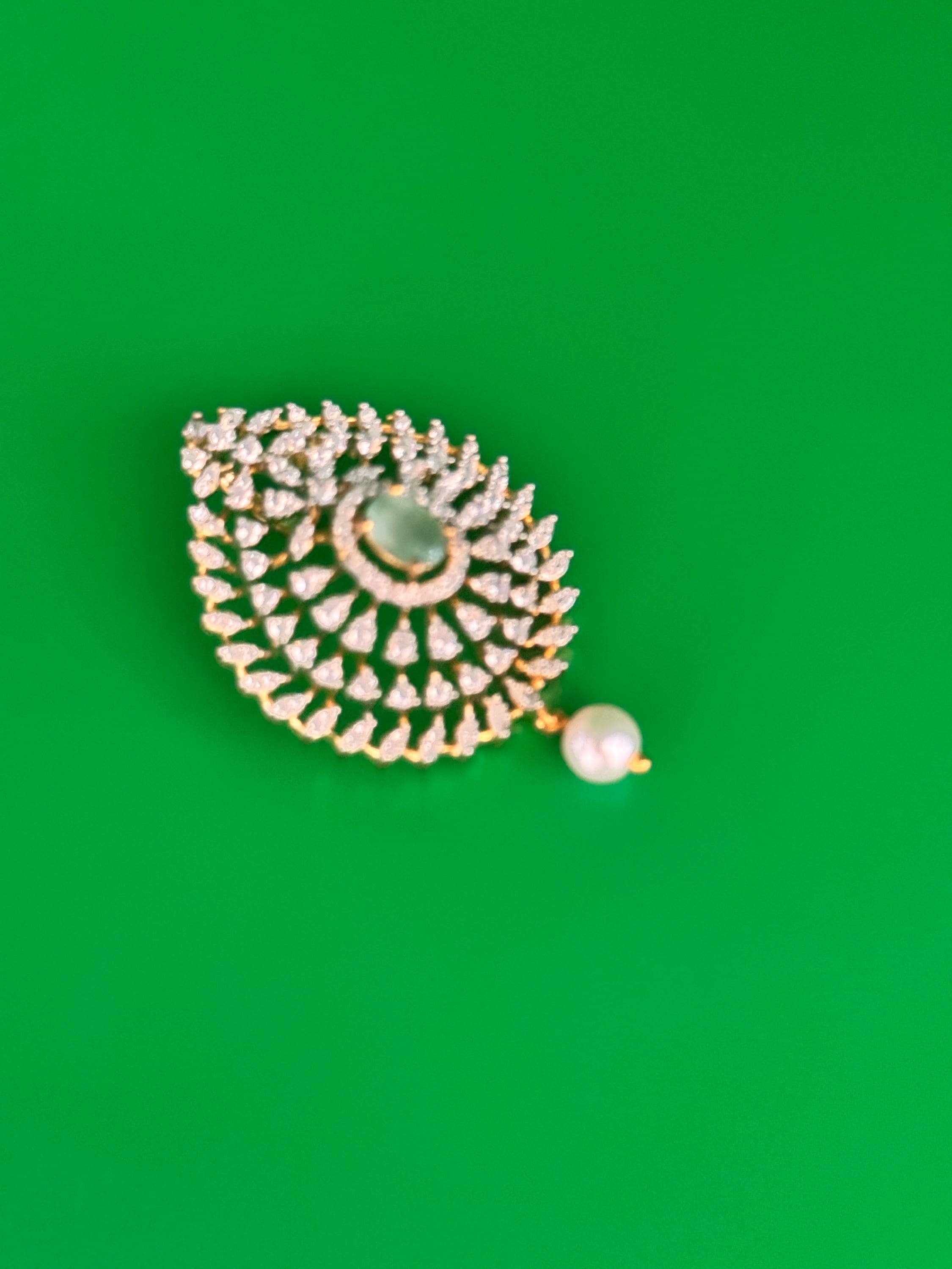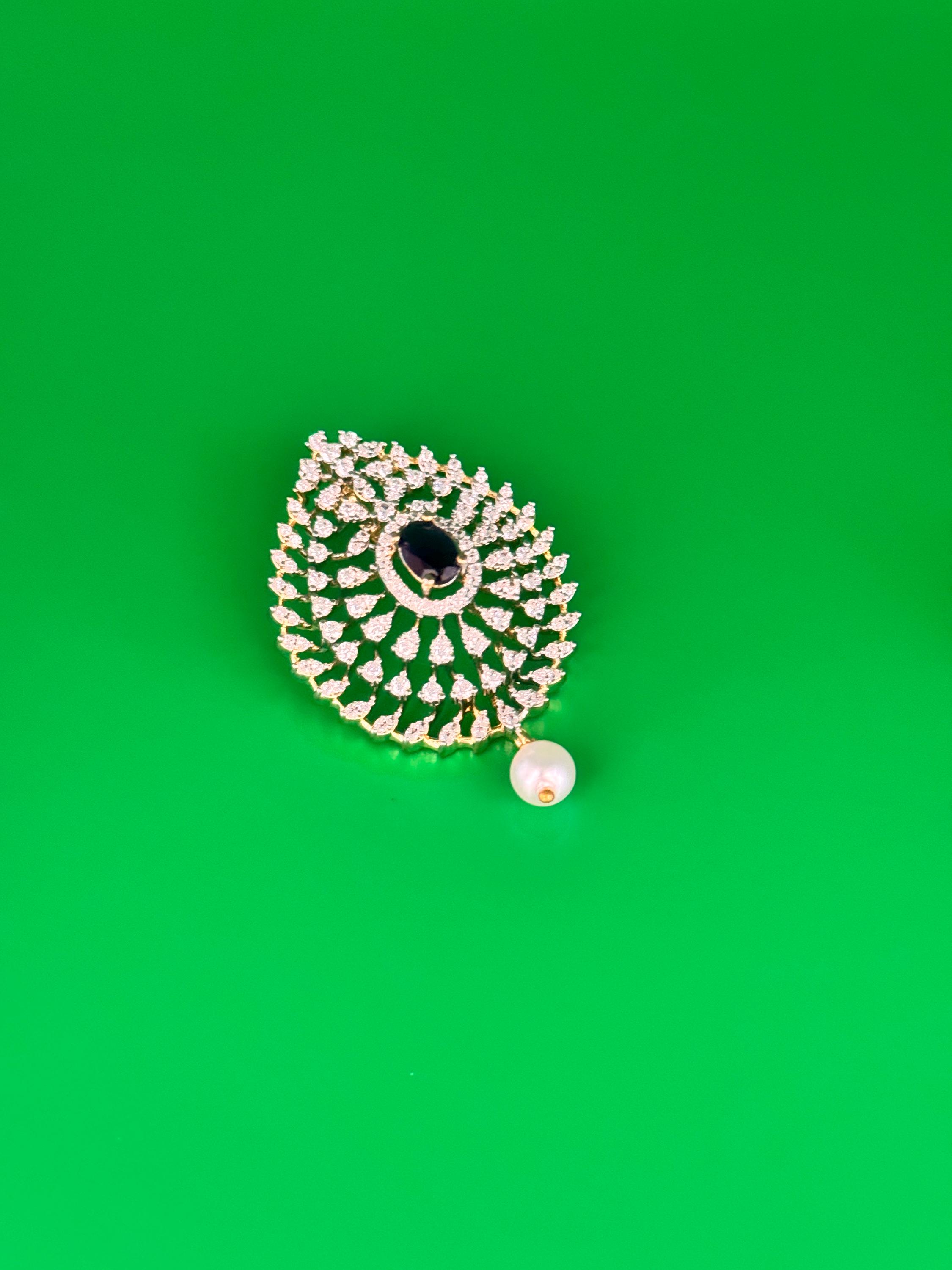 Elegant pendant and earrings set in premium American Diamond. Available in mint green and dark blue options.