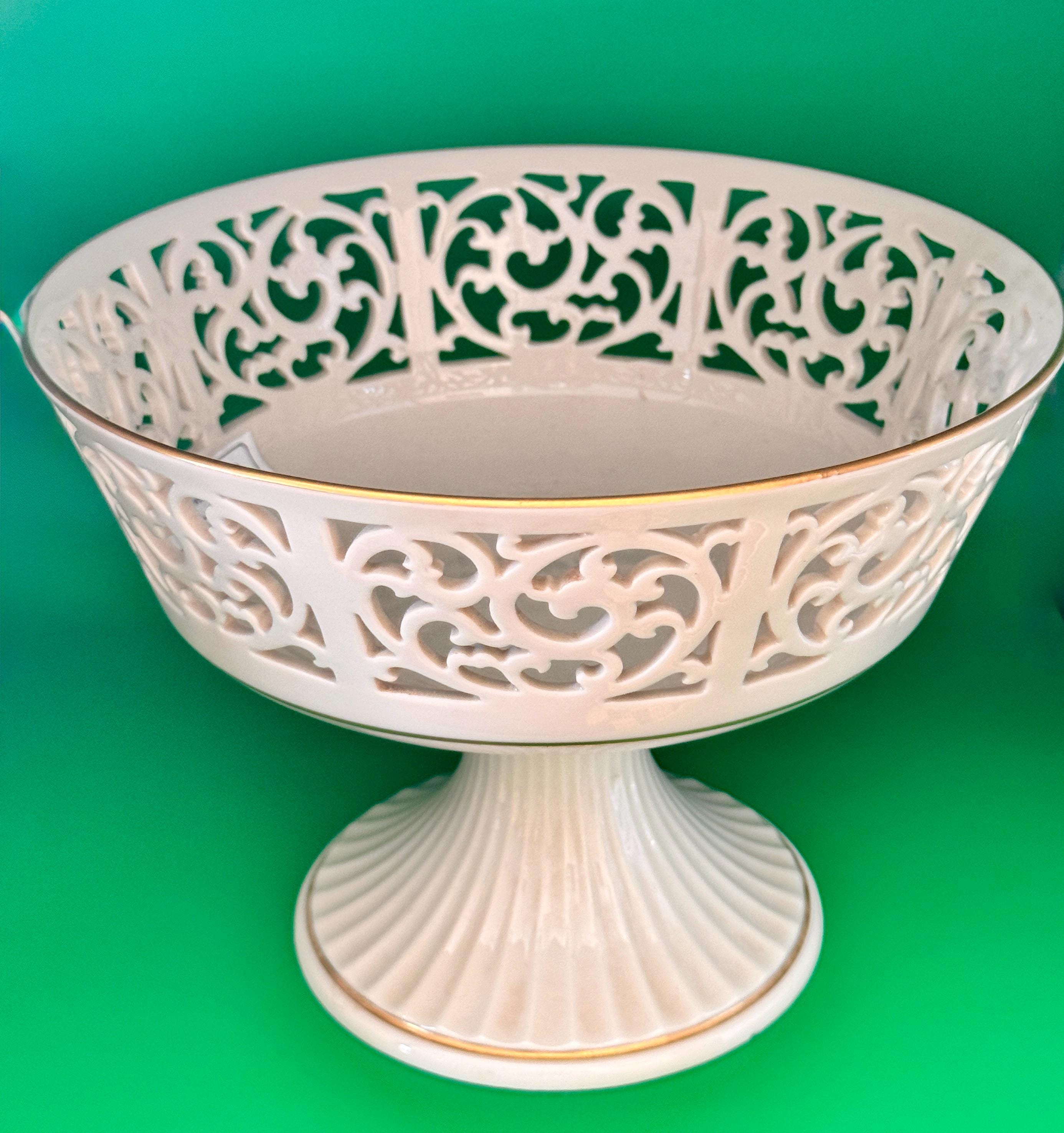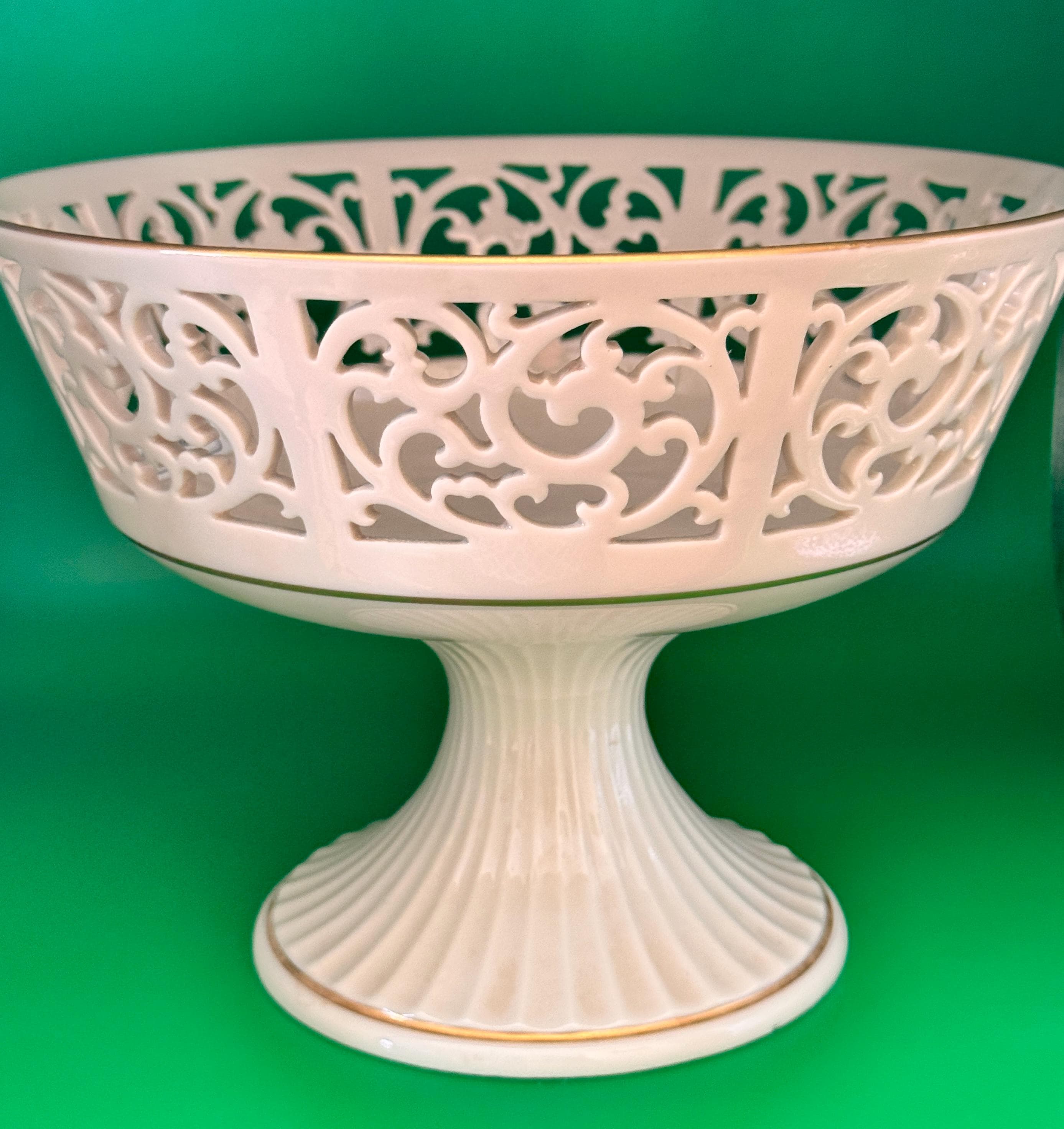 A stunning example of Lenox’s timeless artistry, this vintage pedestal bowl features the brand’s signature ivory porcelain, accented with a delicate gold trim and ornate cut-out detailing around the rim. The flared base with vertical ridges adds architectural grace, making it a standout piece for collectors and stylists alike.