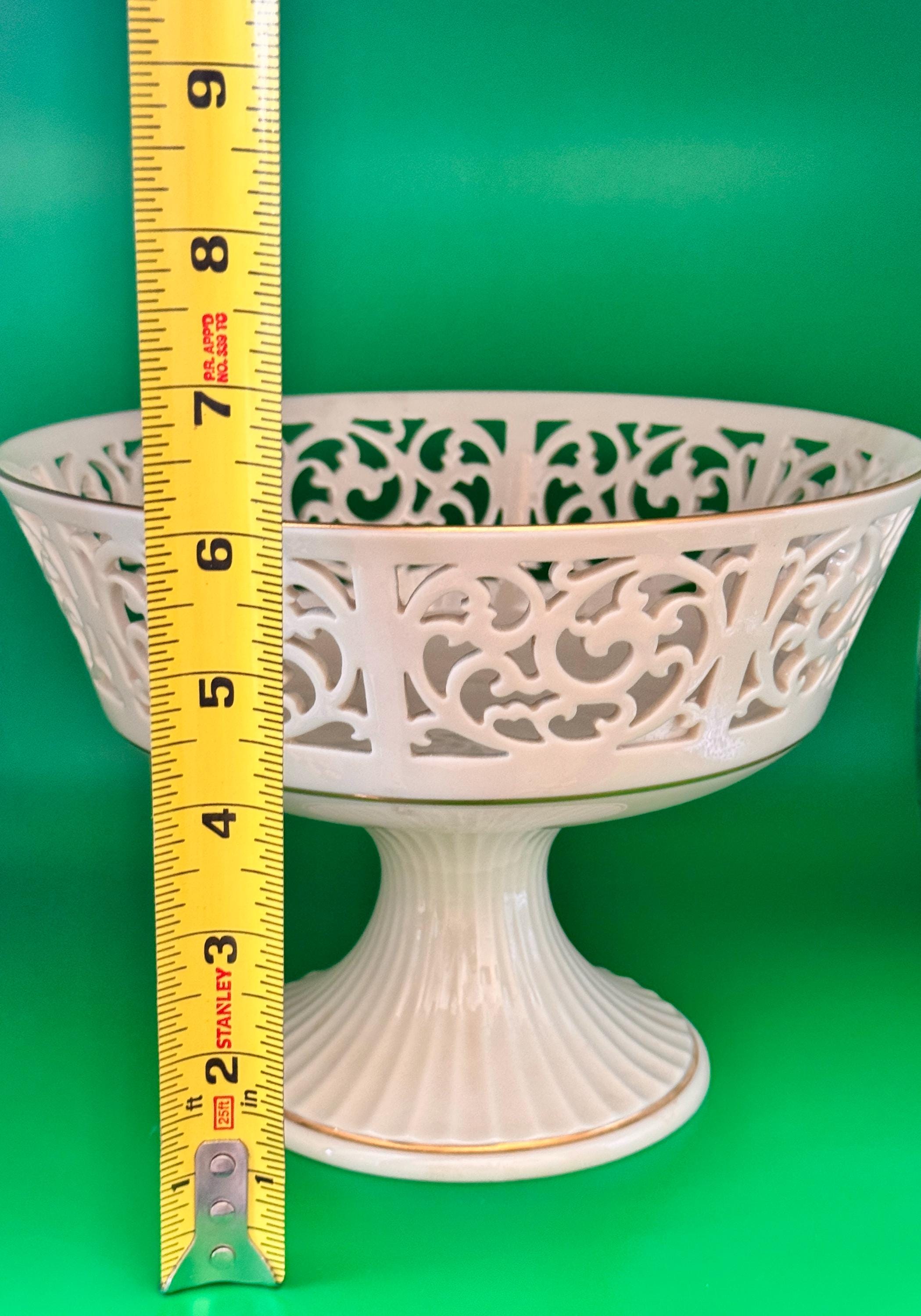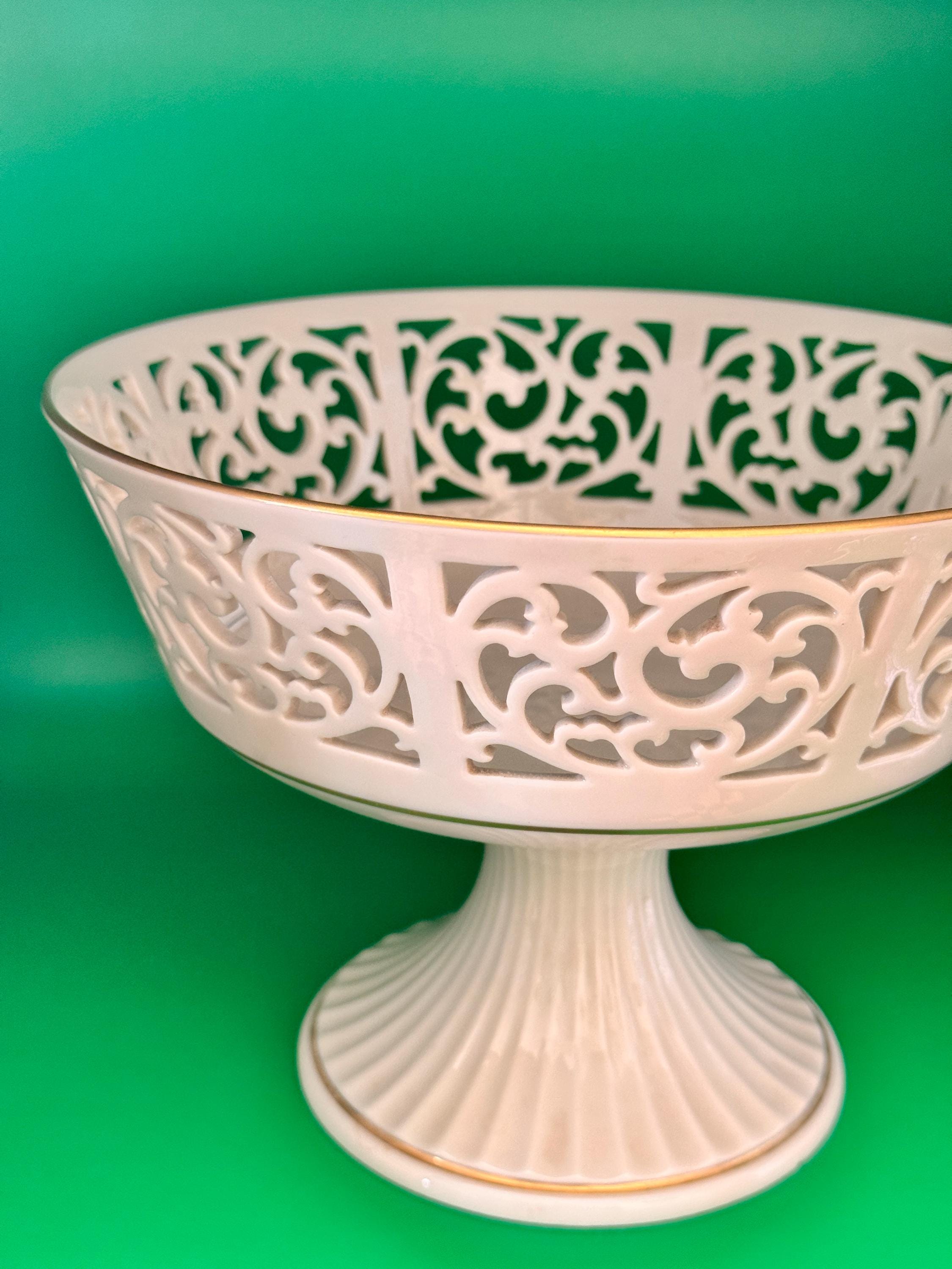 Lenox pedestal bowls with openwork rims were often part of limited-edition or formal serve ware collections, prized for their craftsmanship and quiet luxury. This piece reflects mid-century design sensibilities—refined, ornamental, and versatile. Its preserved glaze and intact gold trim enhance its collectible value, especially for those curating Lenox or American porcelain.