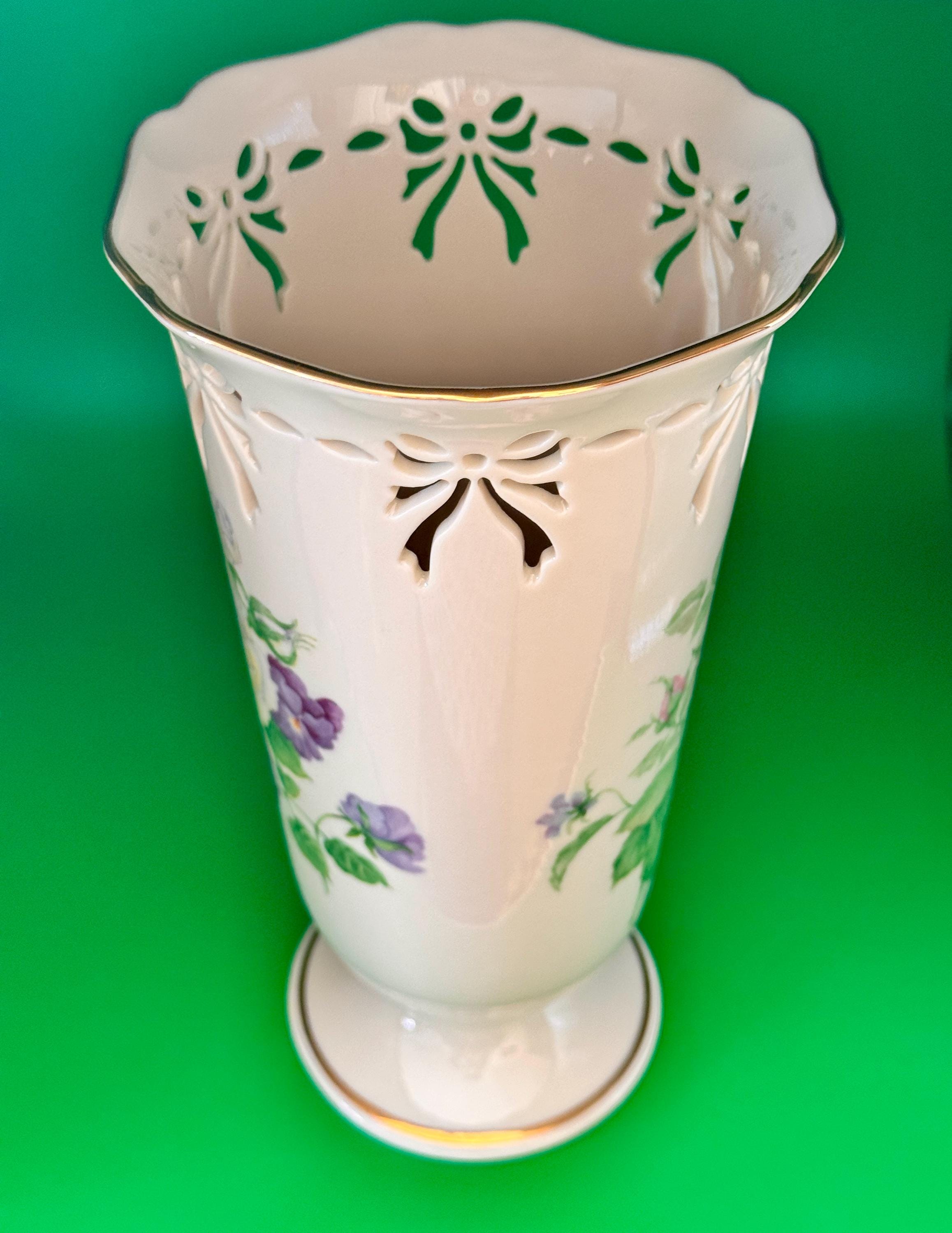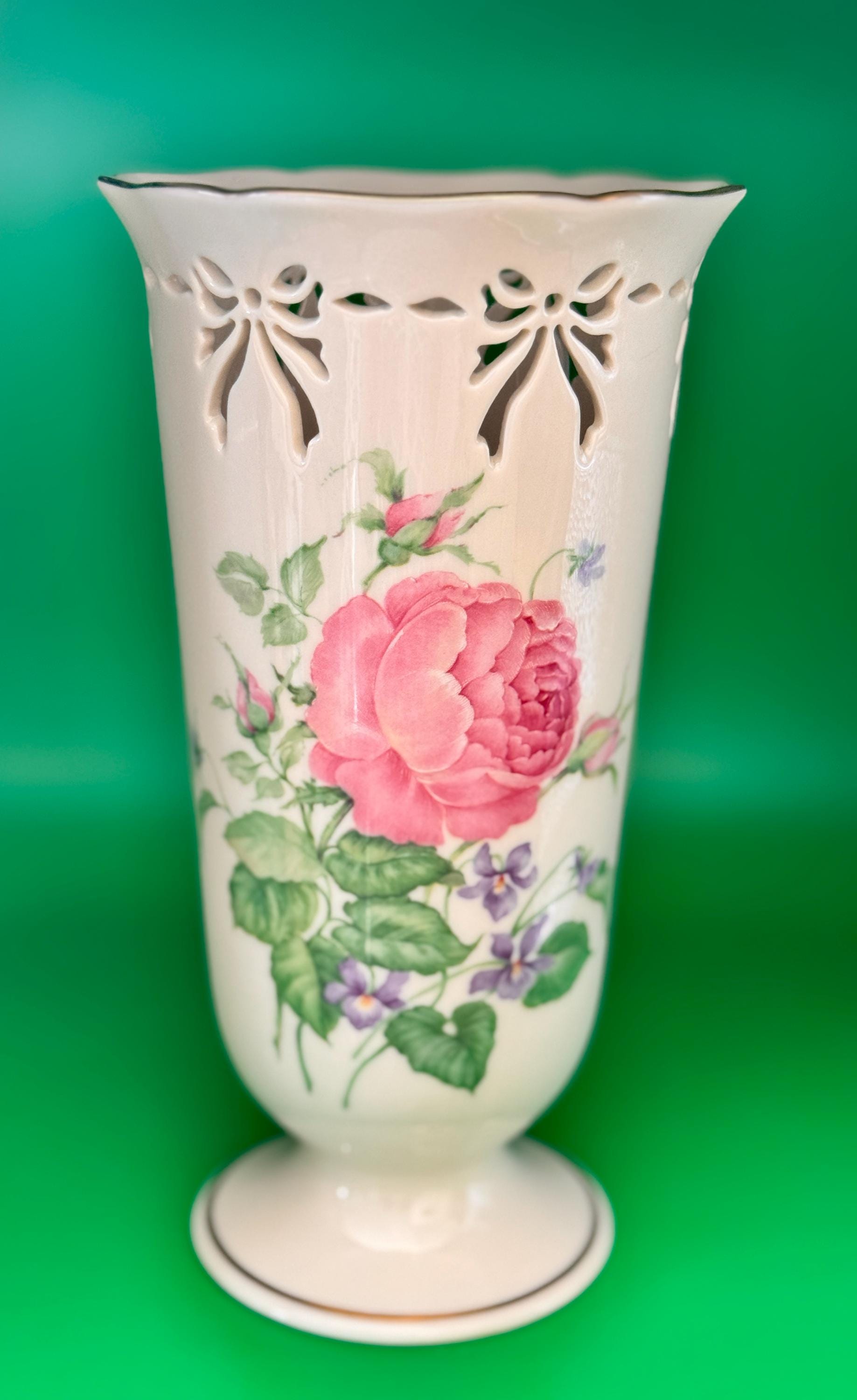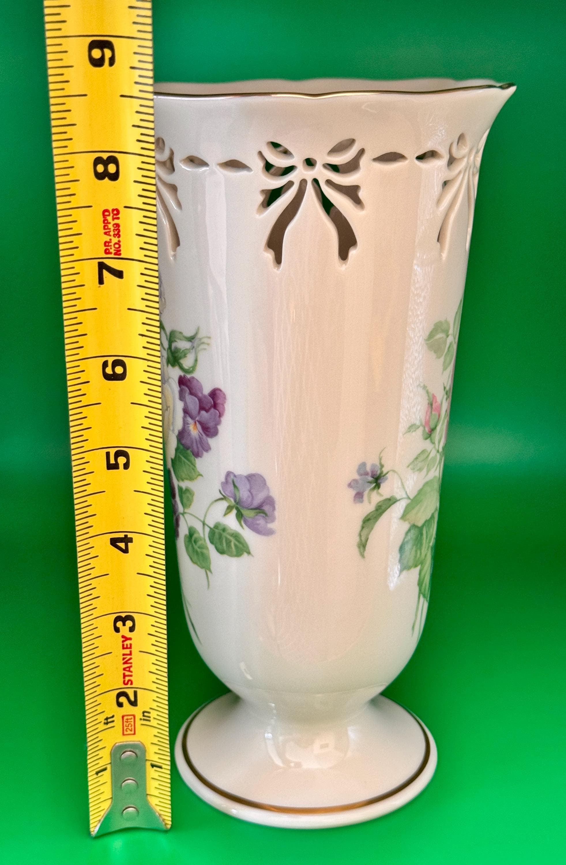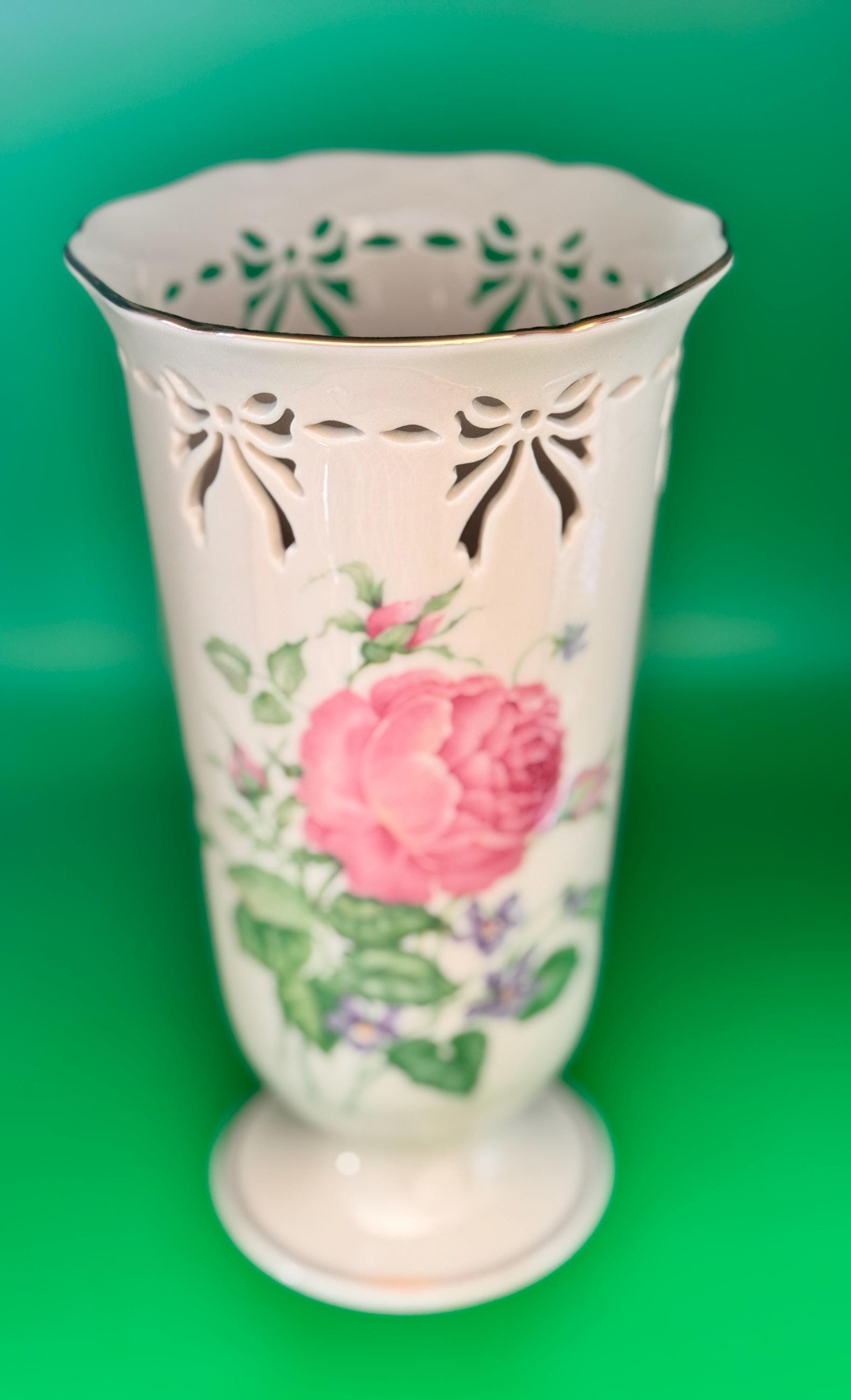 This beautiful Lenox vase is a stunning addition to any collection. The intricate floral pattern and painted finish make it a perfect choice for those who appreciate traditional style and fine porcelain craftsmanship. Measuring 8.5'' high and featuring a pierced top, this vase is both elegant and functional. A great choice for anyone looking for a decorative piece that can be used to display flowers or other items. Perfect condition, made in the USA measuring 8.5'' High Please view photos for detail.