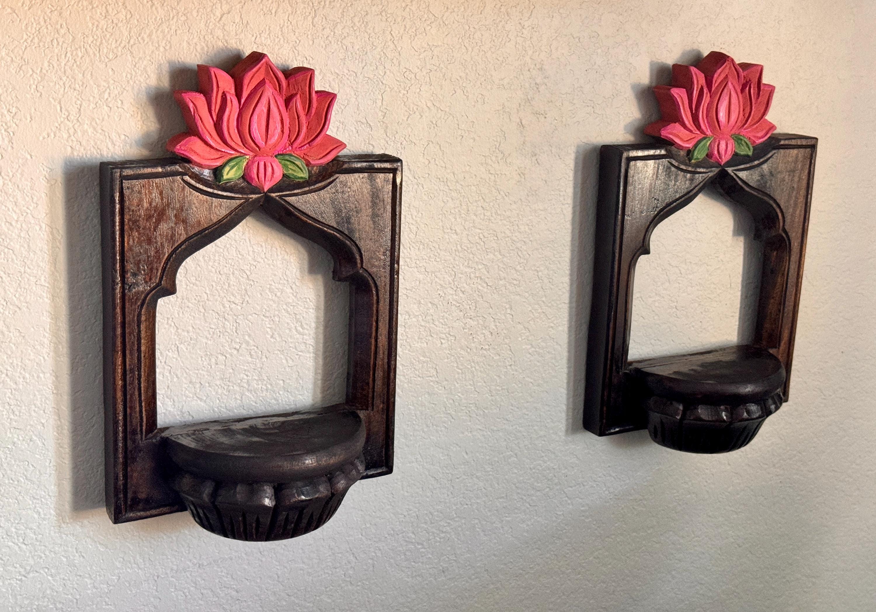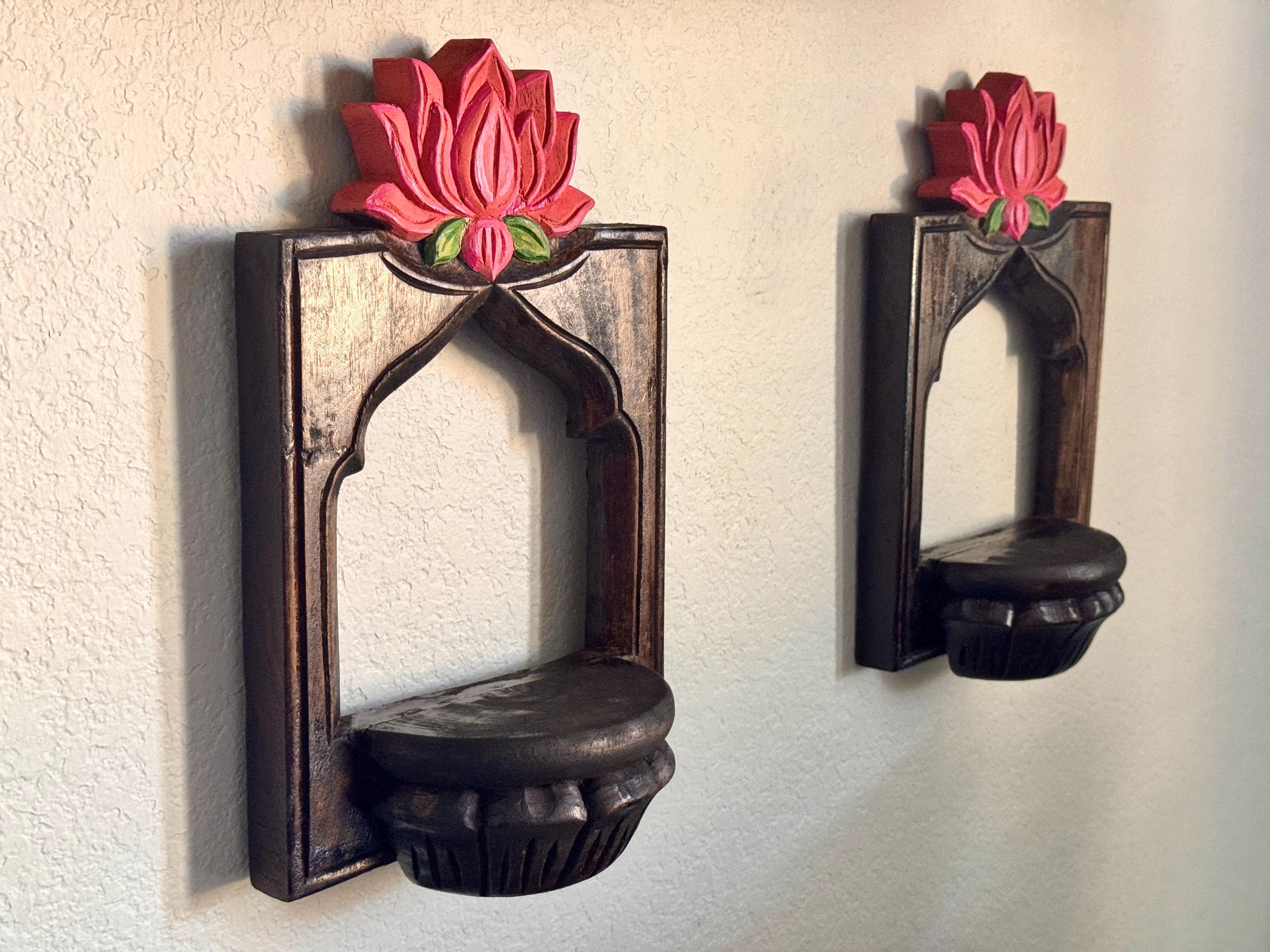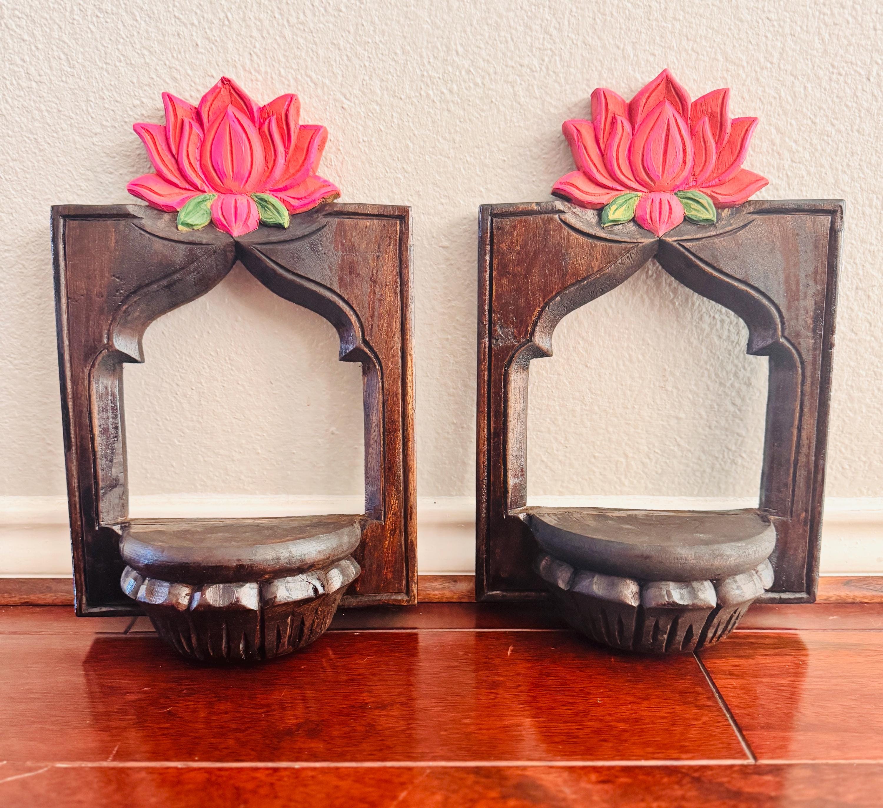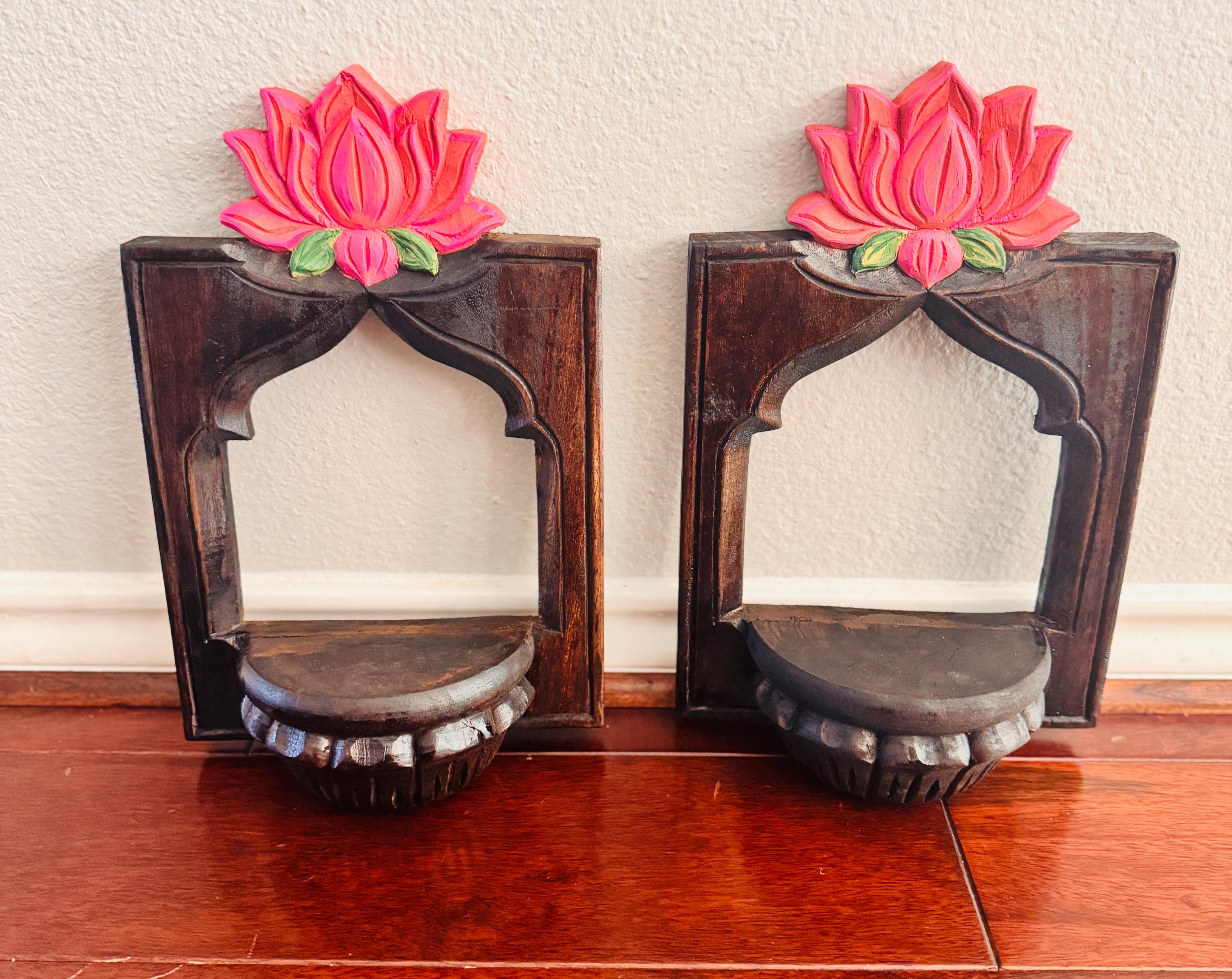 Elevate your space with this exquisite pair of hand-carved wooden wall shelves, each crowned with a vibrant lotus bloom in shades of pink and green. Designed with a semi-circular platform and framed by an arched silhouette, these shelves blend traditional artistry with timeless elegance.