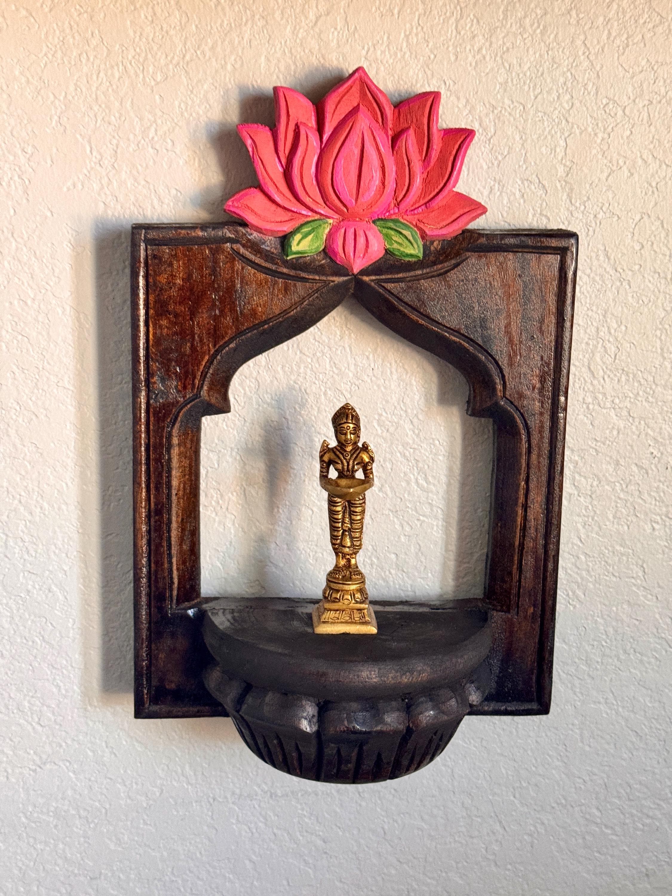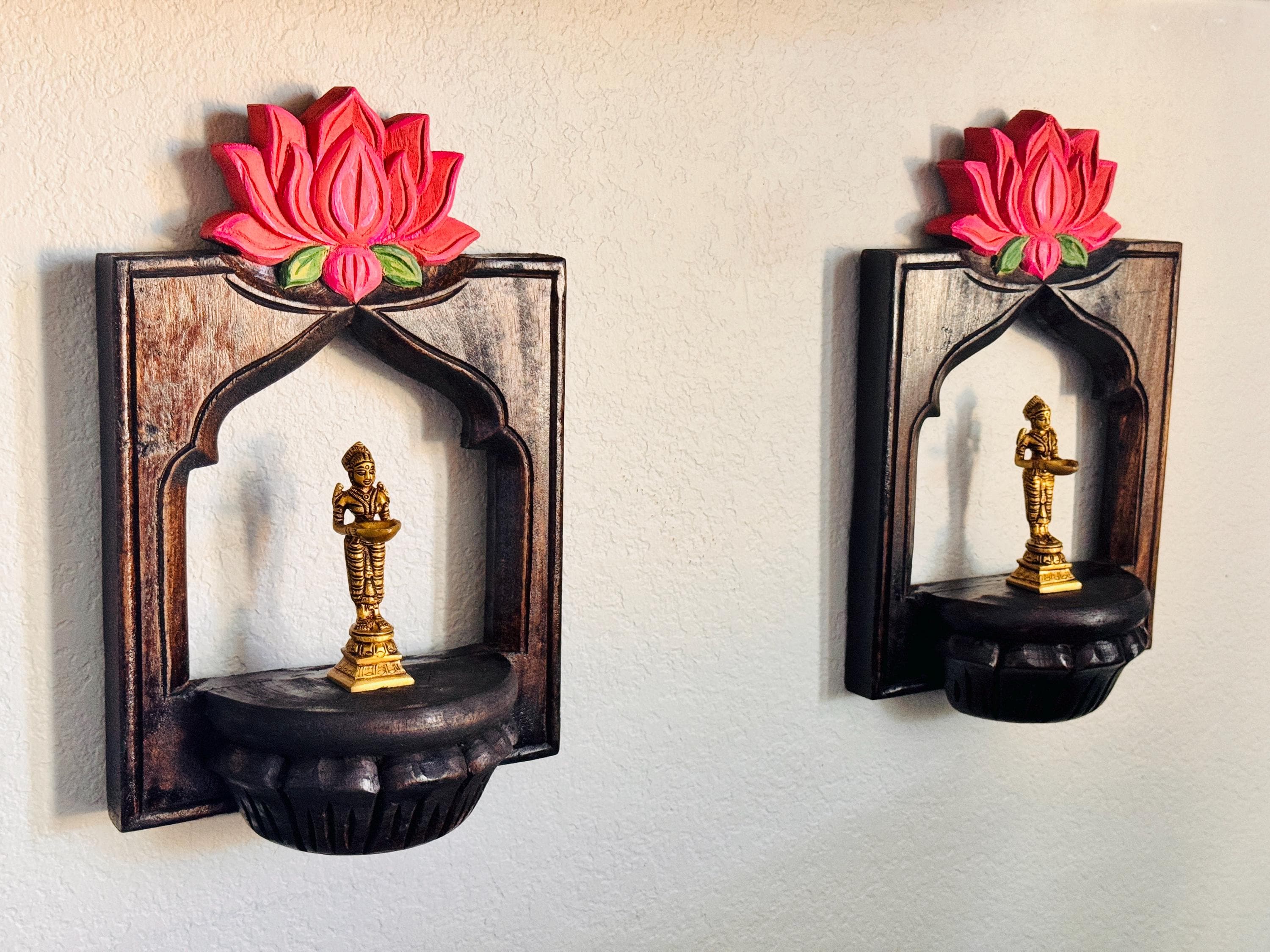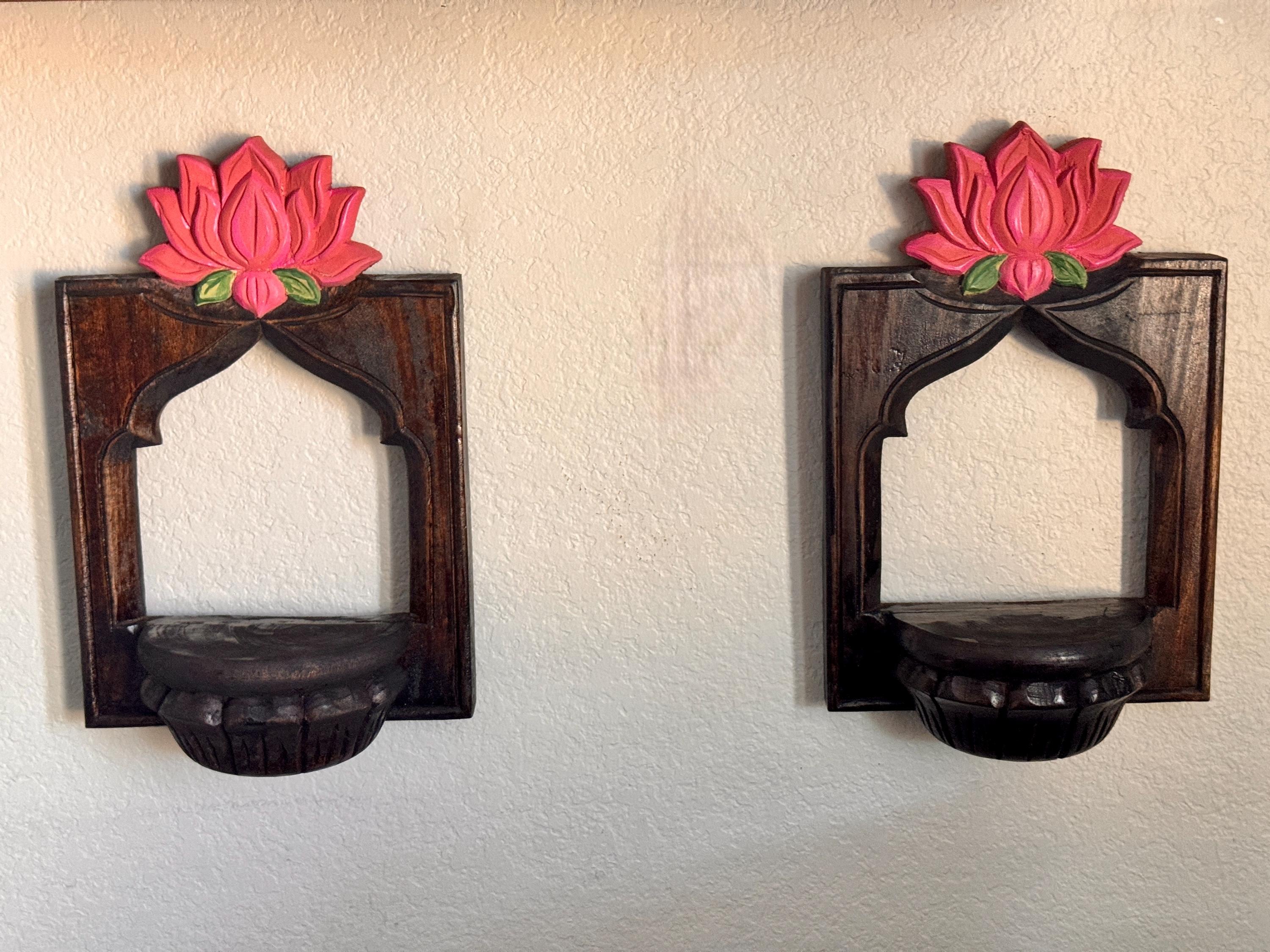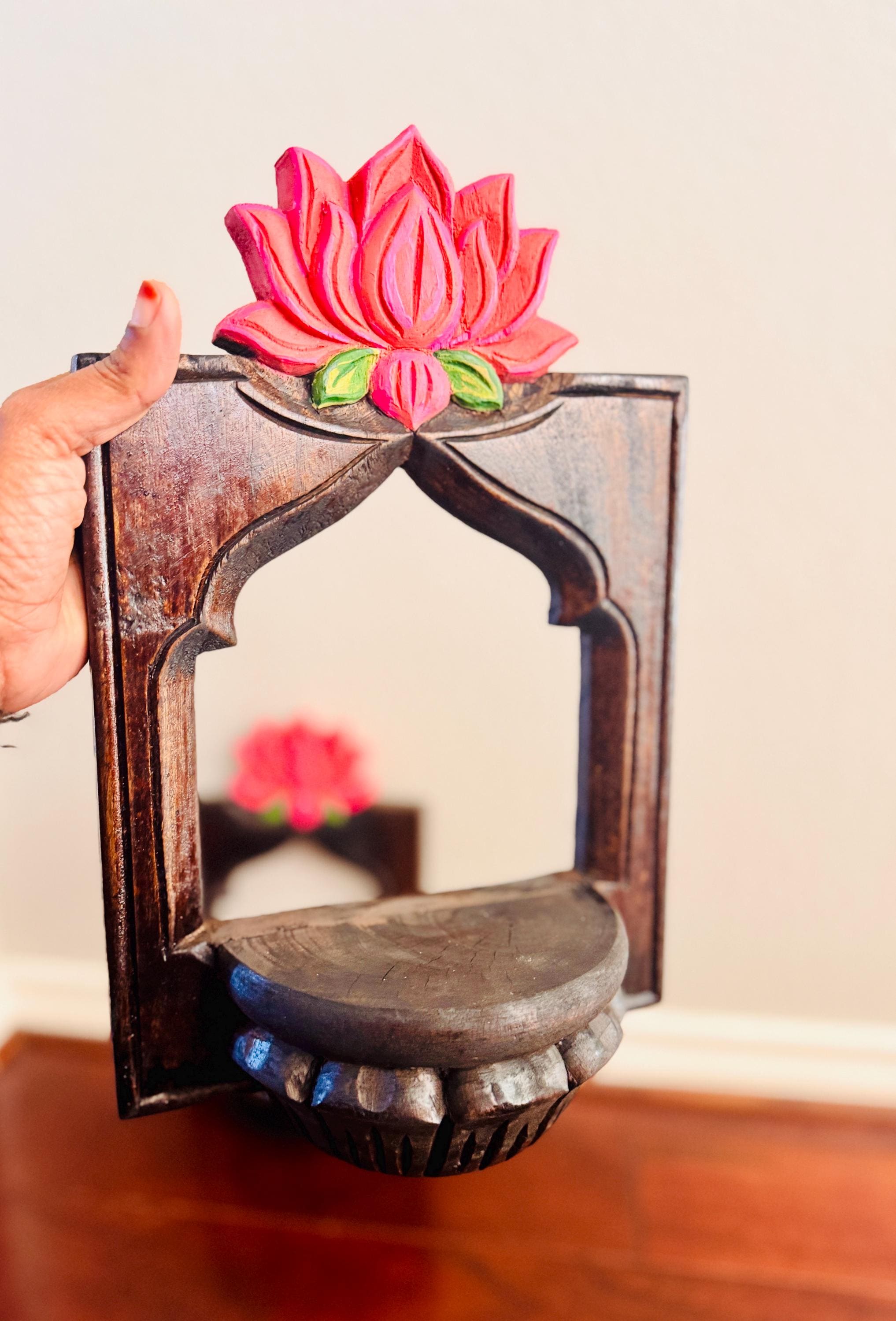 Elevate your space with this exquisite pair of hand-carved wooden wall shelves, each crowned with a vibrant lotus bloom in shades of pink and green. Designed with a semi-circular platform and framed by an arched silhouette, these shelves blend traditional artistry with timeless elegance.