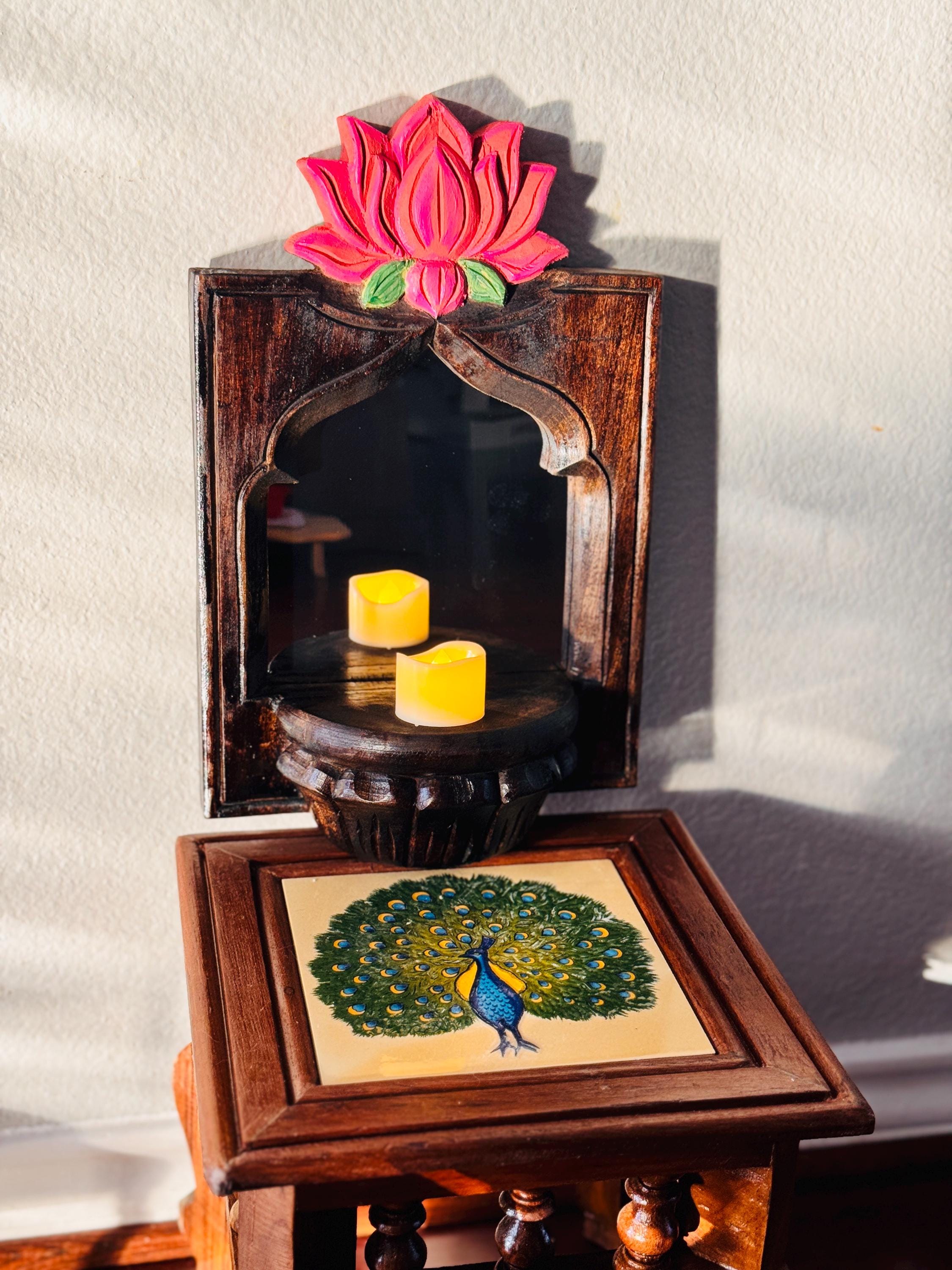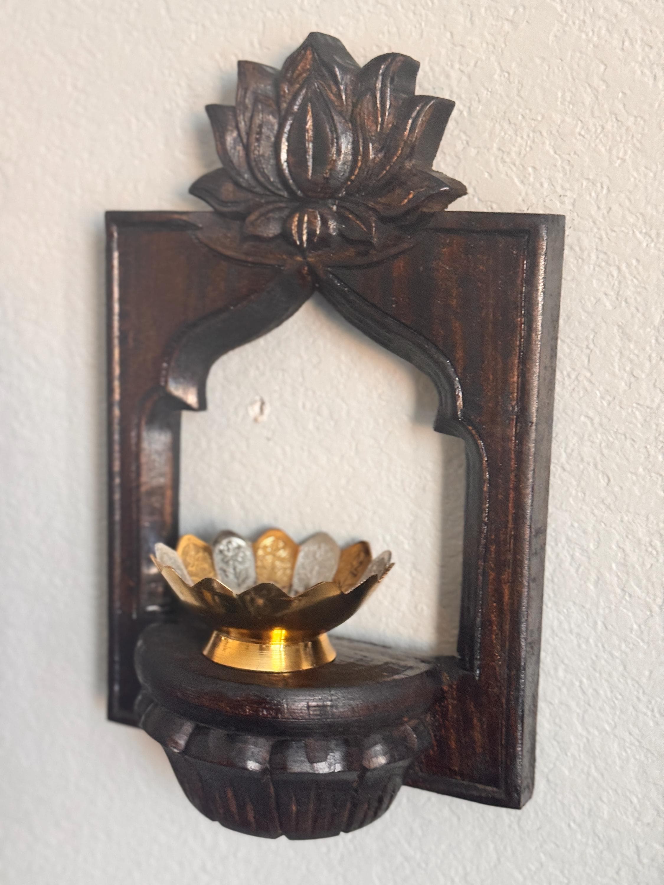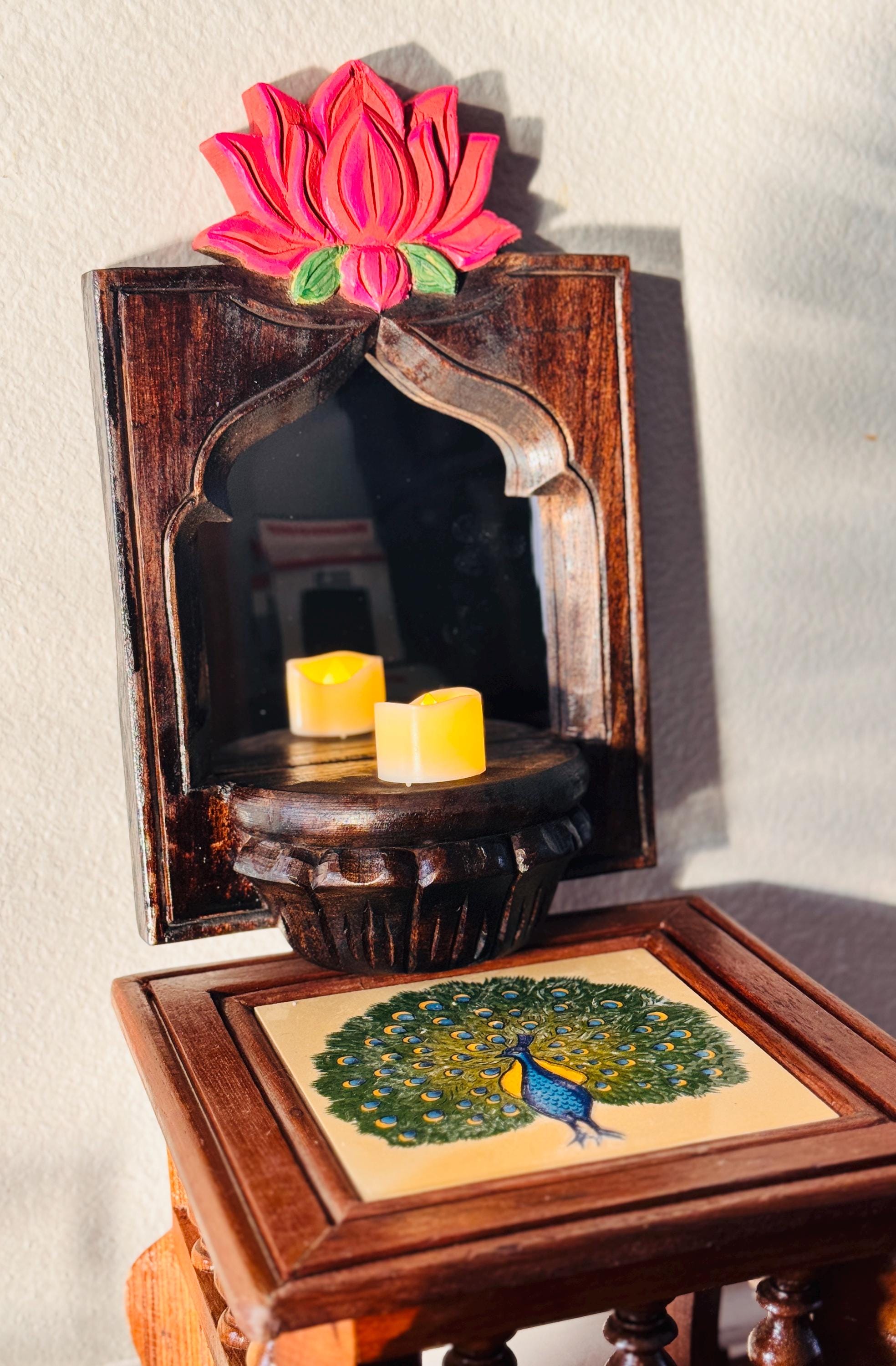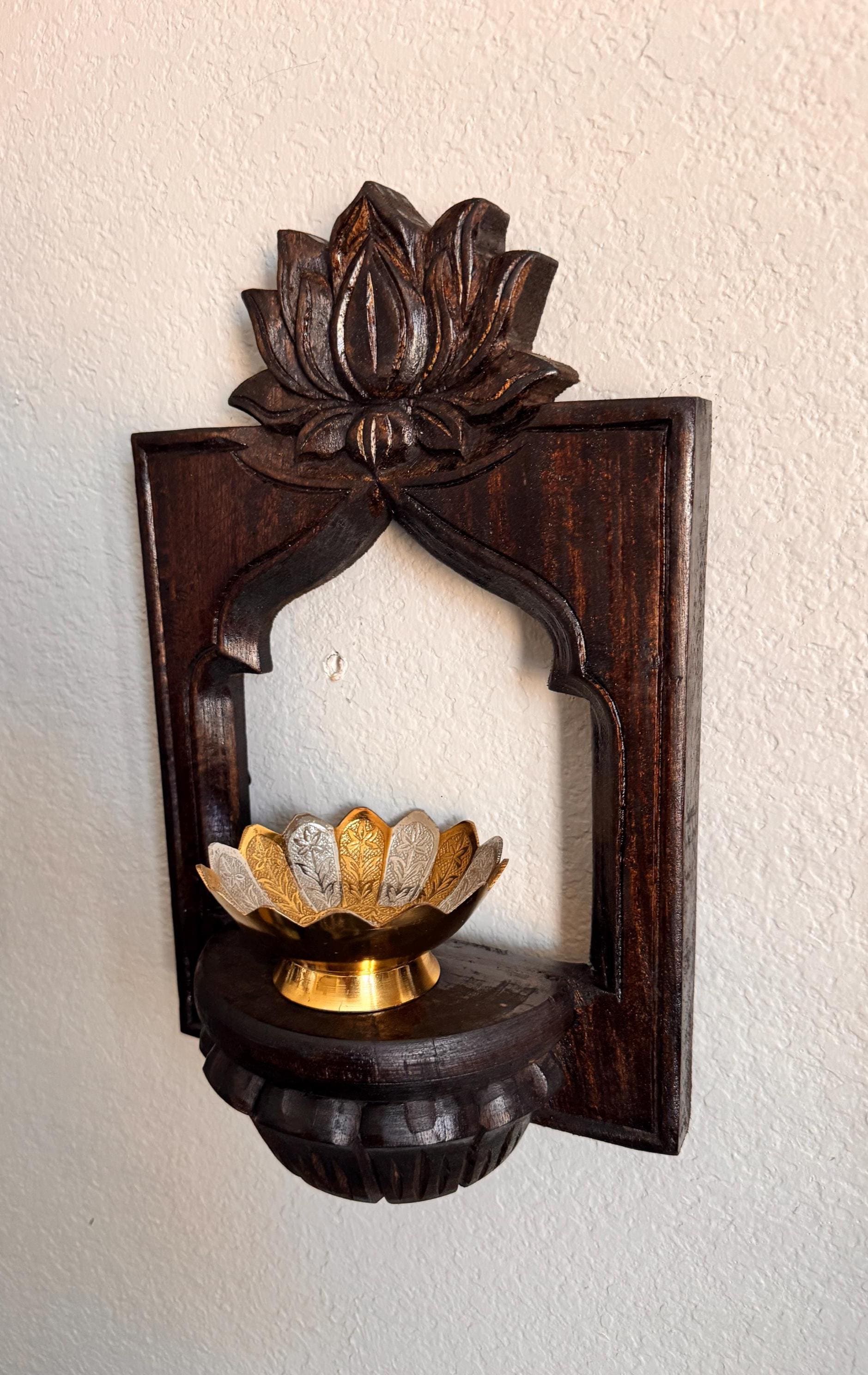 Elevate your space with this exquisite pair of hand-carved wooden wall shelves, each crowned with a vibrant lotus bloom in shades of pink and green. Designed with a semi-circular platform and framed by an arched silhouette, these shelves blend traditional artistry with timeless elegance.