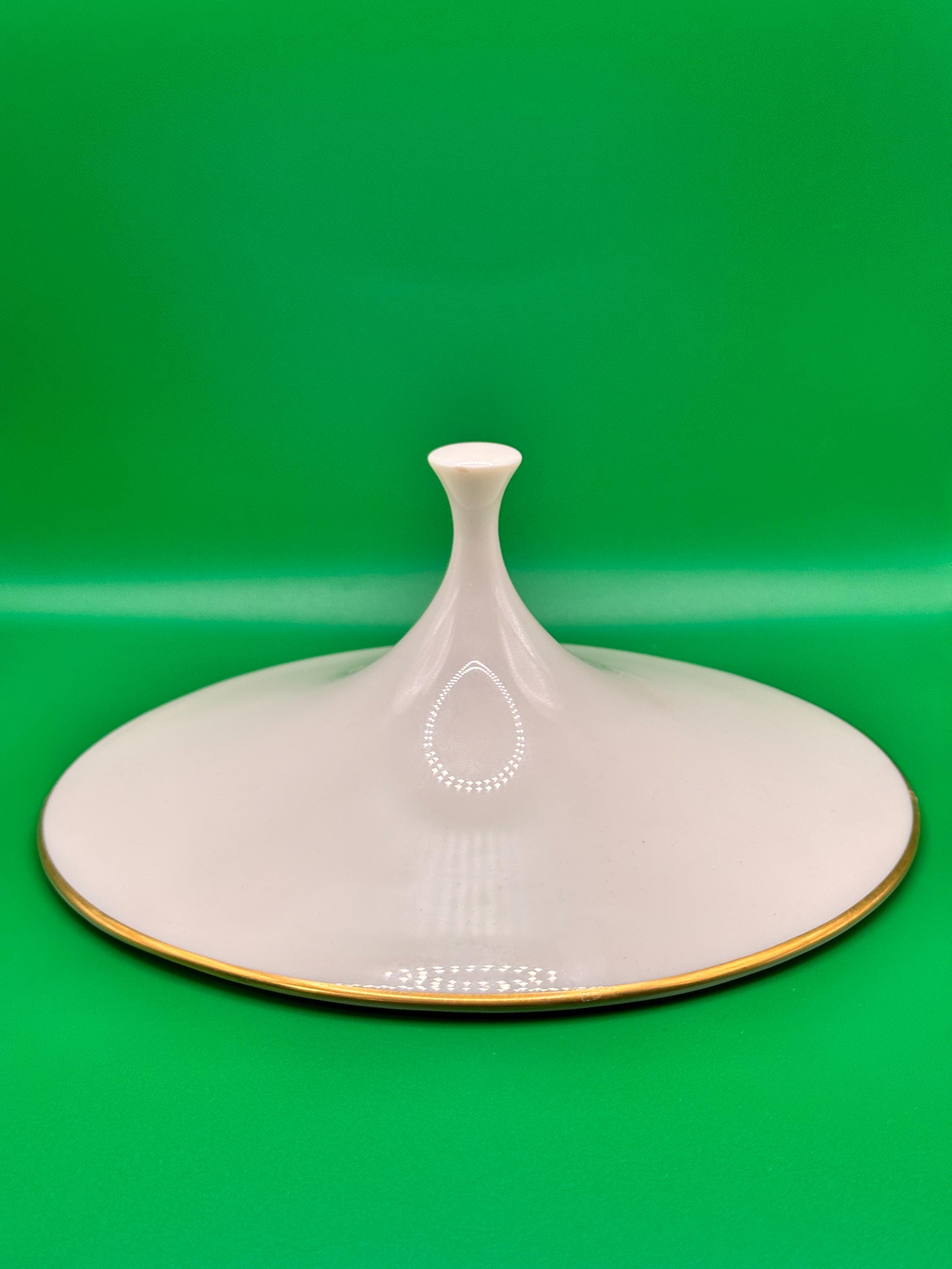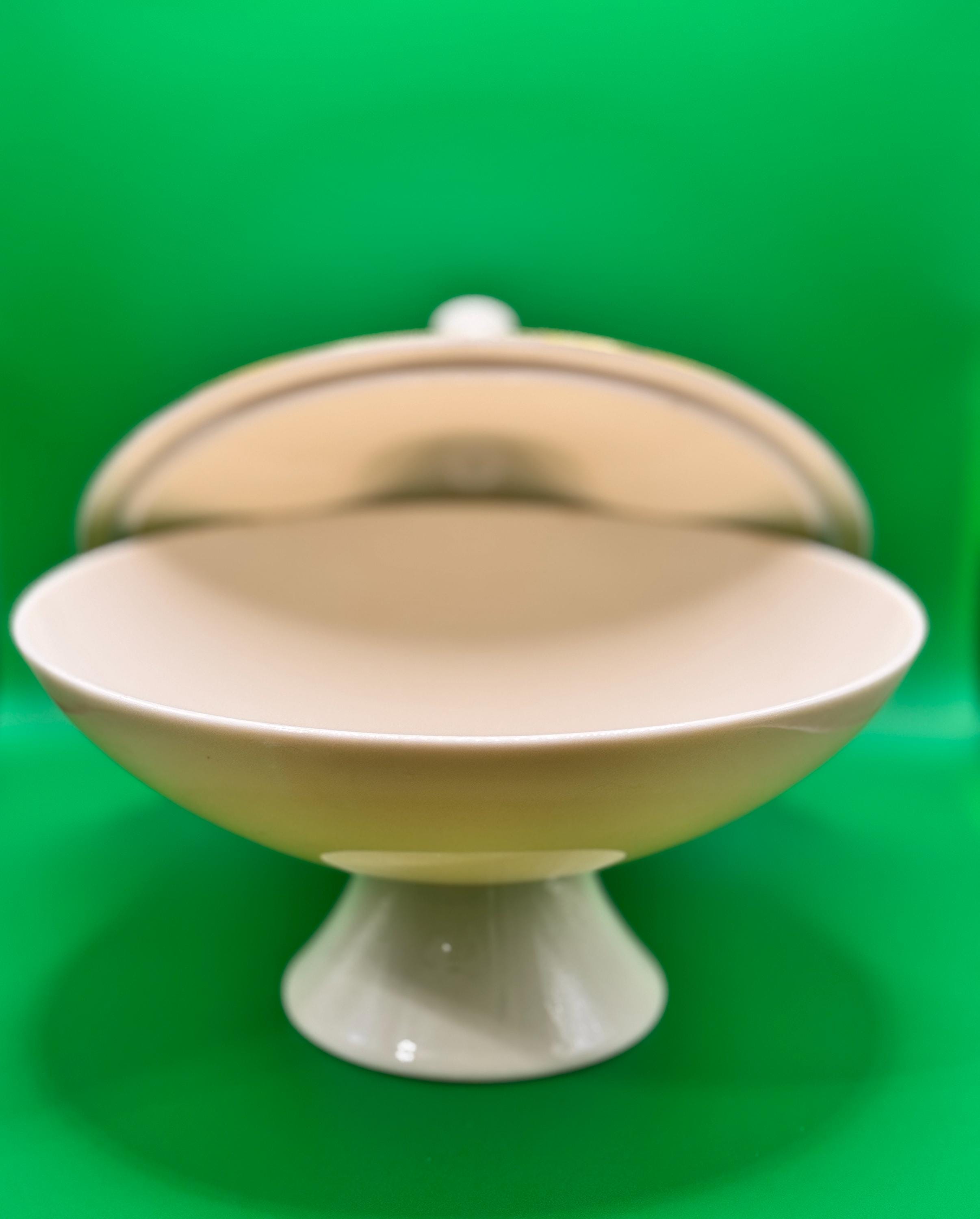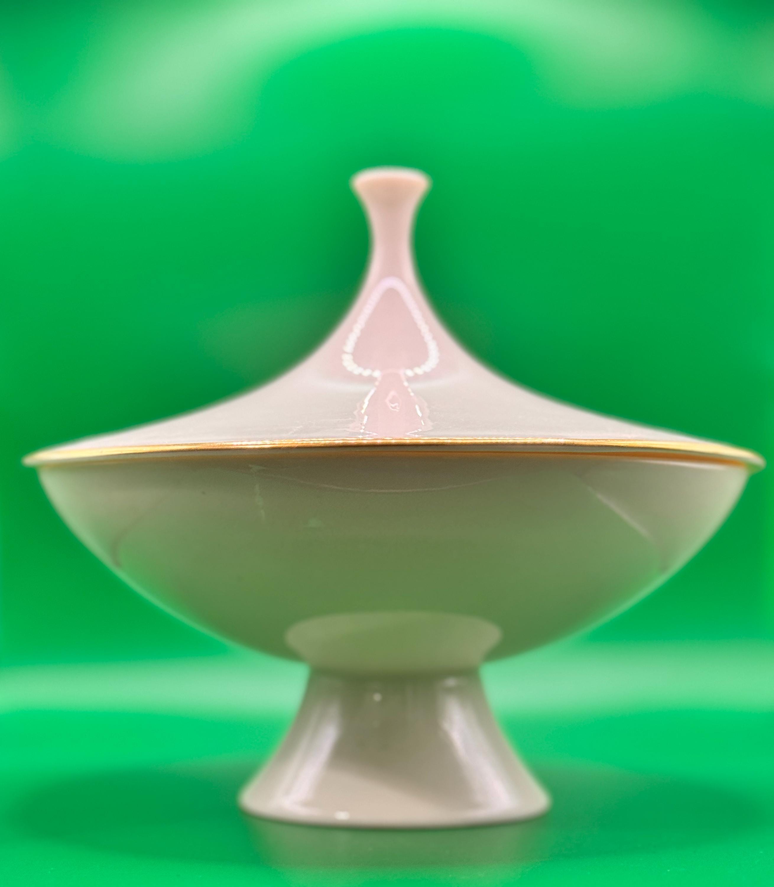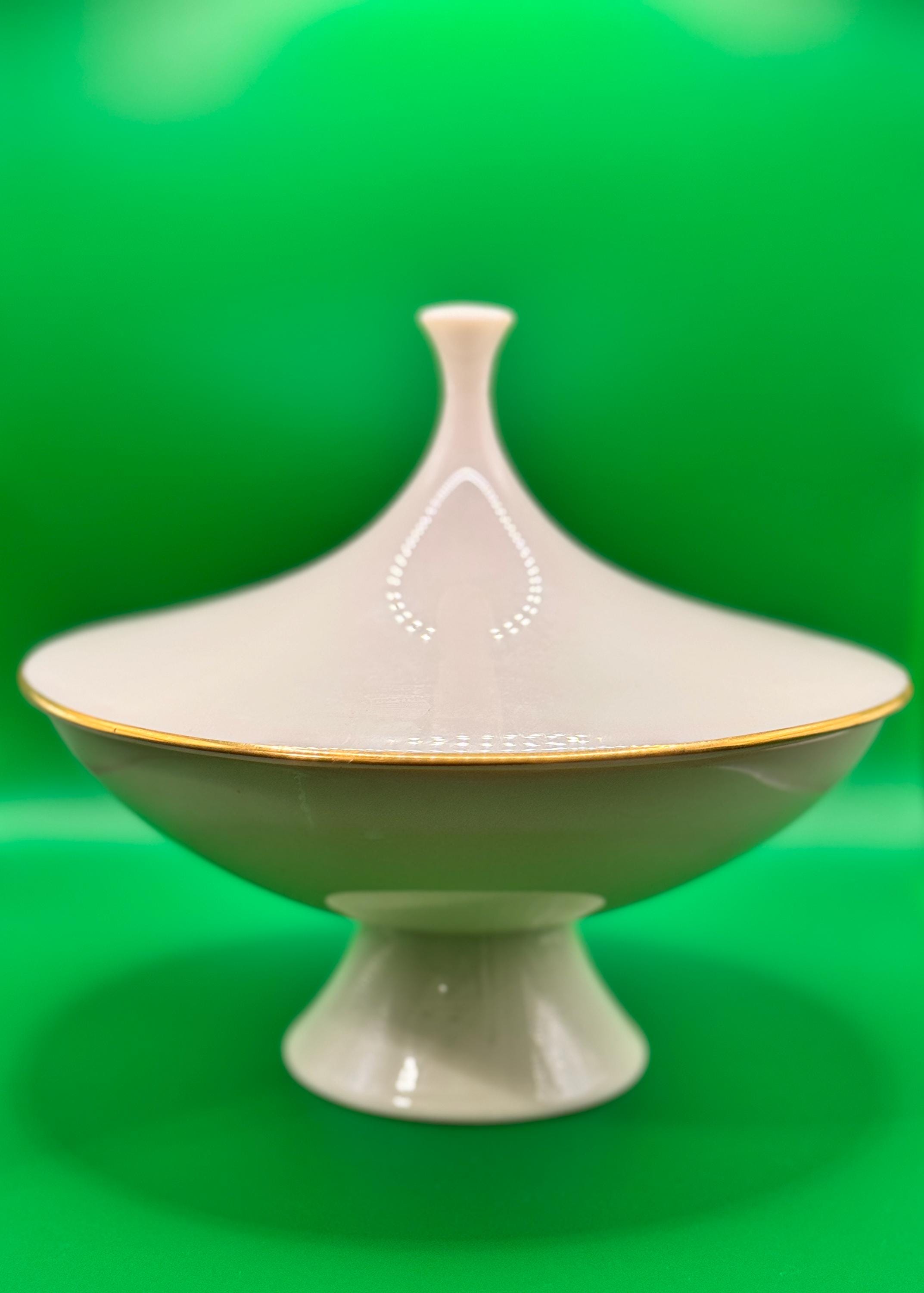 The Lenox Beverly Footed Compote is a mid-century modern (MCM) collectible known for its ivory porcelain body, 24k gold accents, and atomic-era styling. It’s a lidded pedestal candy dish crafted in the USA, often sought after by vintage and Lenox collectors.