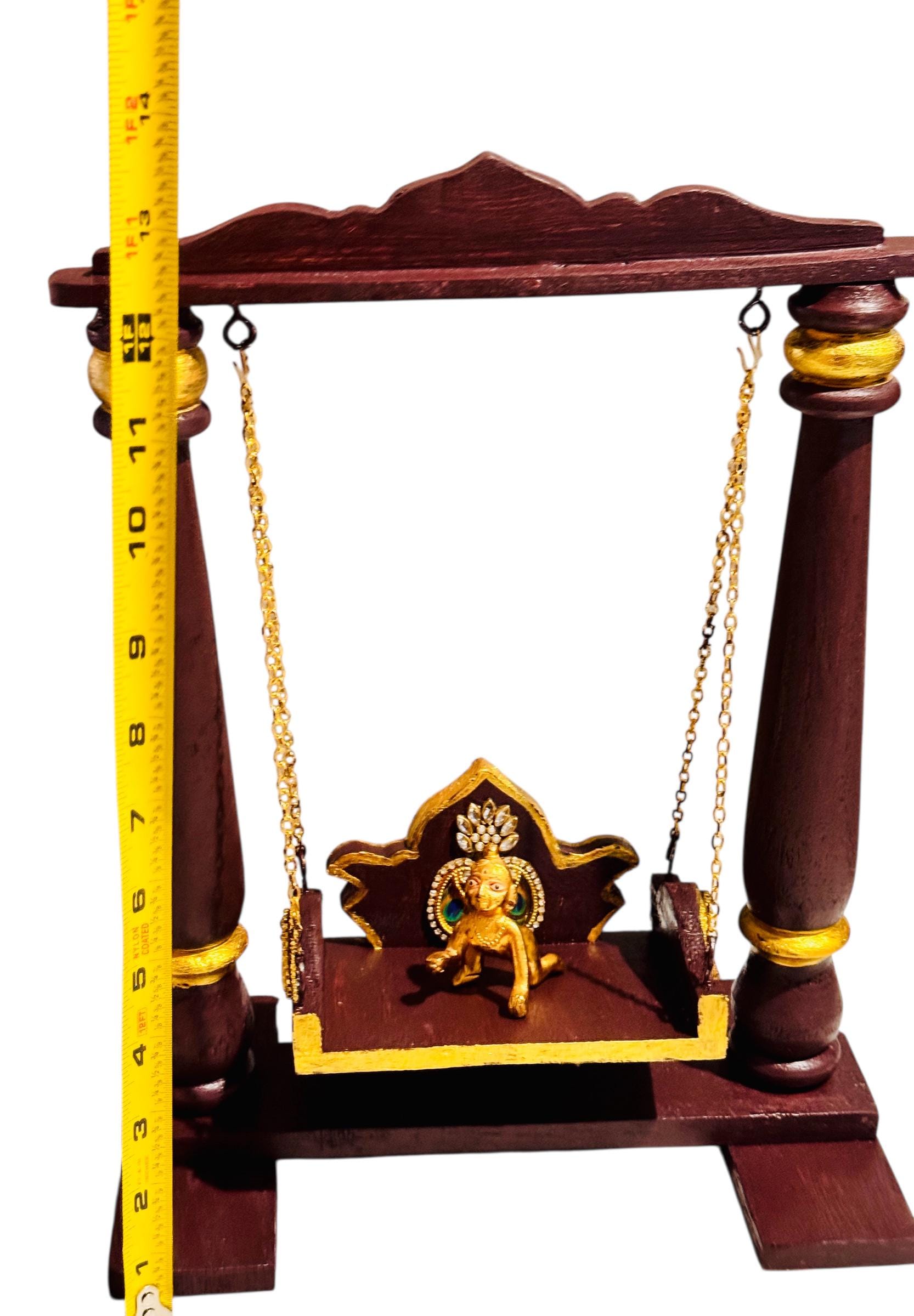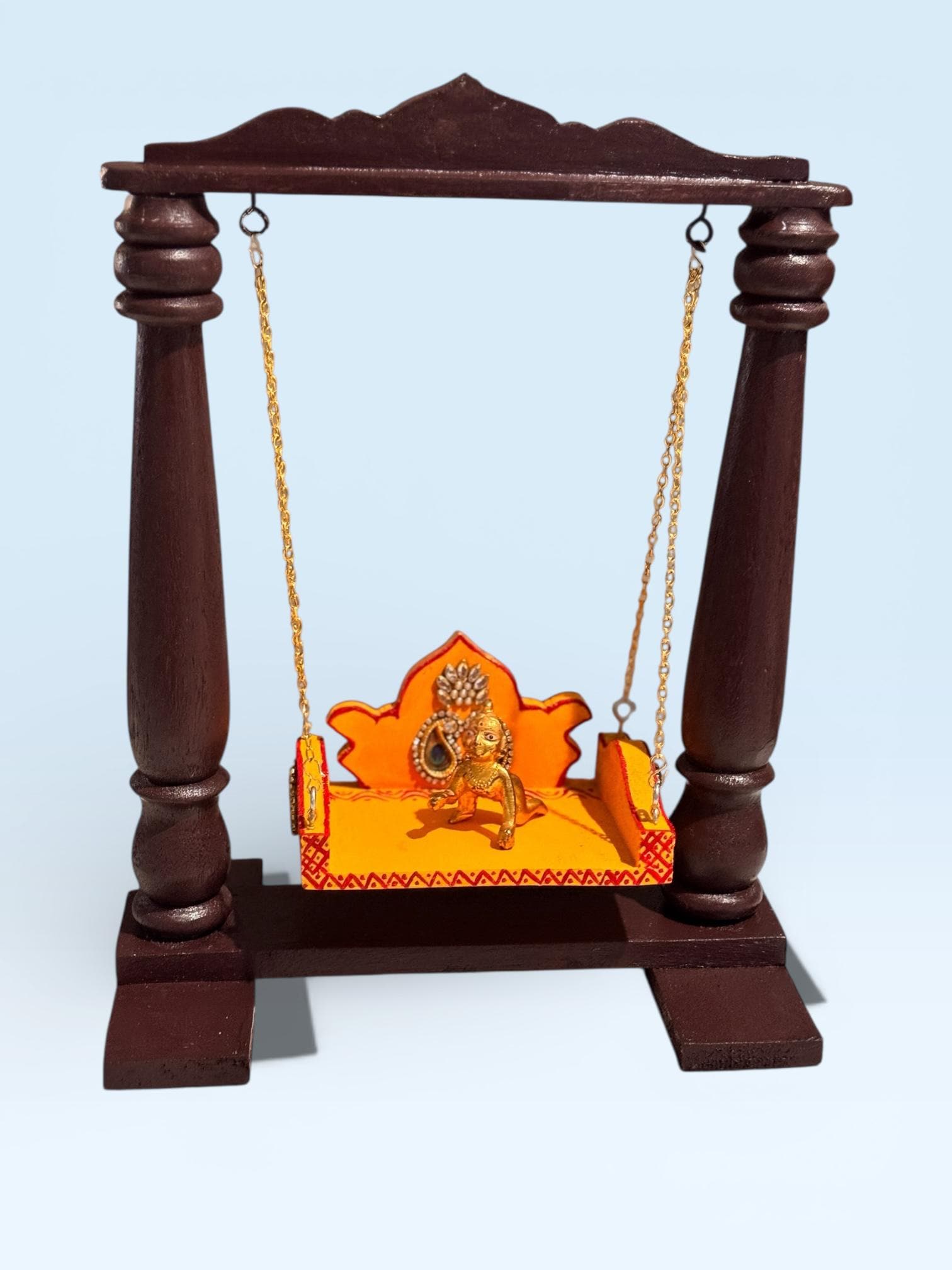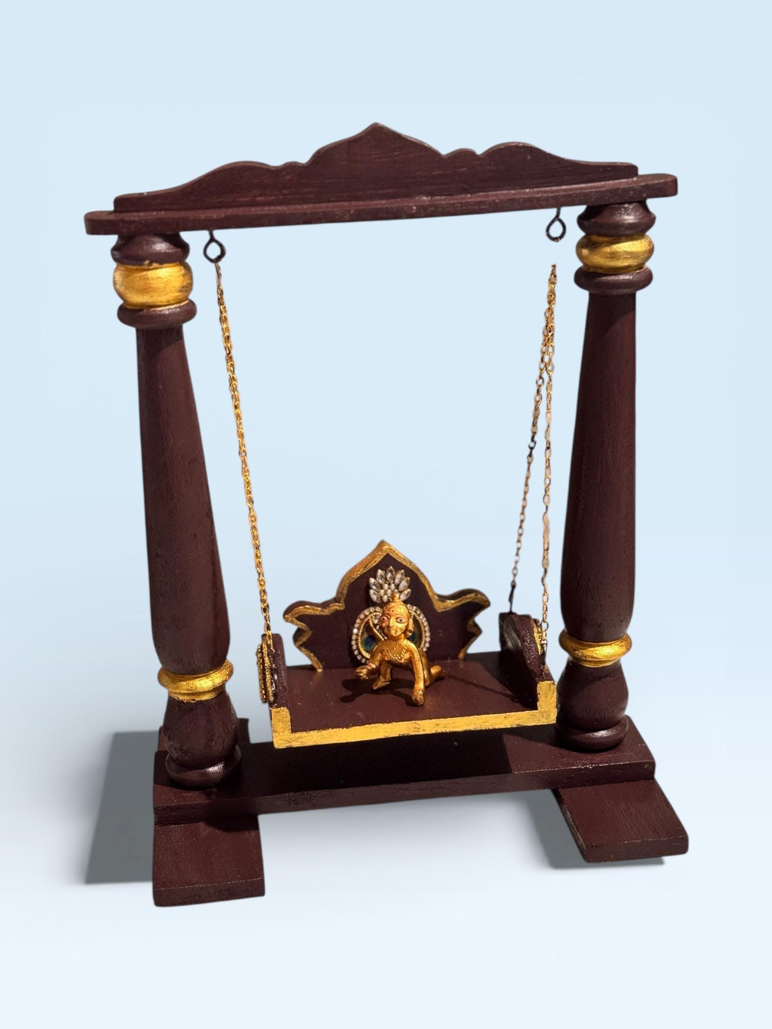 This elegant miniature jhoola is lovingly hand-carved to evoke the charm of traditional Indian swings, often used to seat Lord Krishna during festive rituals and devotional displays. Suspended by golden chains and adorned with ornate detailing, it serves as a symbolic cradle of joy, devotion, and celebration.
