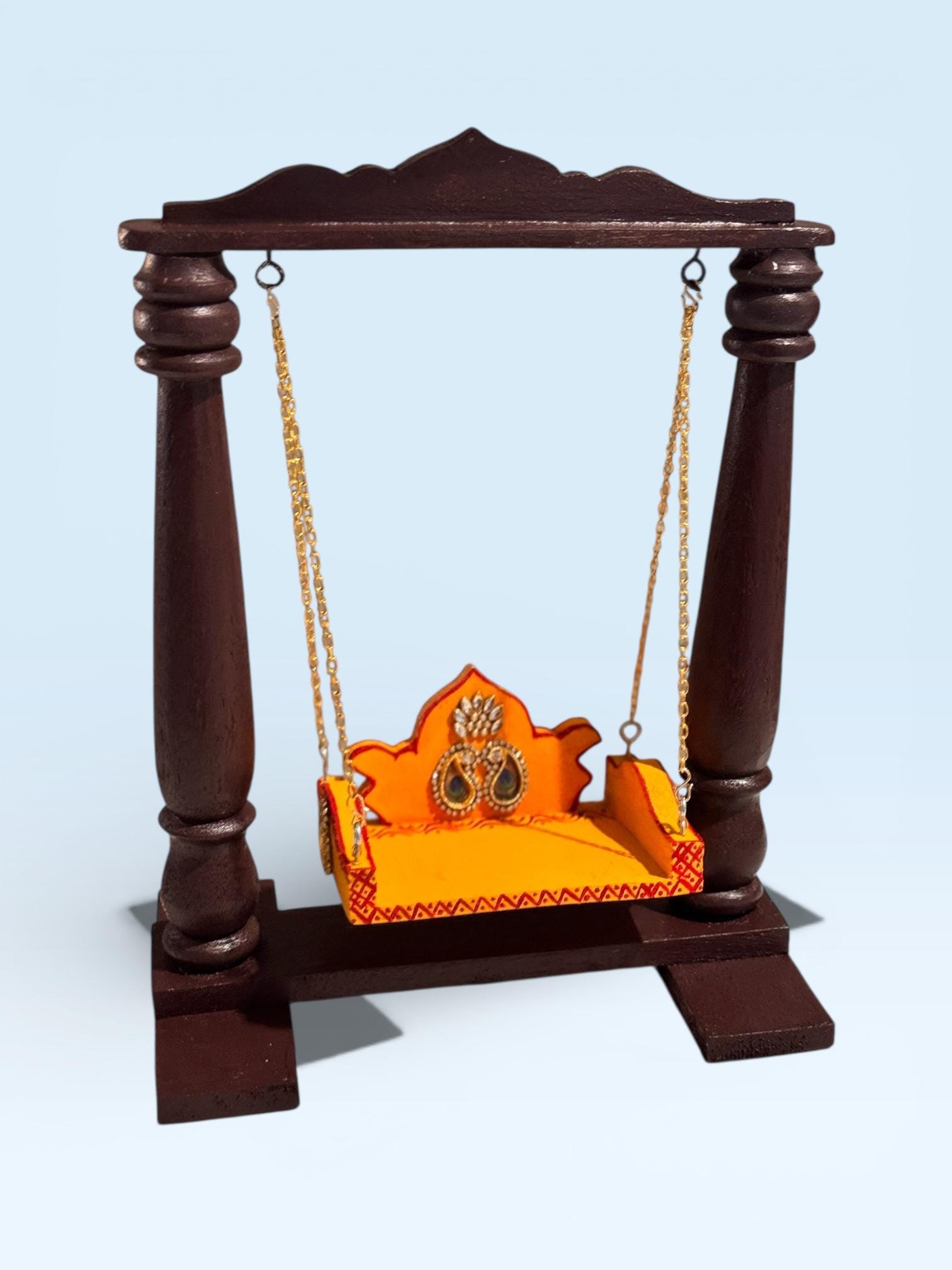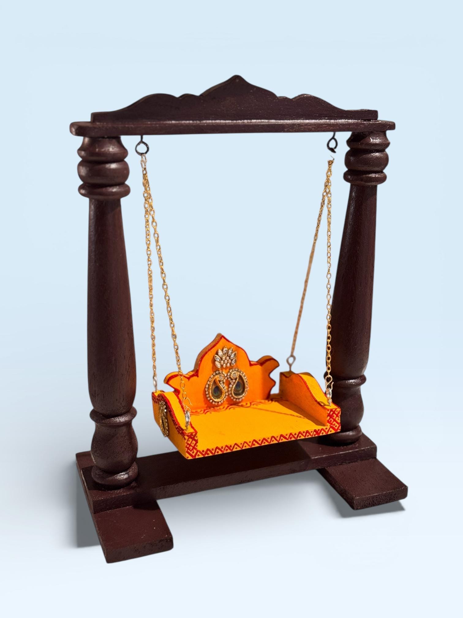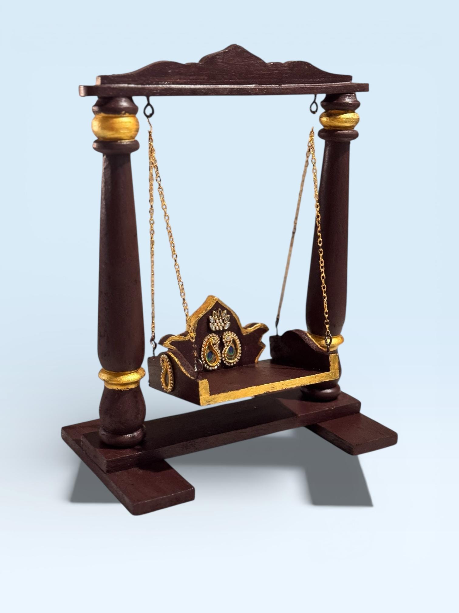This elegant miniature jhoola is lovingly hand-carved to evoke the charm of traditional Indian swings, often used to seat Lord Krishna during festive rituals and devotional displays. Suspended by golden chains and adorned with ornate detailing, it serves as a symbolic cradle of joy, devotion, and celebration.