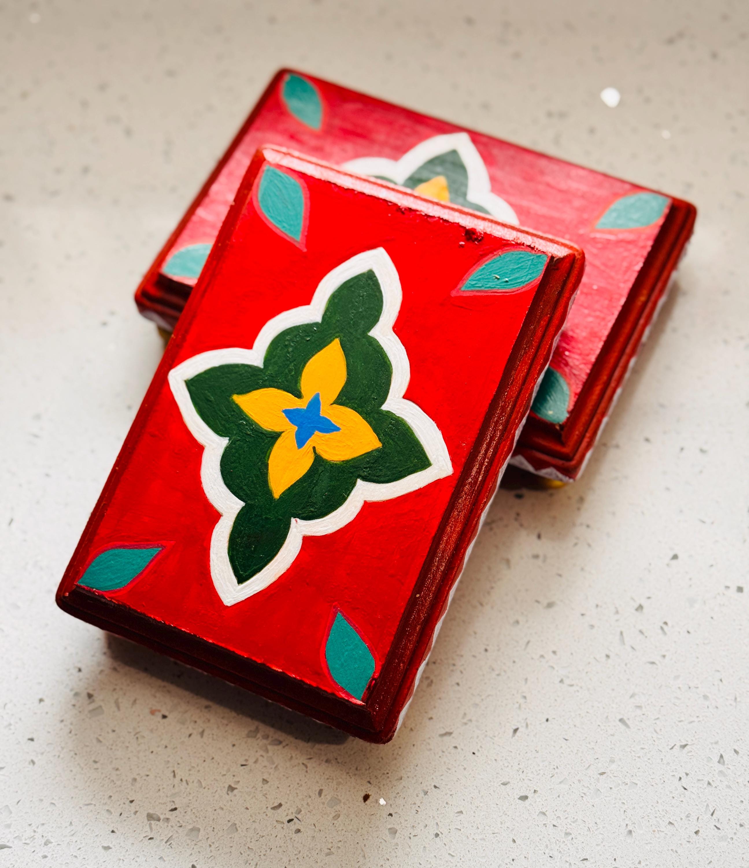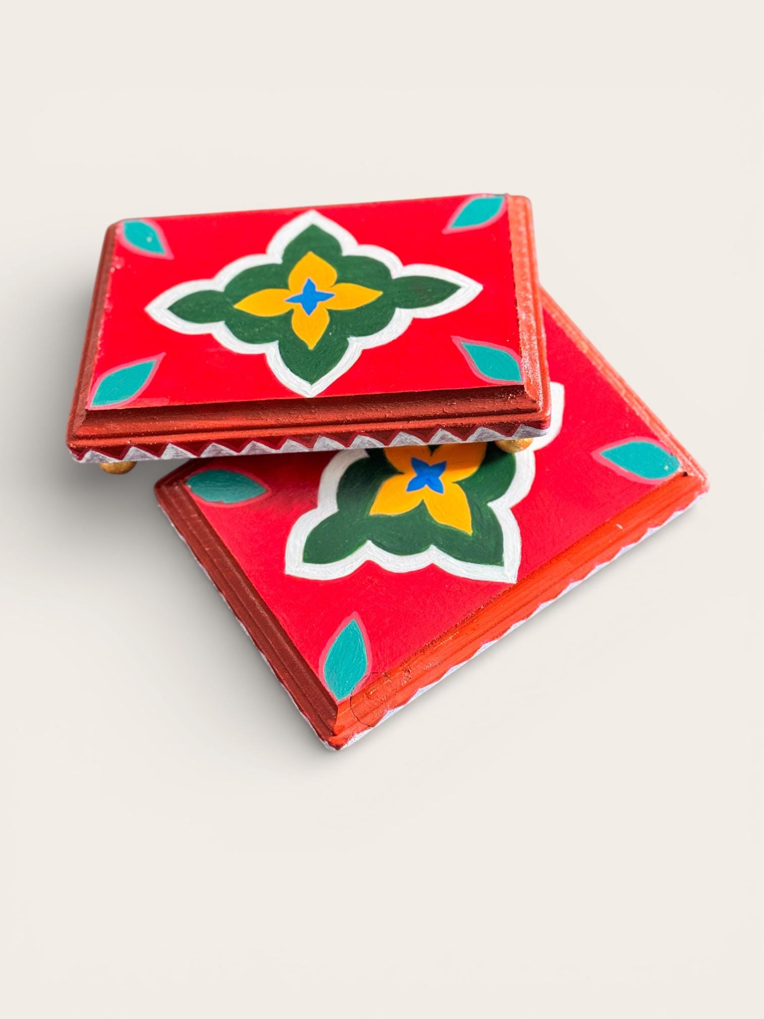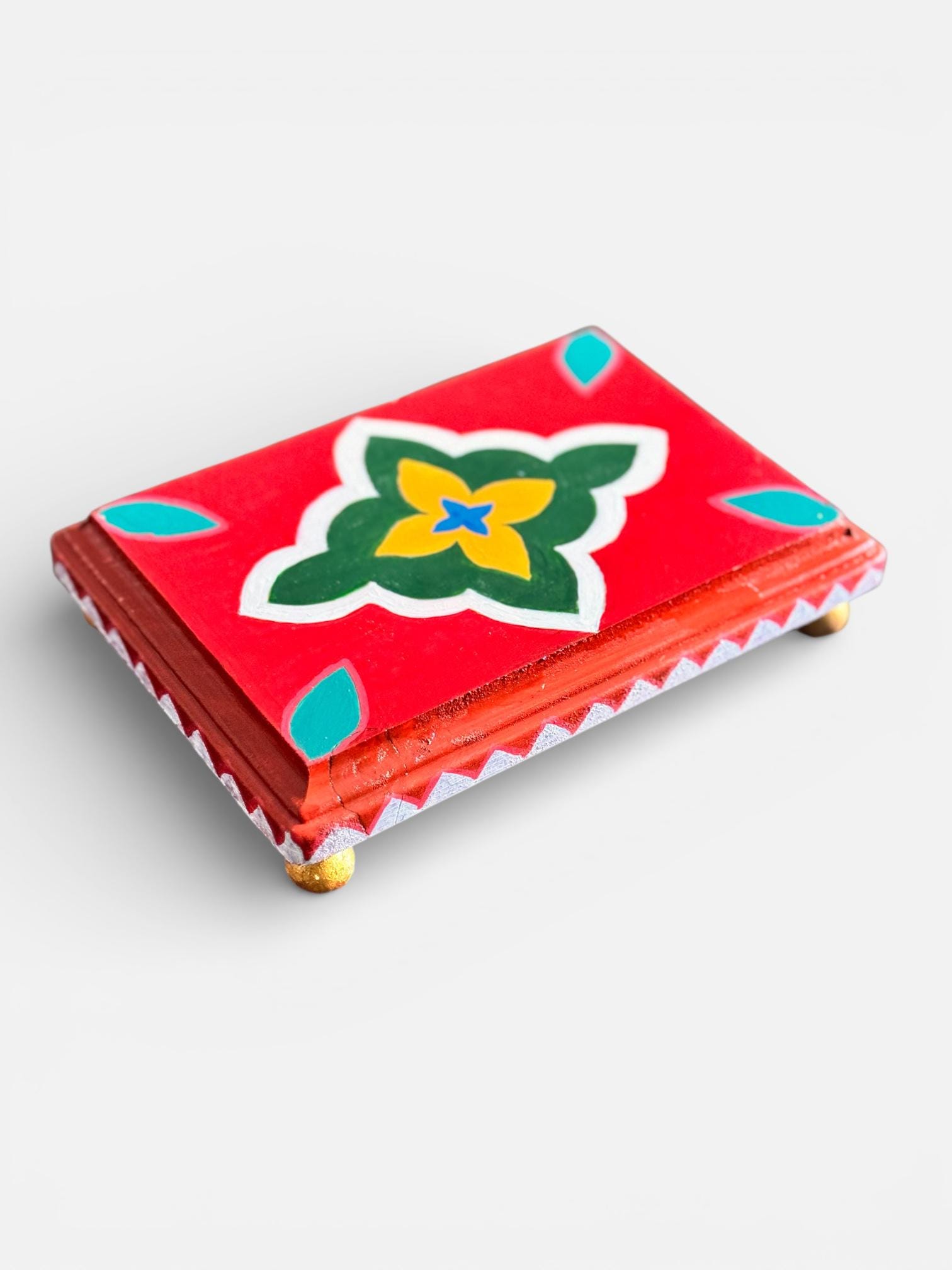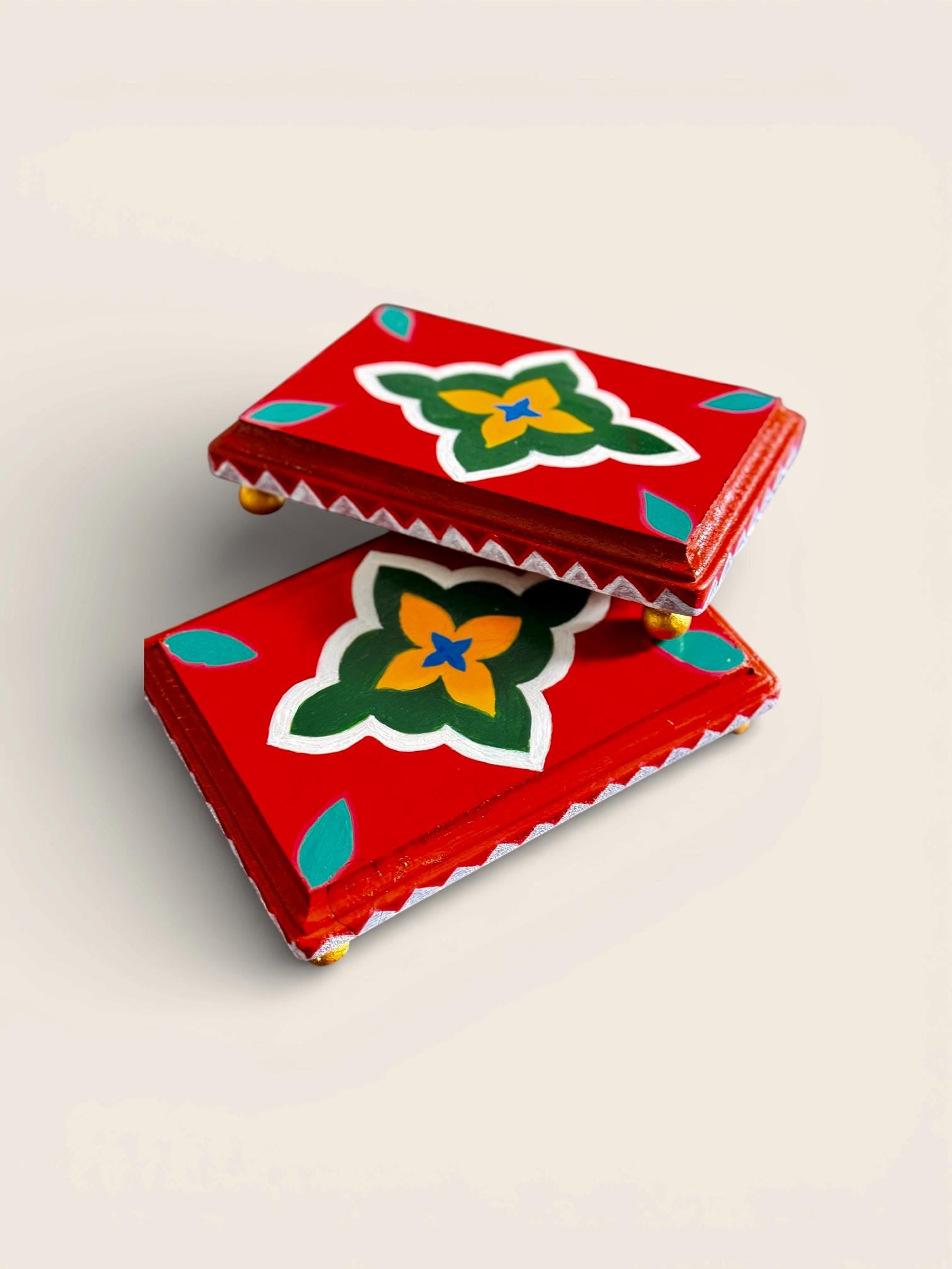 This vibrant wooden riser draws inspiration from the iconic Athangudi Chettinad tiles of Tamil Nadu, known for their bold colors, symmetry, and timeless charm. The top surface features a hand‑painted floral and geometric pattern in rich red, sunlit yellow, serene blue, and lush green, echoing the classic tile artistry that has adorned heritage homes for generations.