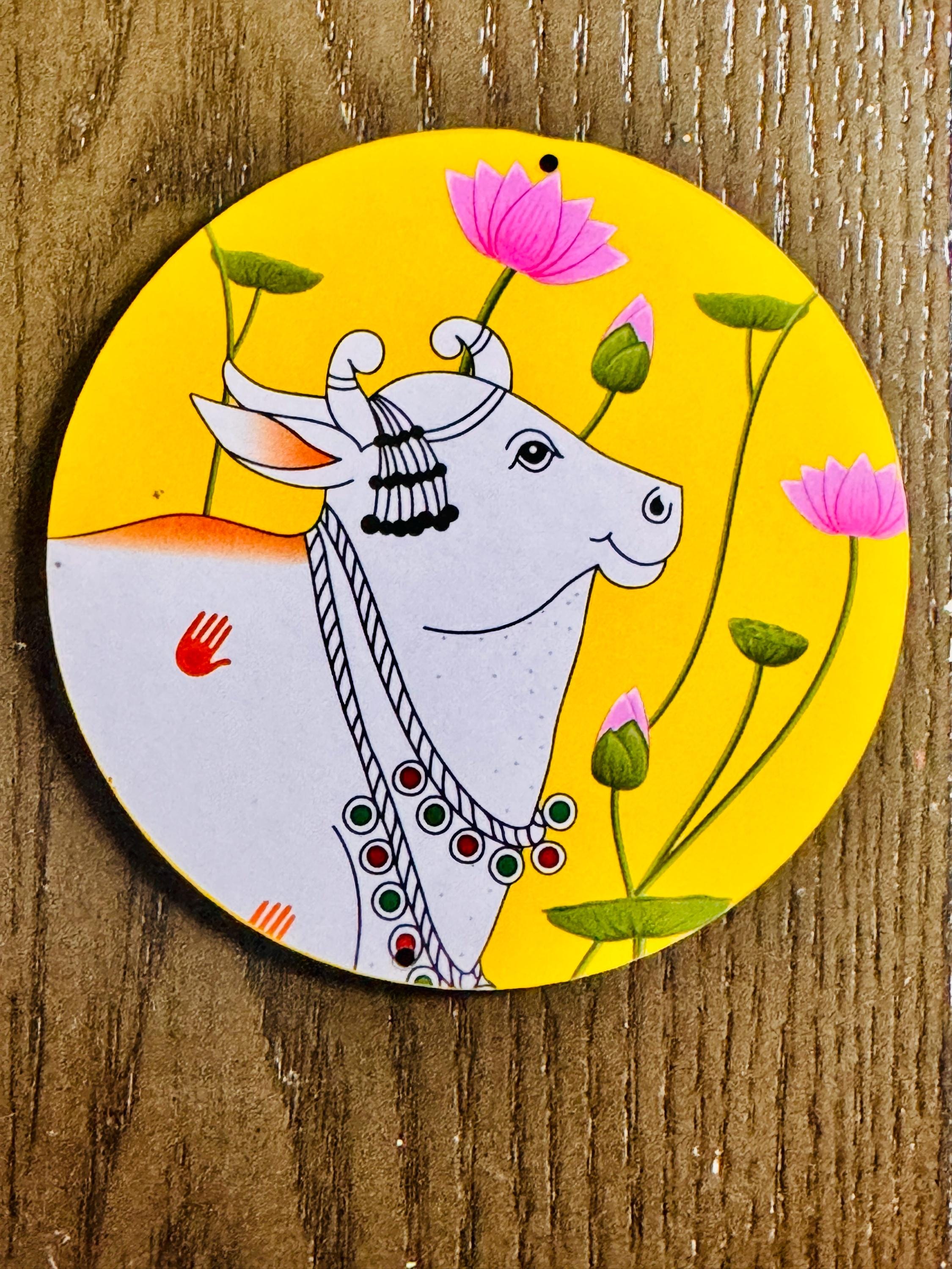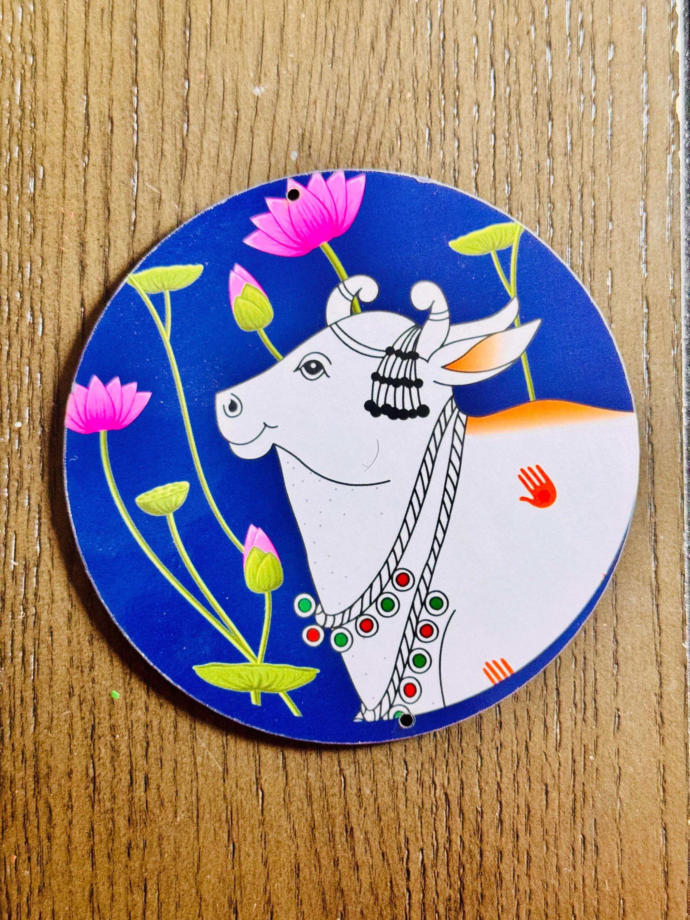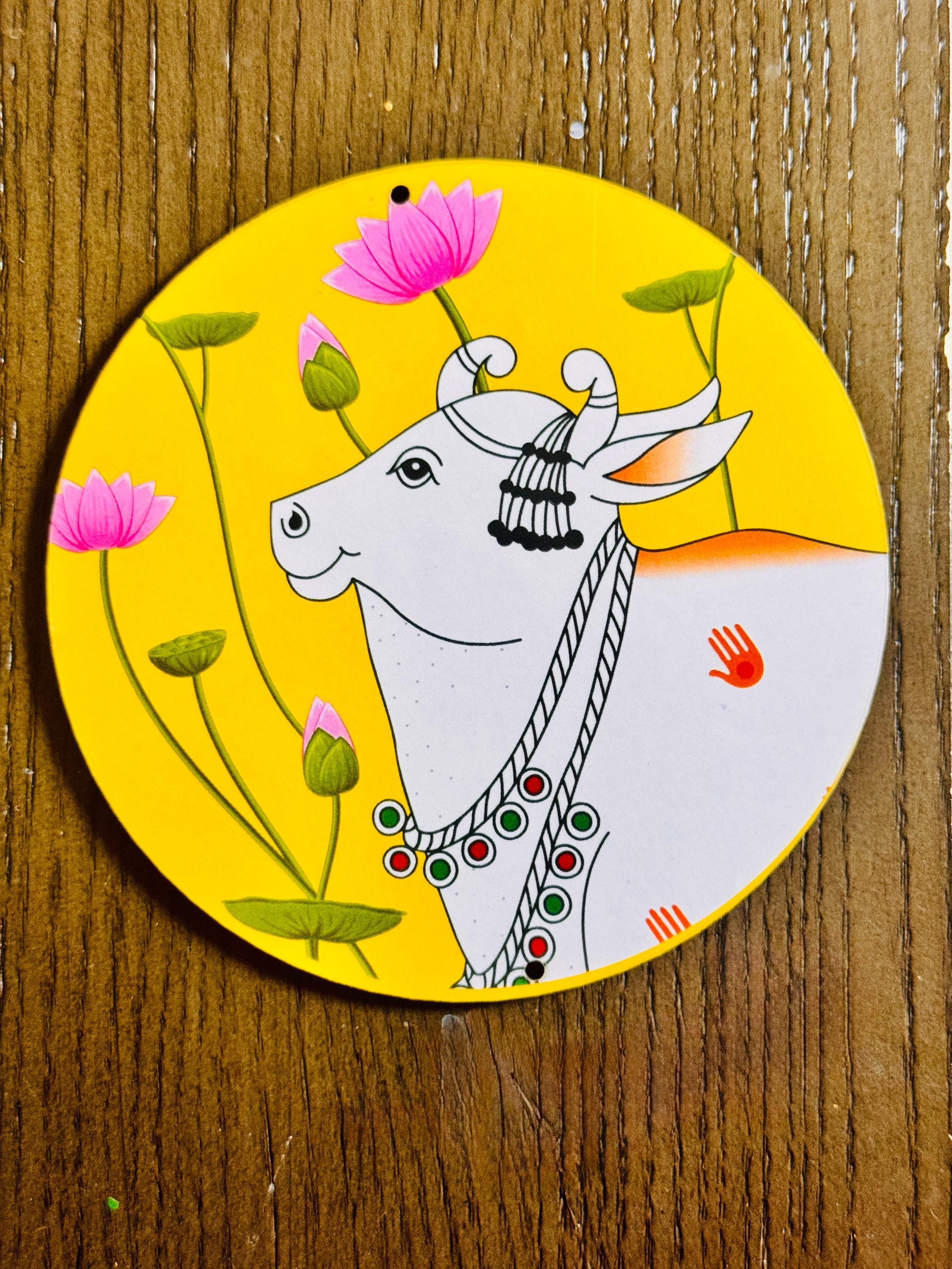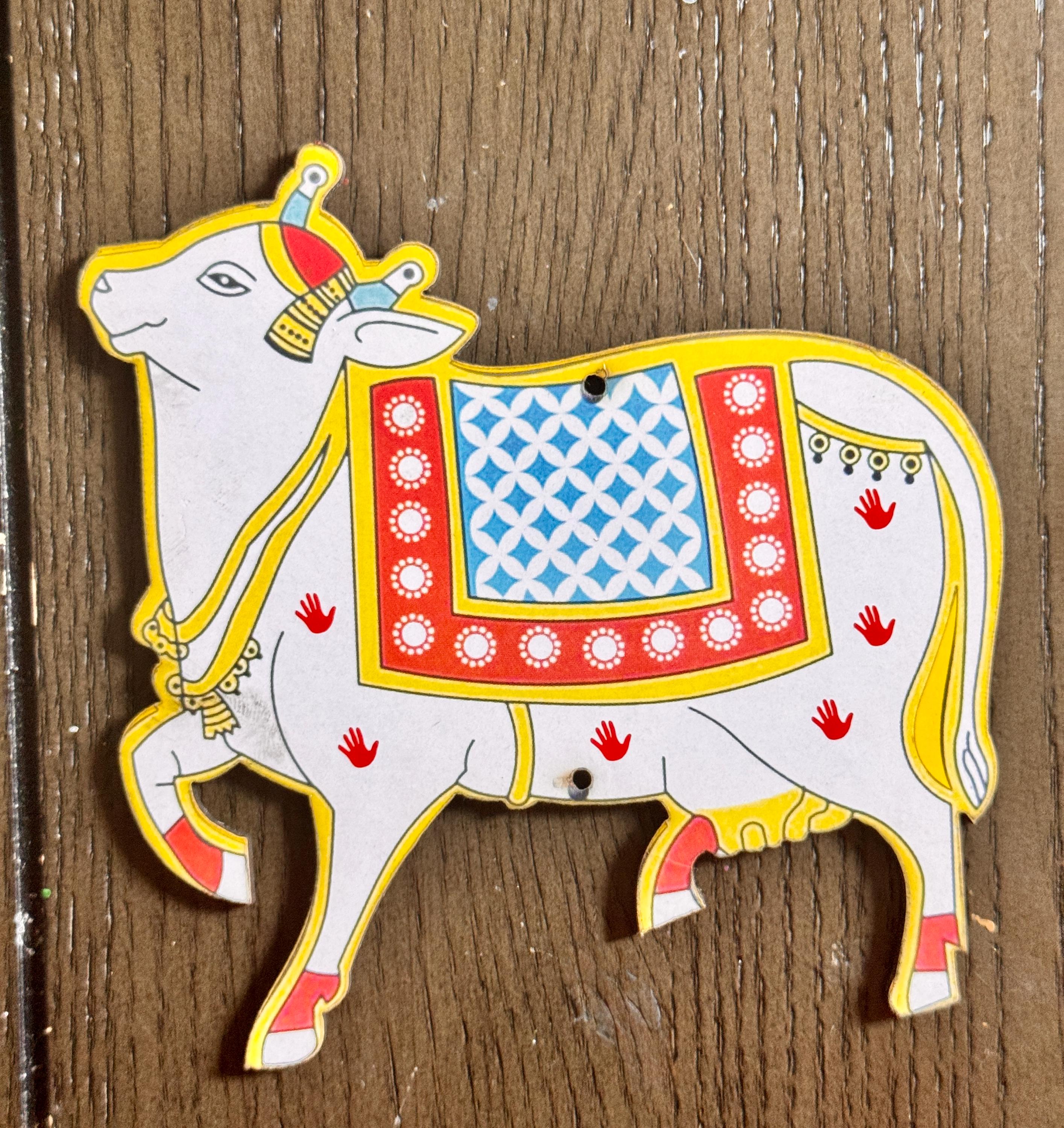 This exquisite pre‑marked MDF cutout showcases a captivating laminated motif of Srinathji and various cow designs, bringing an aura of sophistication, divinity, and timeless grace to any space.