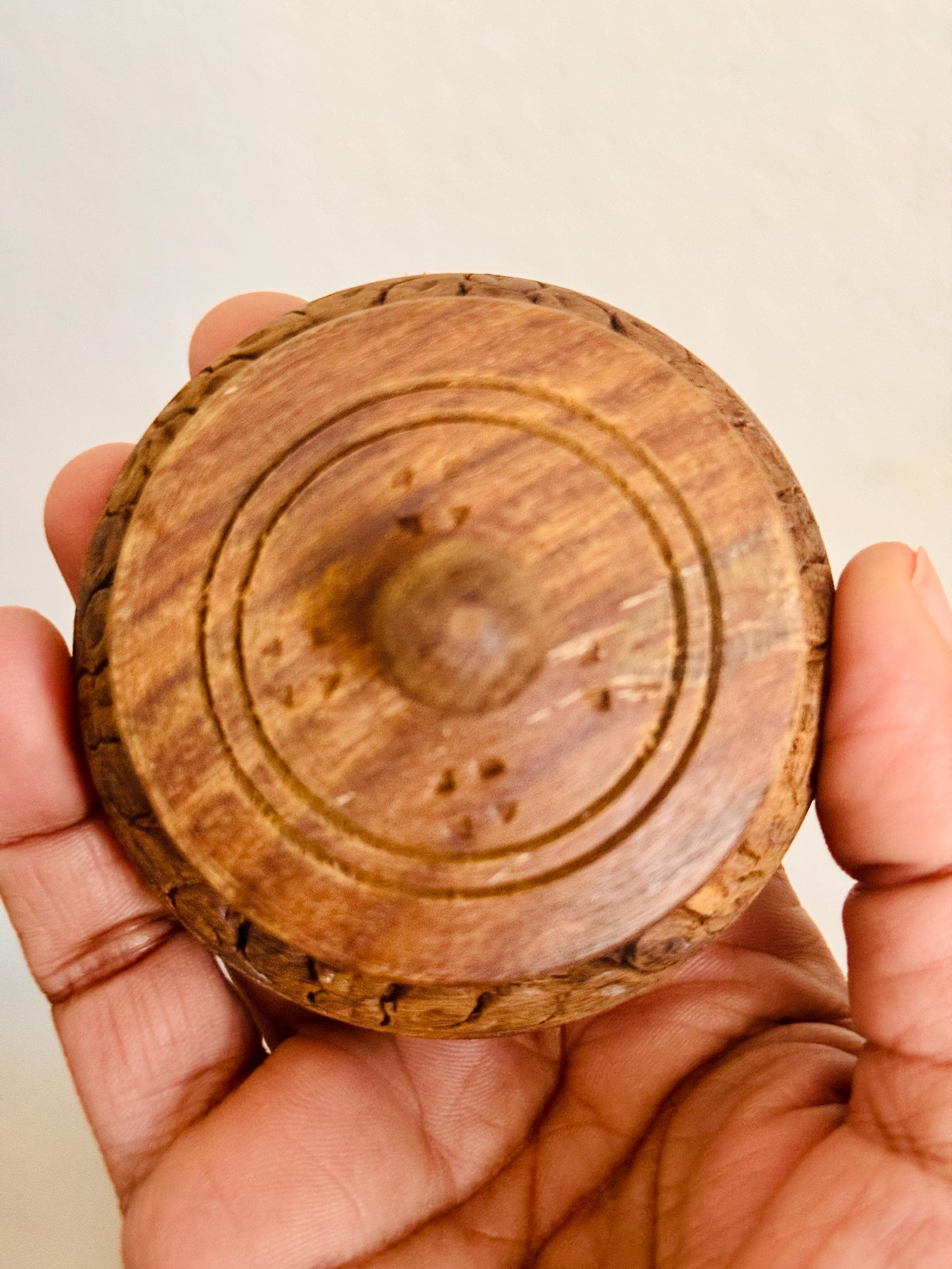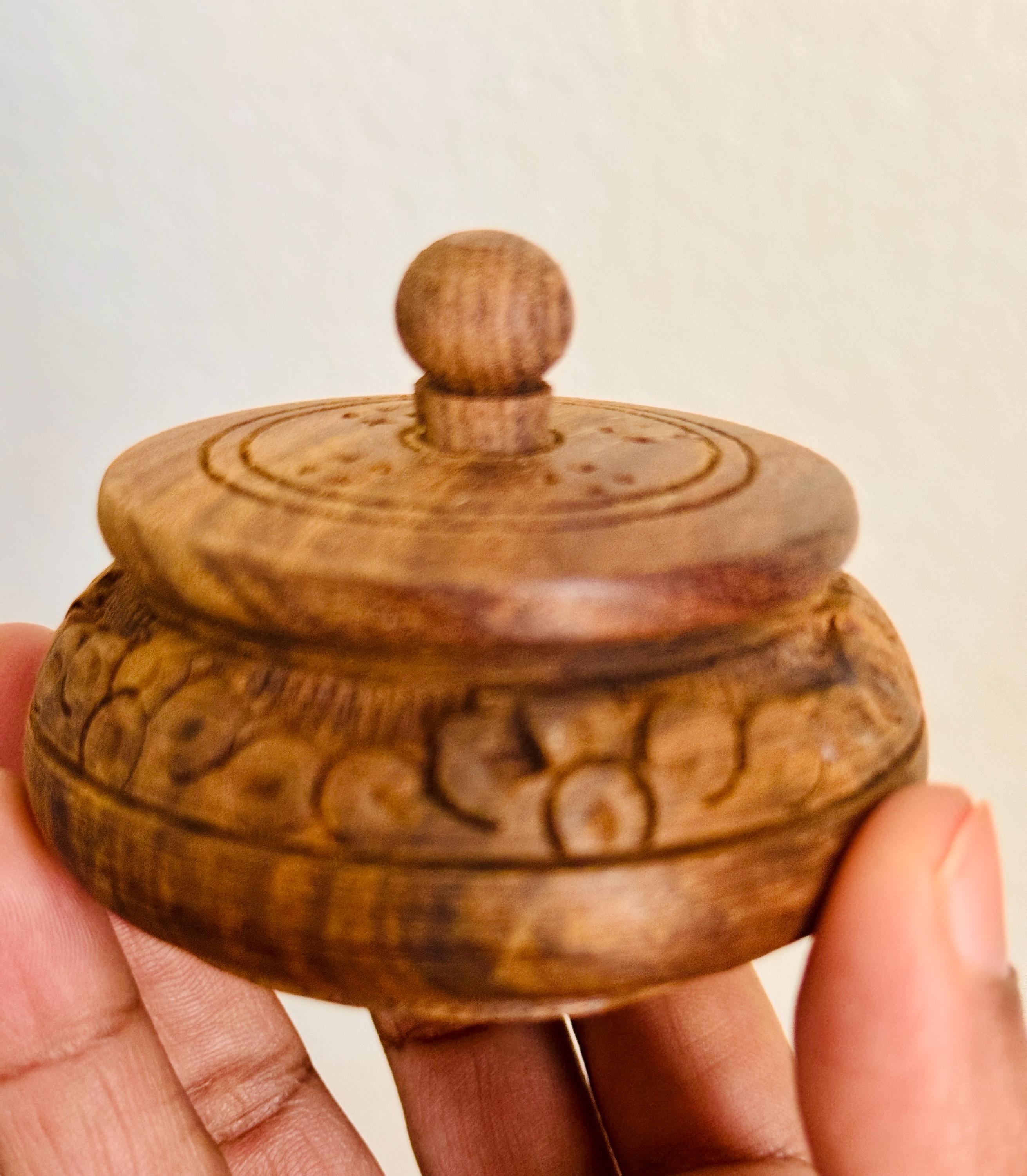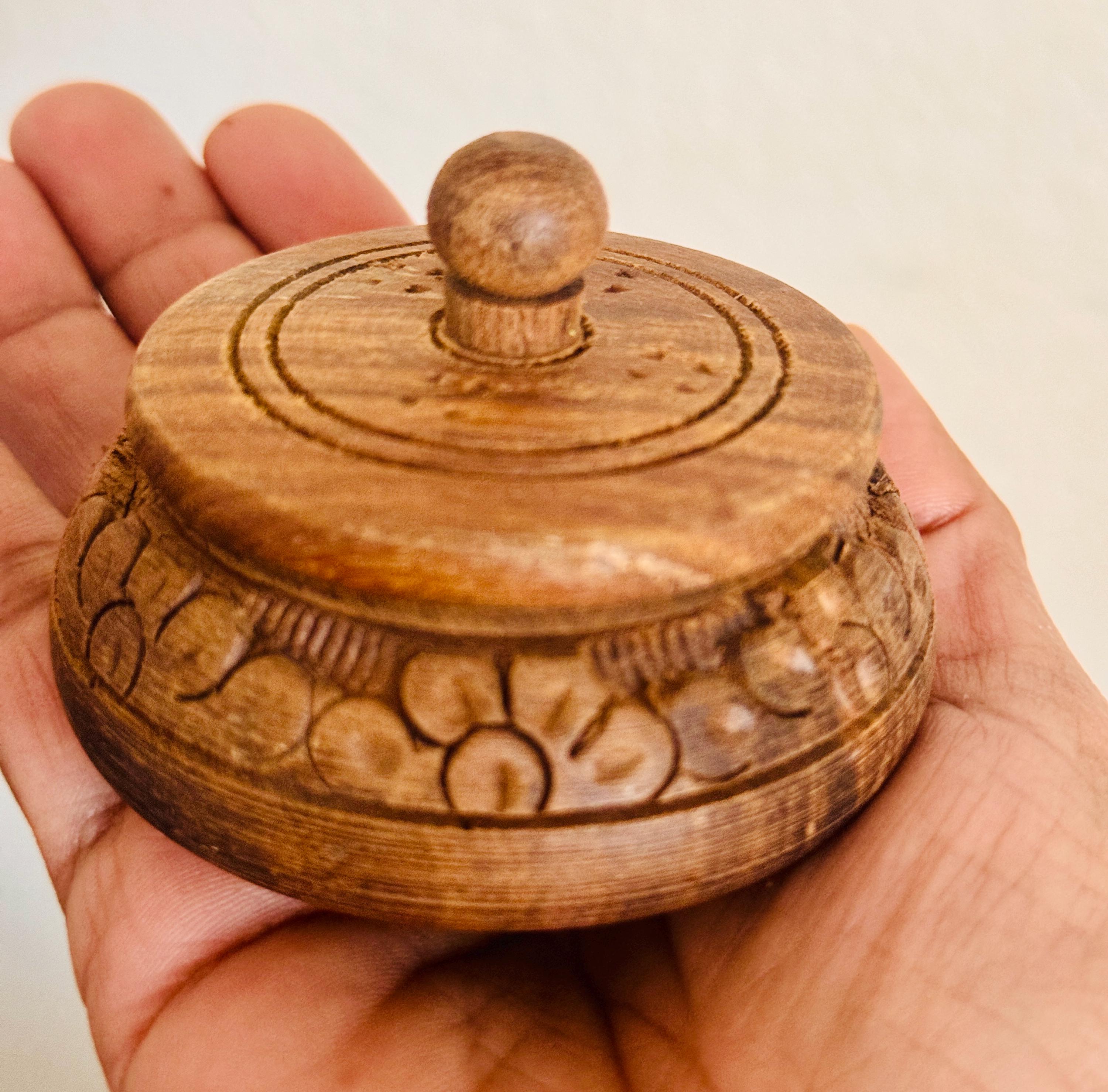 Perfect for storing tiny treasures — rings, spices, prayer beads, herbs, or sentimental keepsakes — this little box adds a timeless, earthy elegance to shelves, altars, desks, and gift sets. Its compact size makes it a thoughtful, meaningful gift for anyone who appreciates artisanal woodwork and heritage‑inspired décor. Also used for storing haldi/kukmum or as return gifts for puja/prayer or special occasions.