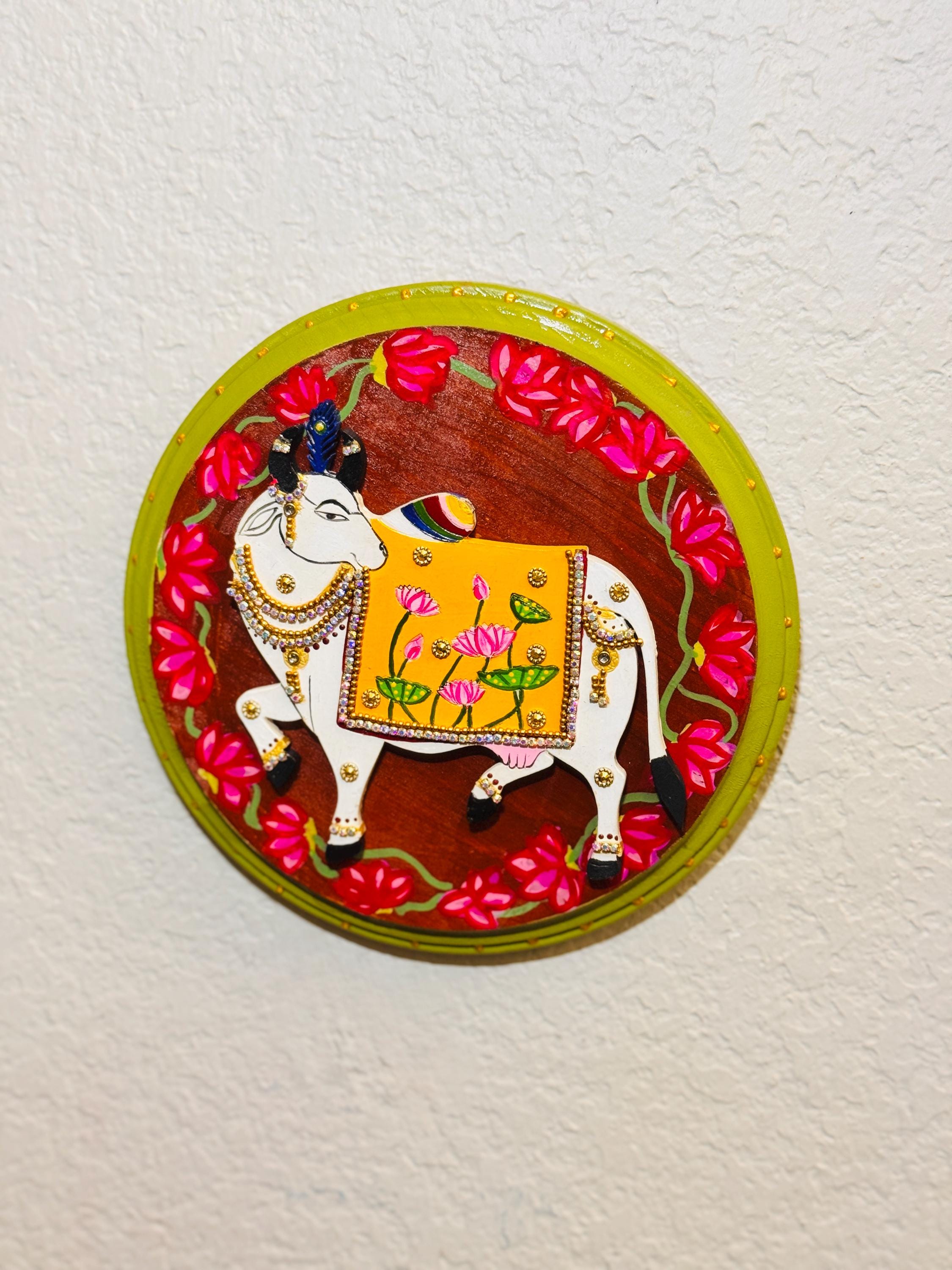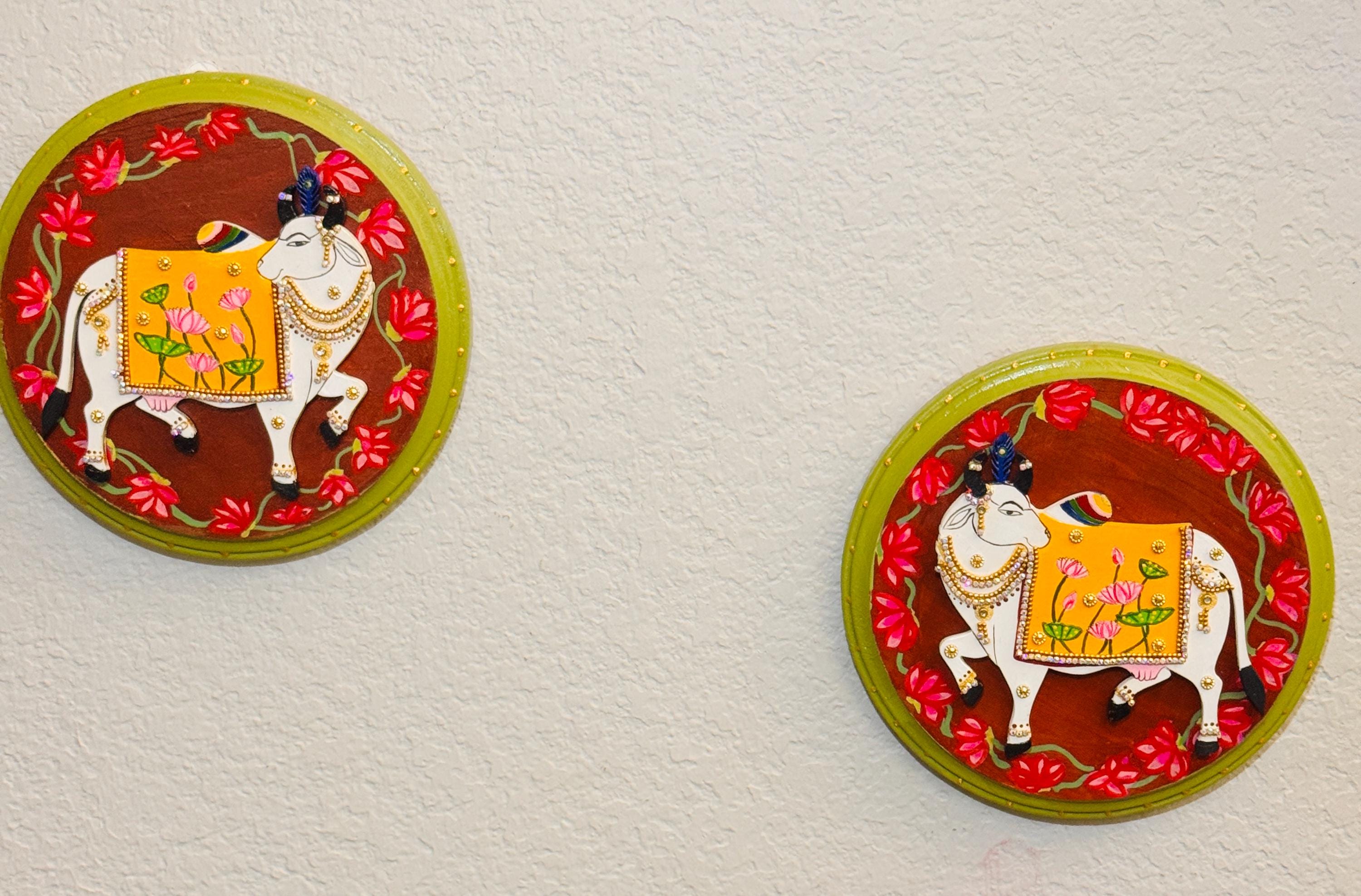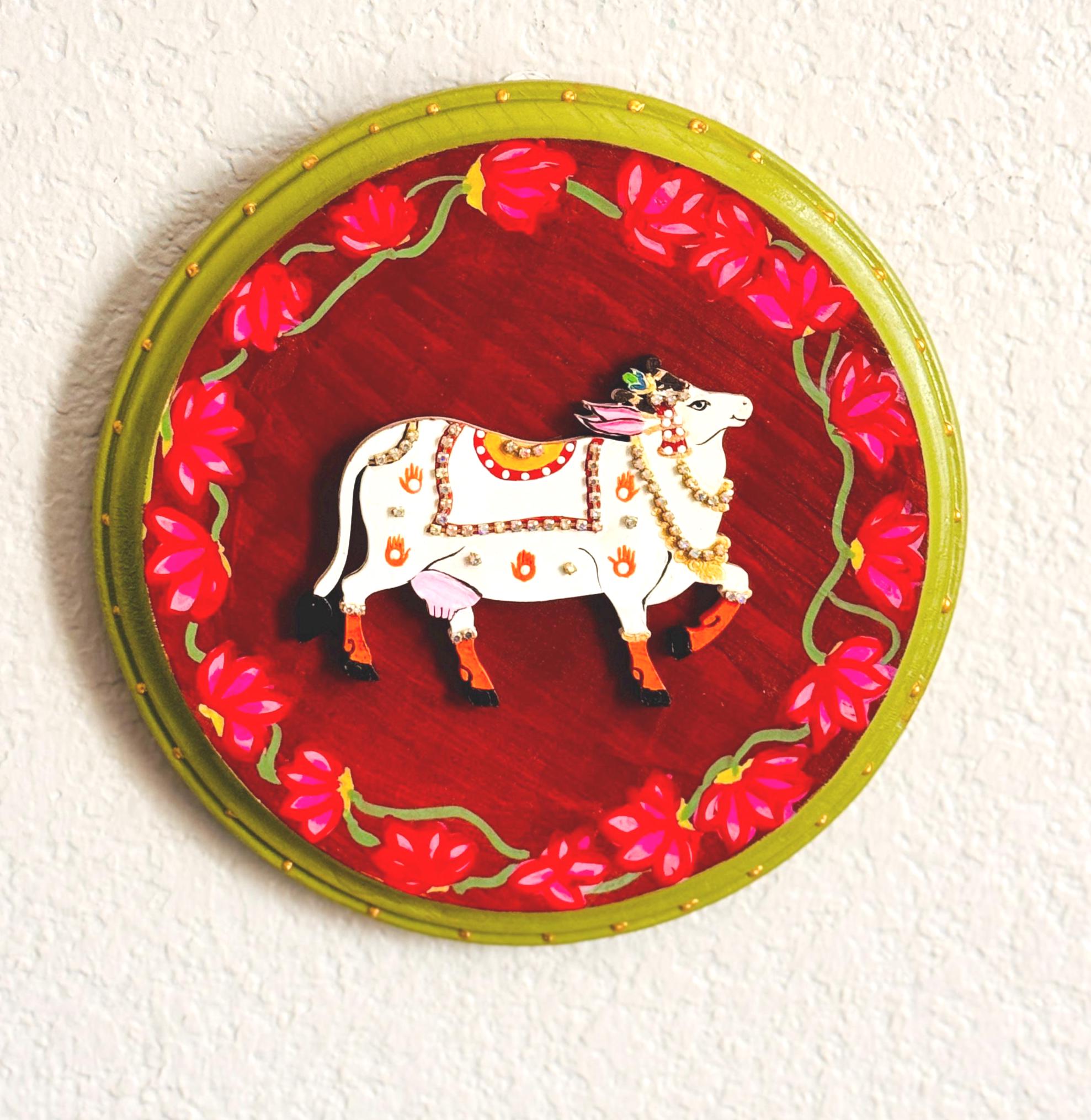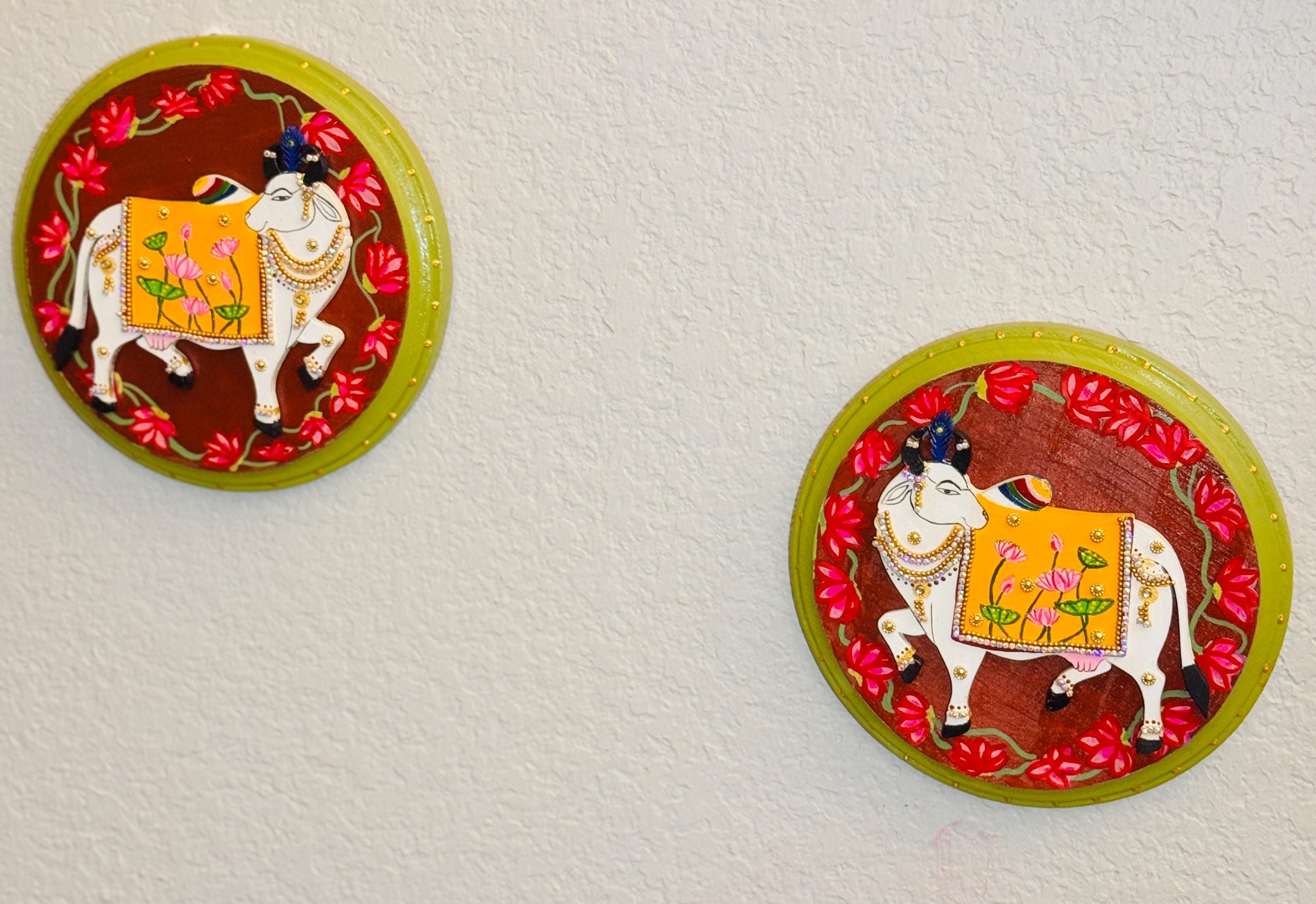 The pichwai cows are handcrafted and mounted on a round wooden plaque, it carries the warmth of old-world craftsmanship and the gentle promise of prosperity. A soulful addition to any home that cherishes tradition and beauty.
