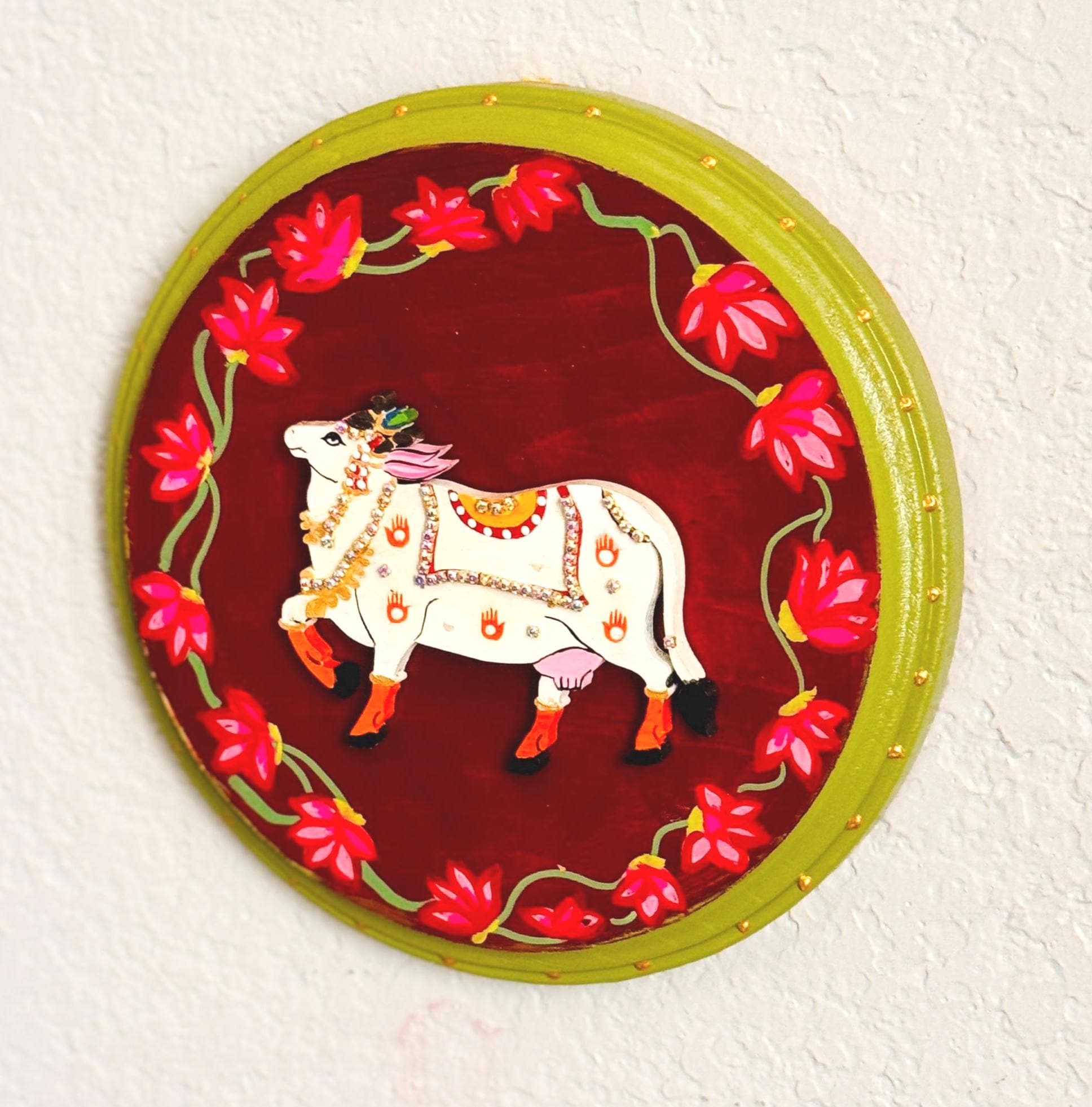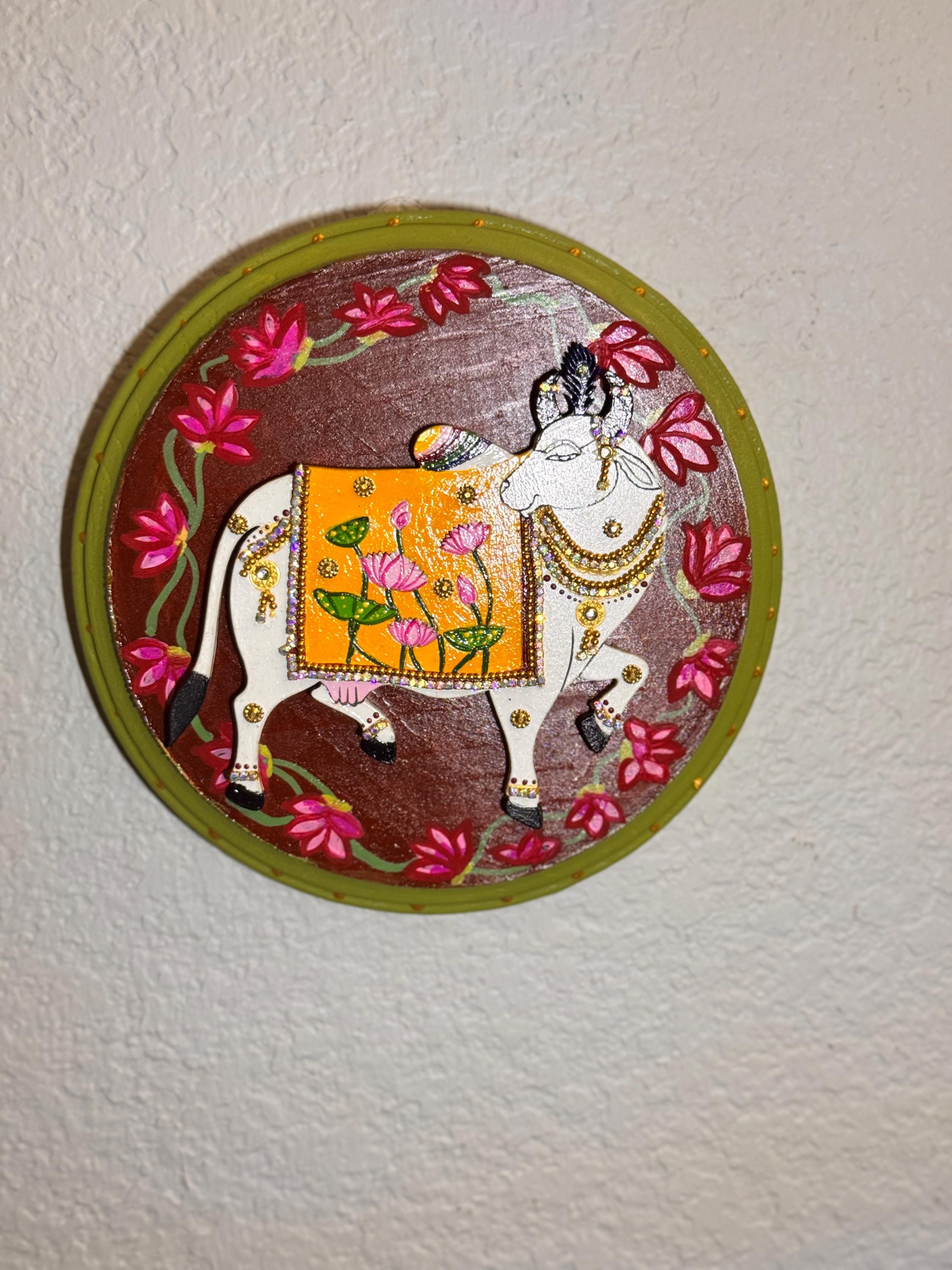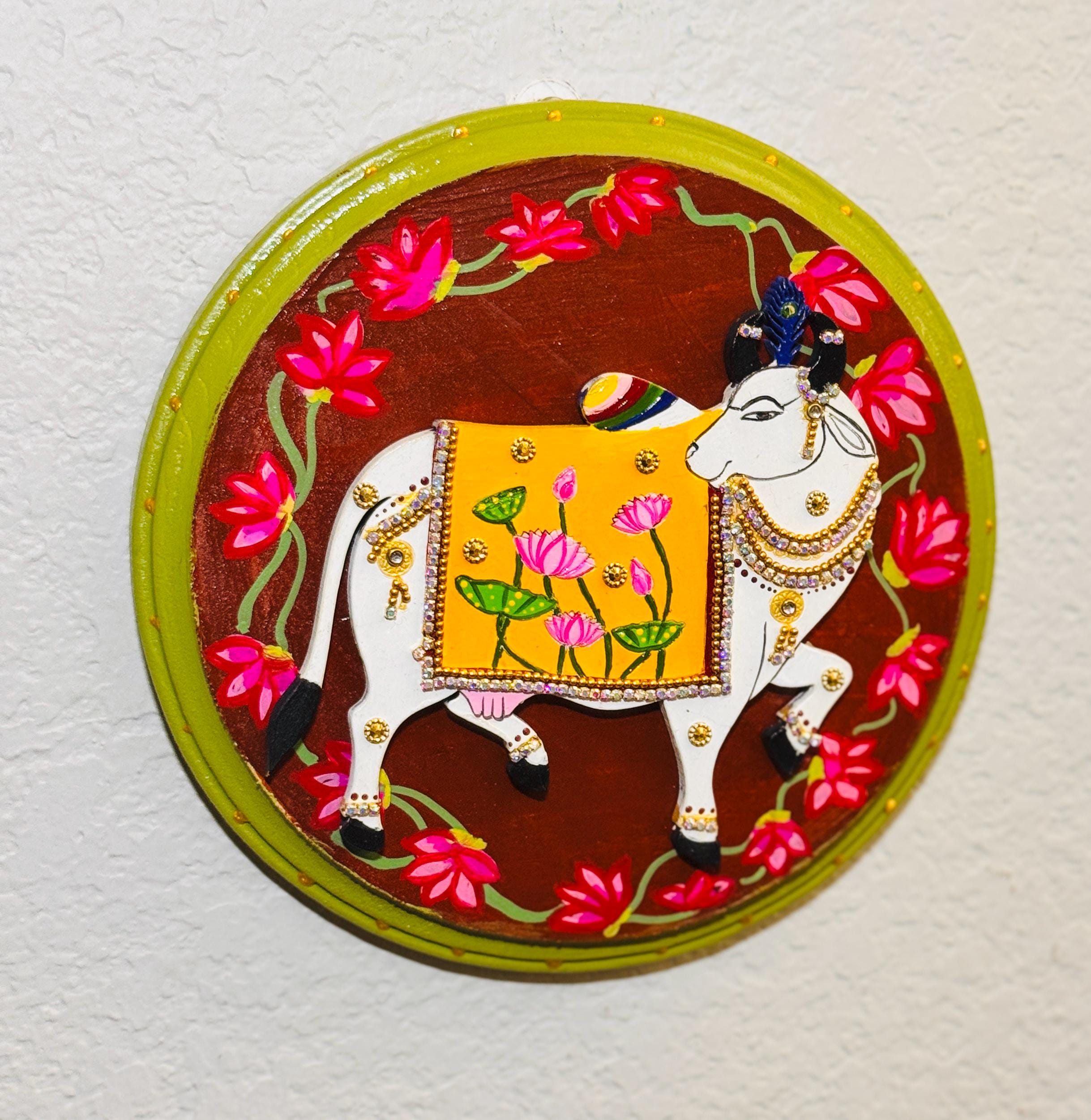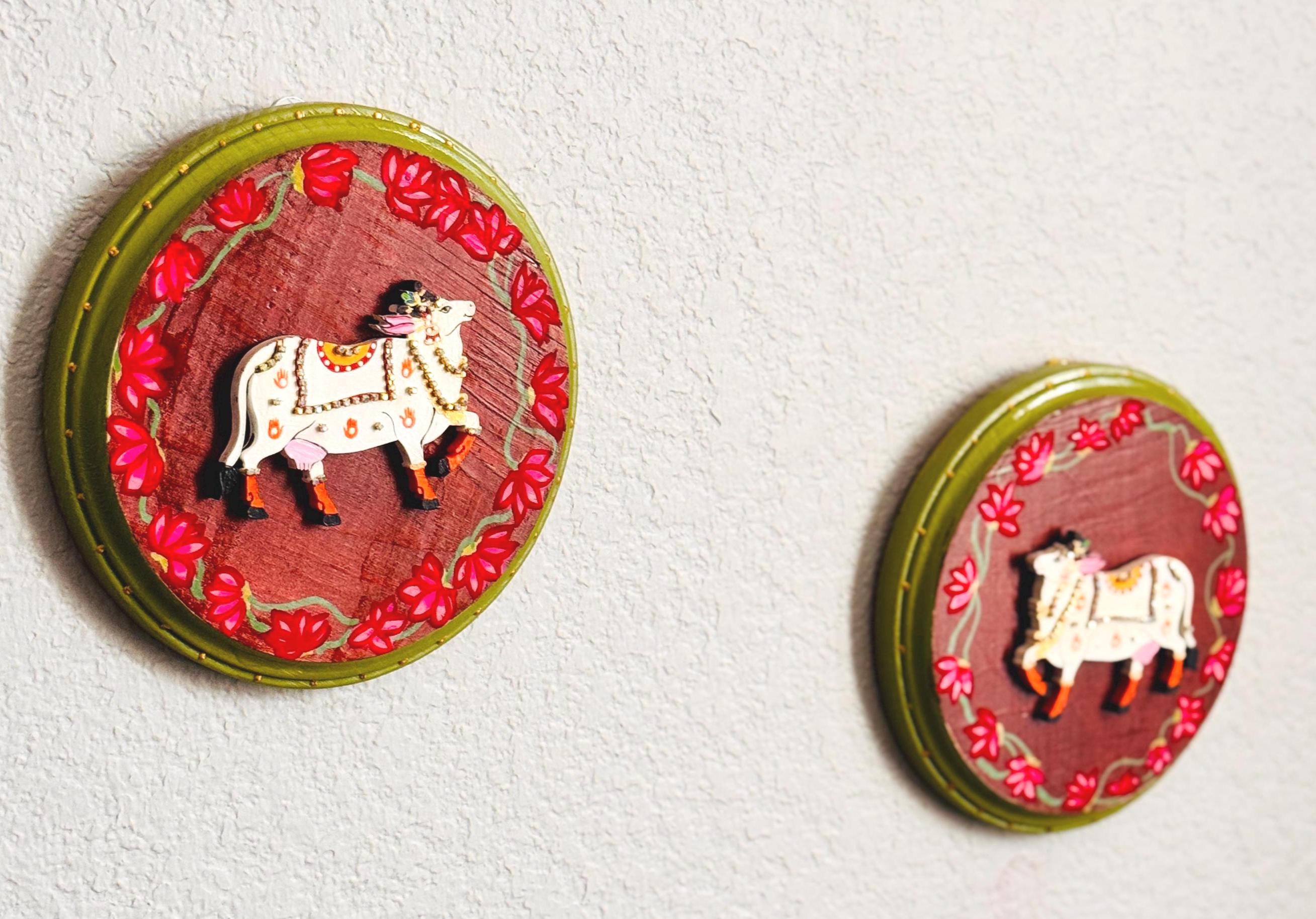 The pichwai cows are handcrafted and mounted on a round wooden plaque, it carries the warmth of old-world craftsmanship and the gentle promise of prosperity. A soulful addition to any home that cherishes tradition and beauty.