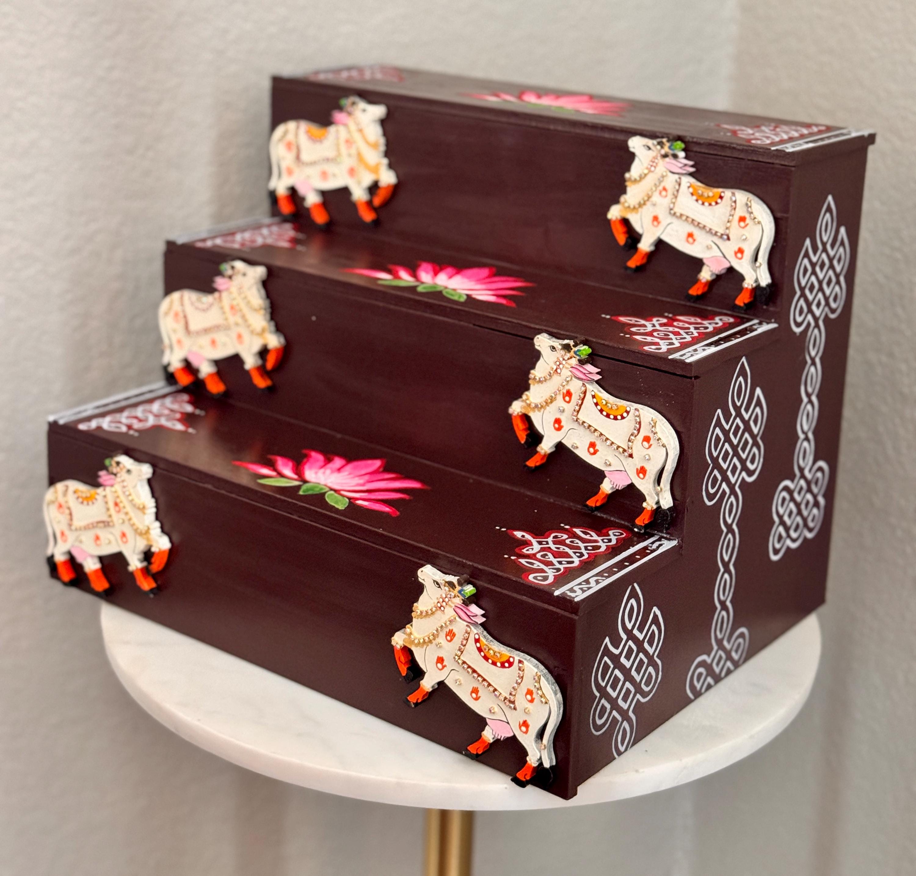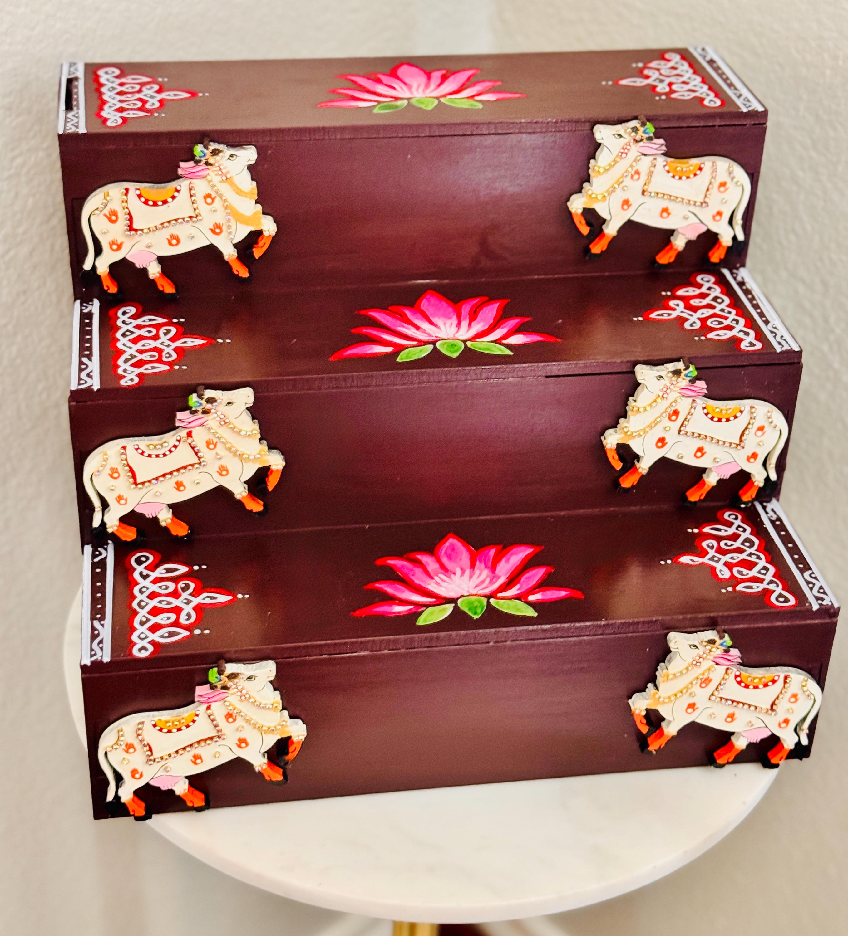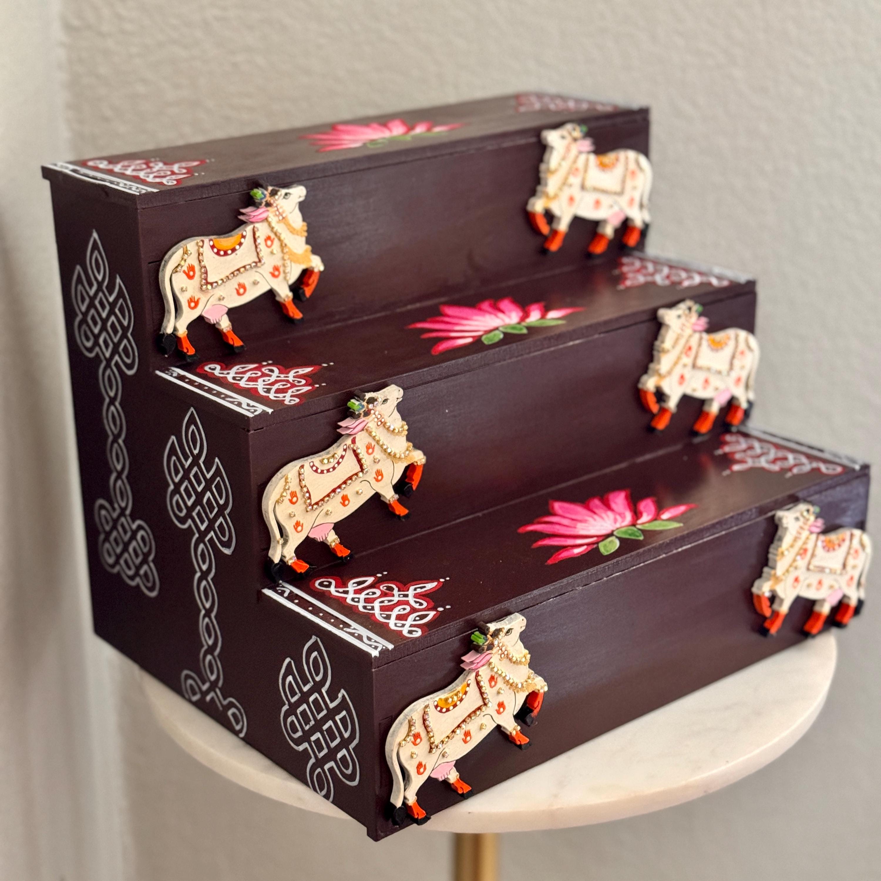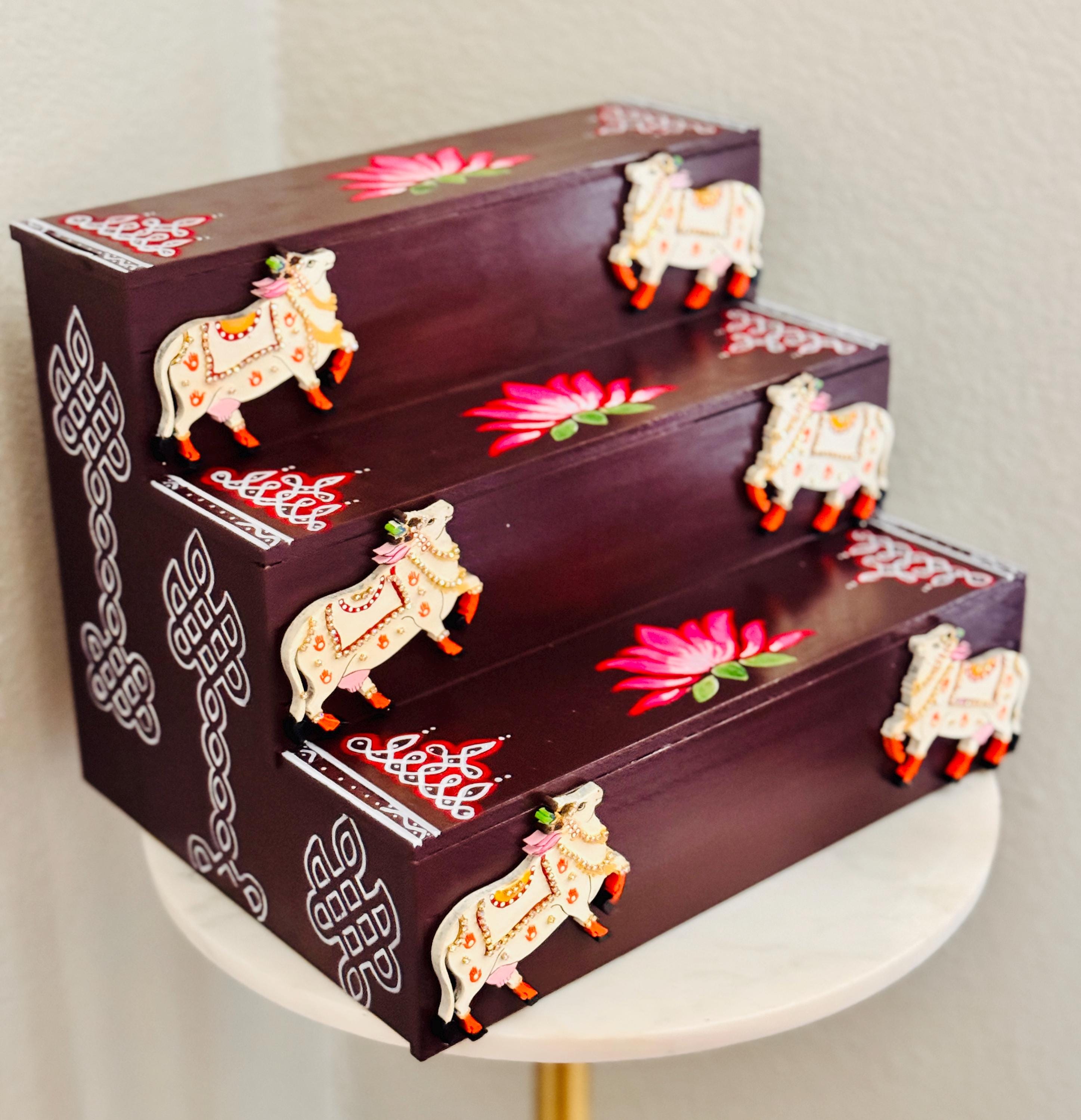 The beautiful brown color gives the piece a nostalgic, personal warmth, while the structure itself reimagines traditional Golu steps for the modern home: compact, sturdy, dismantlable and designed to stay out year‑round as a permanent stage for your mini brass idols and figurines!
