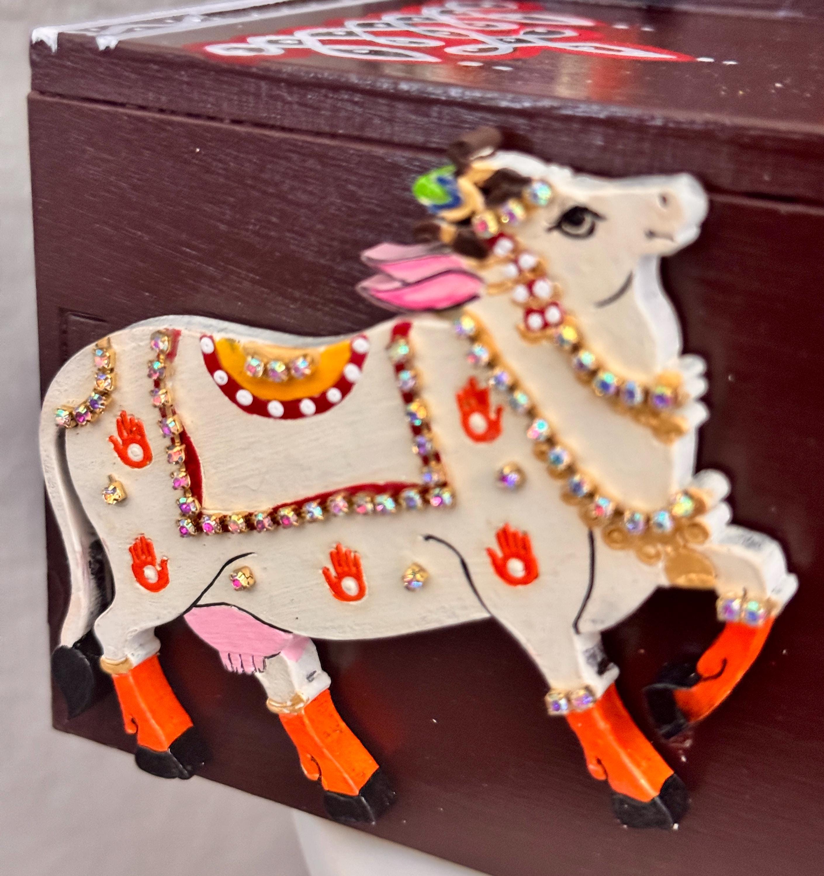 Pichwai cows are handcrafted and handpainted individually to bring the 3D effect and enhance the beauty of the shelf.