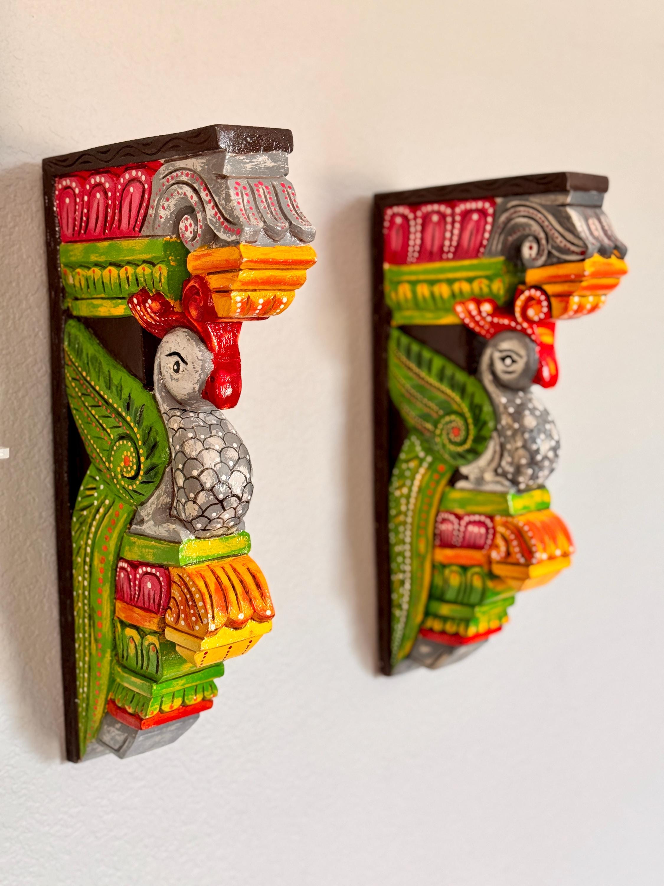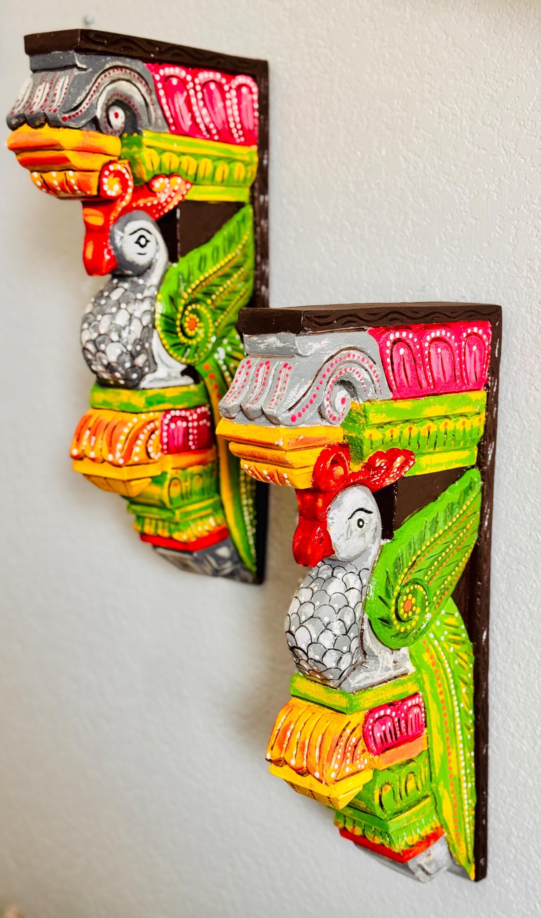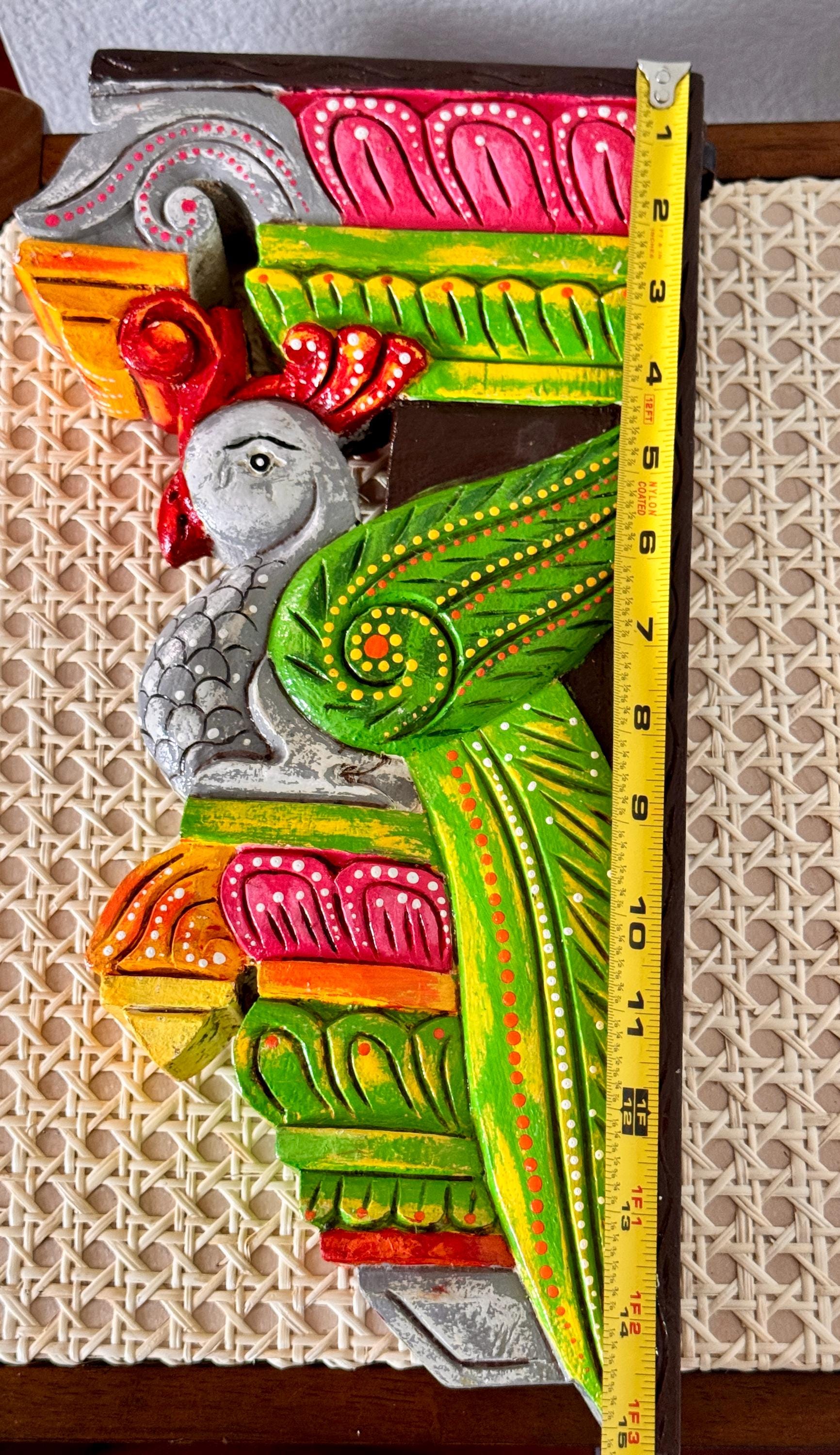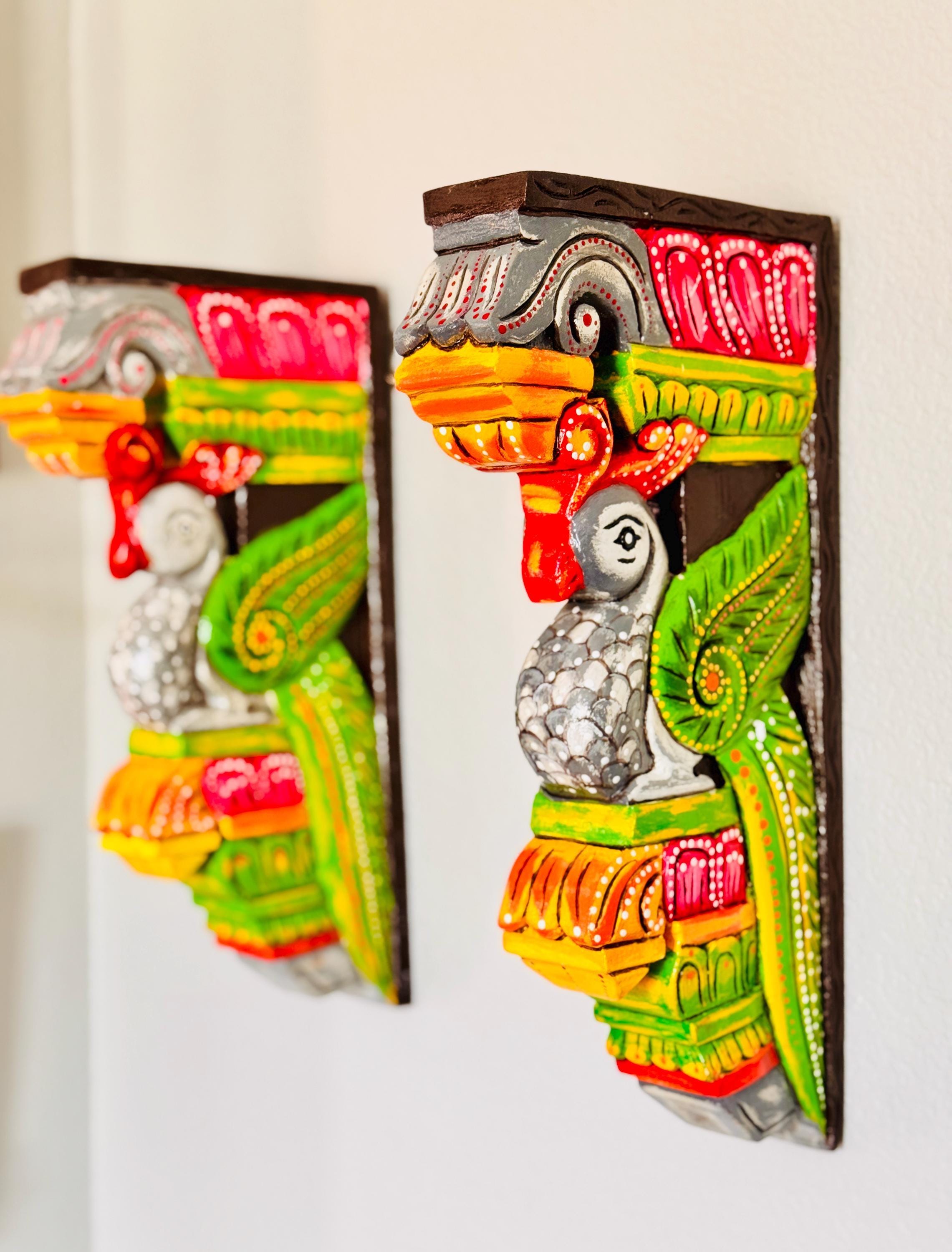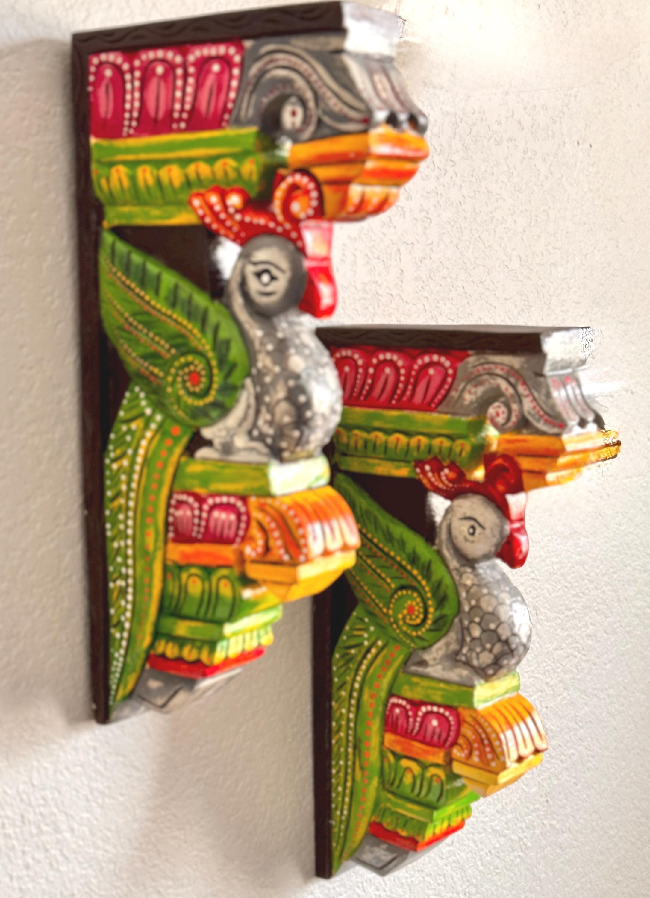 This exquisite wooden corbel features a majestic peacock—its feathers carved in flowing detailing, that adds a touch of charm. Inspired by traditional temple brackets, this piece blends architectural heritage with artistic grace.