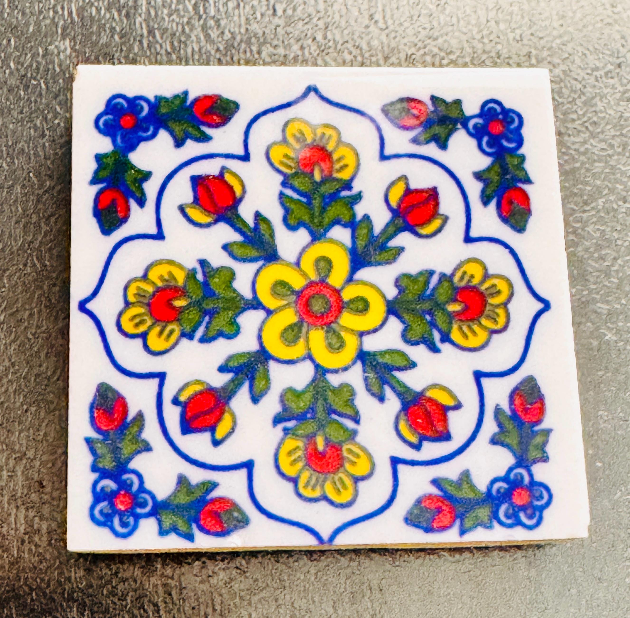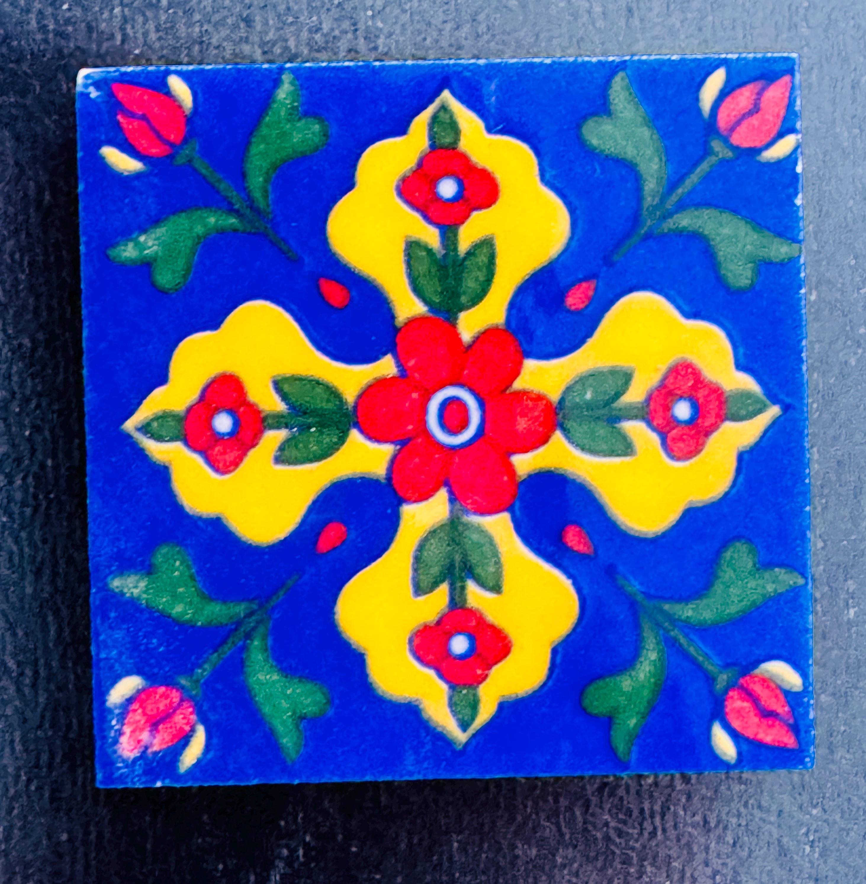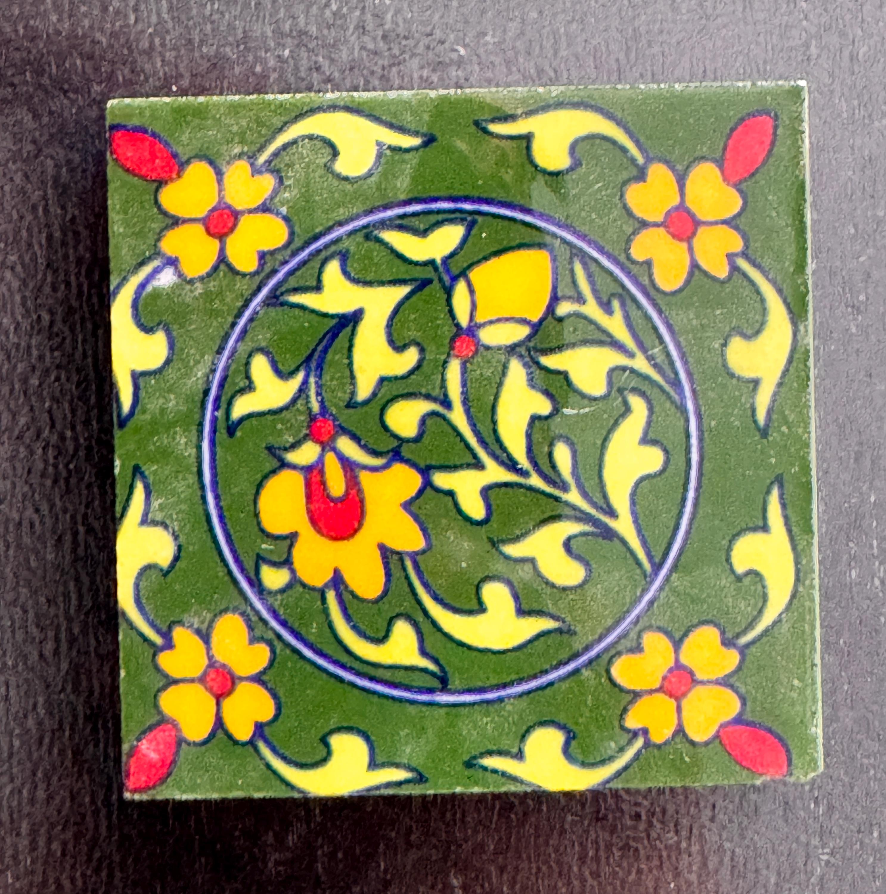 These motifs are hand‑painted on the glazed surface while the tile is rotated — a technique that gives the artwork its fluid, graceful look.