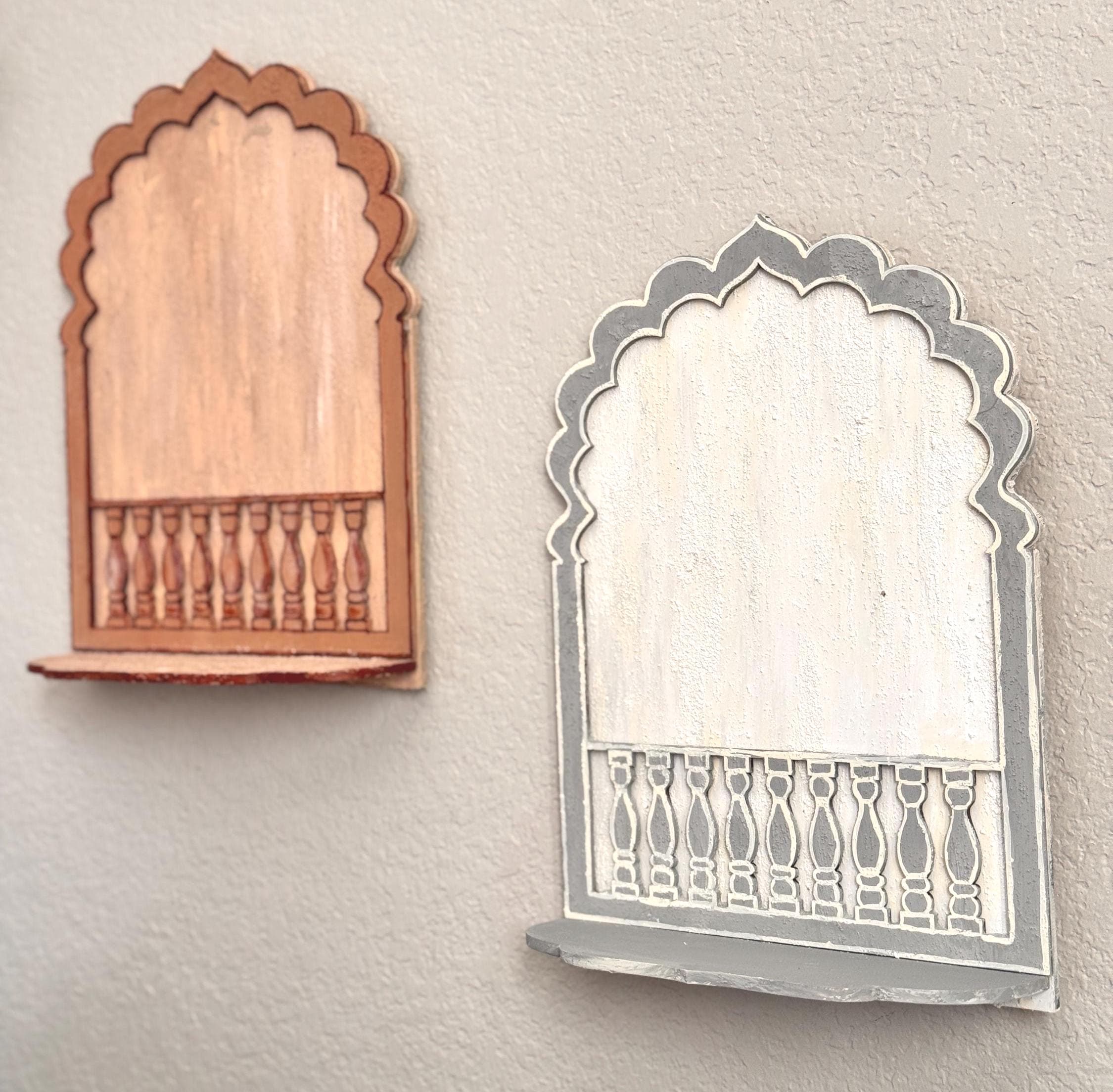 A beautiful, textured and distressed finish wall display for showcasing artefacts, collectibles and more! Perfect for those who love handcrafted finish in wood shelves/traditional patterns. Hand crafted and hand painted to mimic natural walls with a distressed and textured finish in warm undertones to complement your decor.